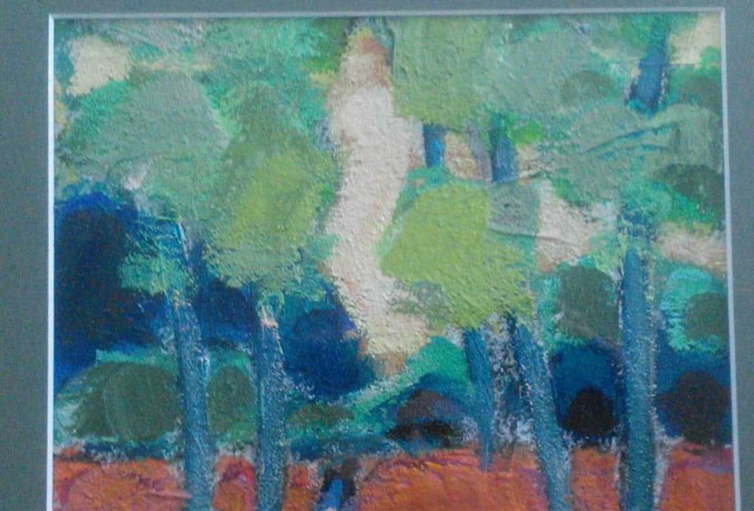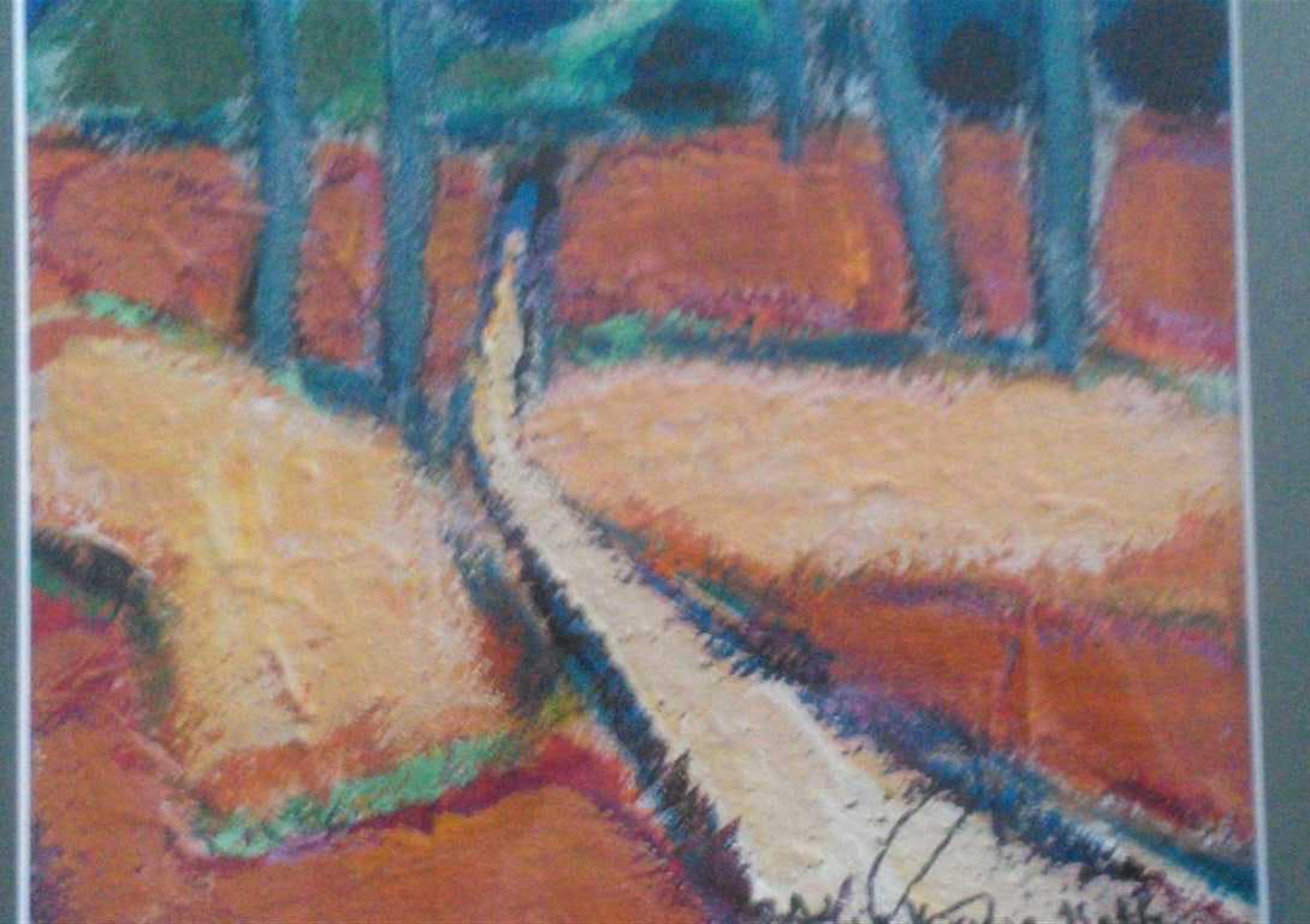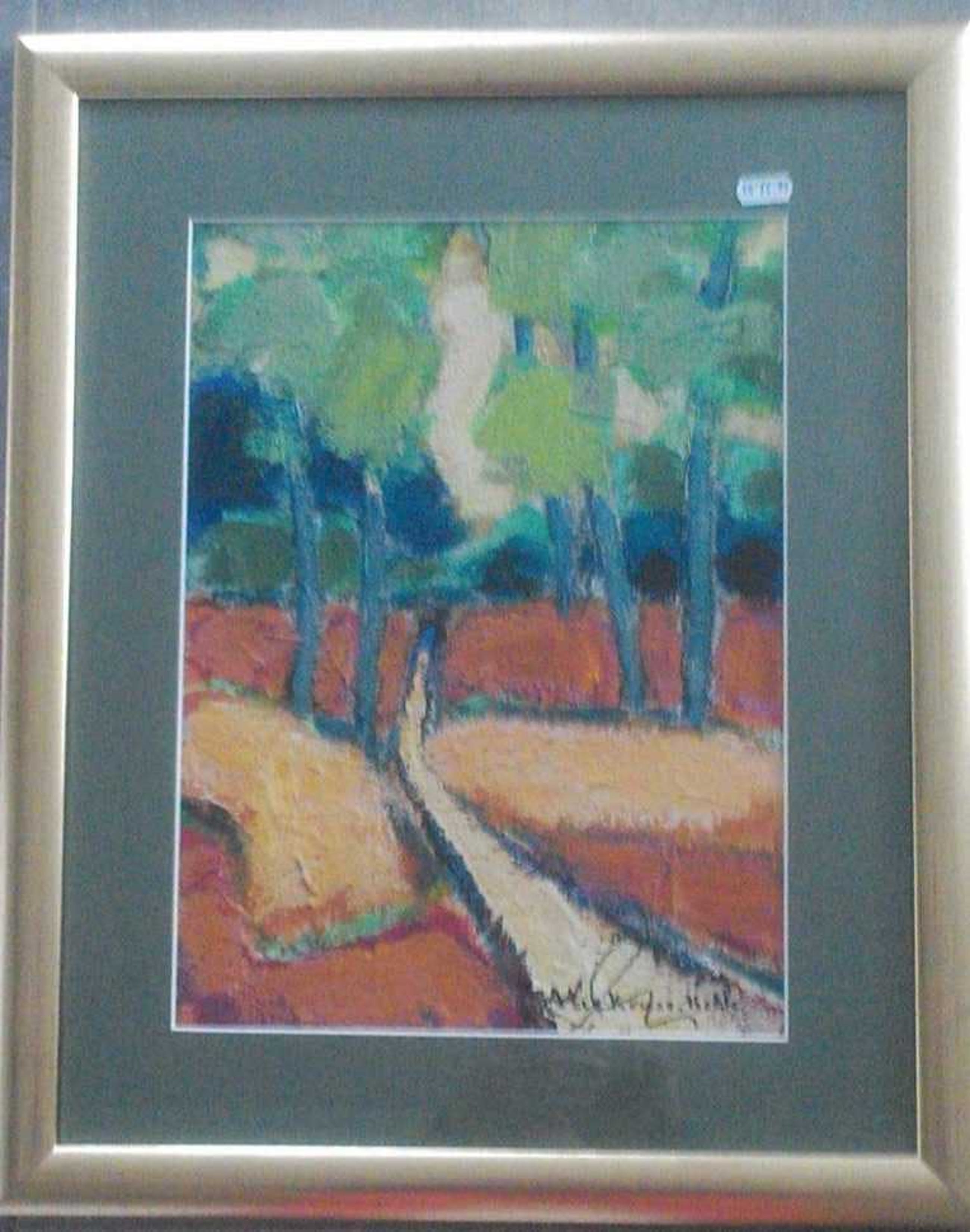In goudkleurige lijst met donker passe-partout een kleurrijk schilderij van een bospad met het frisse groen en de aardse ondergrond