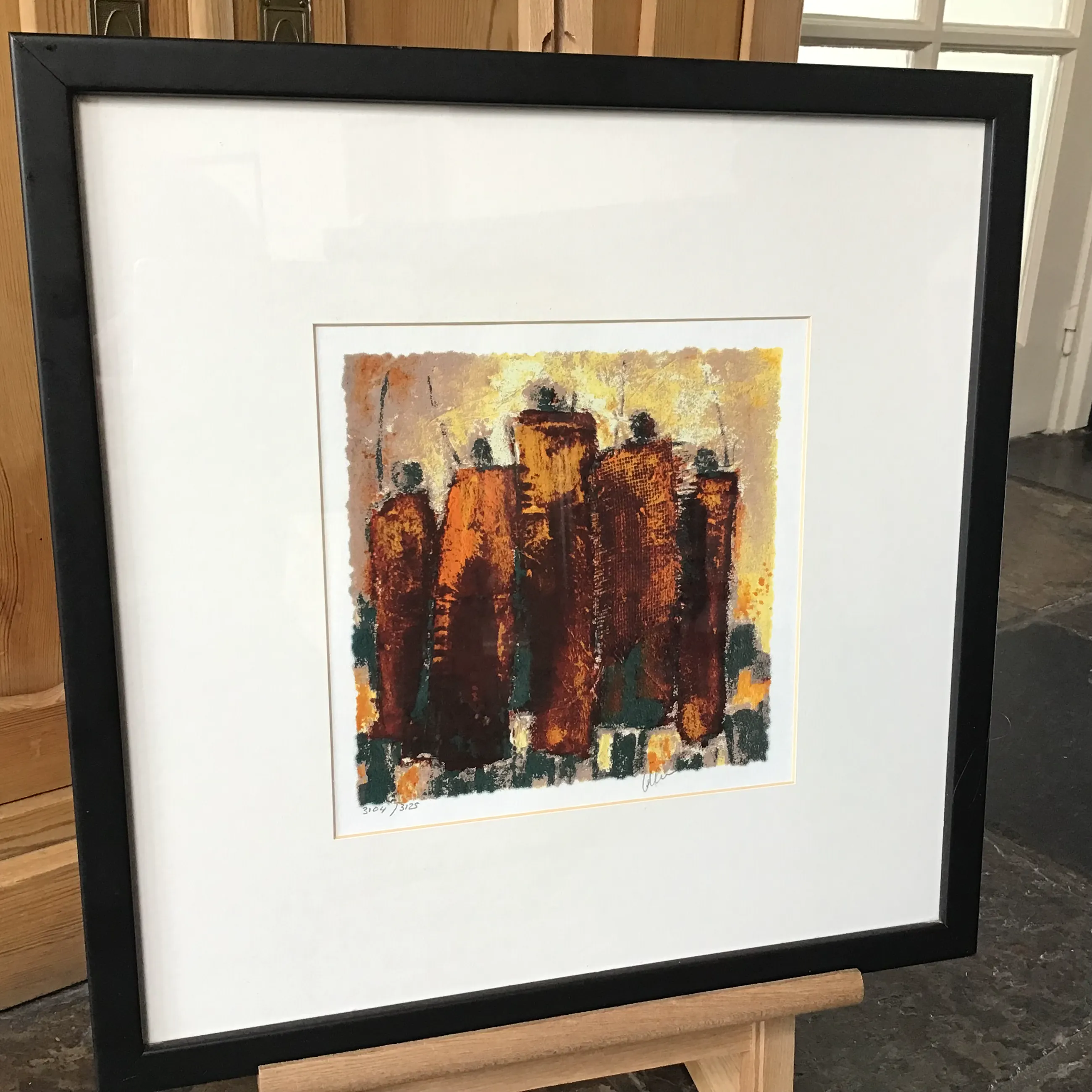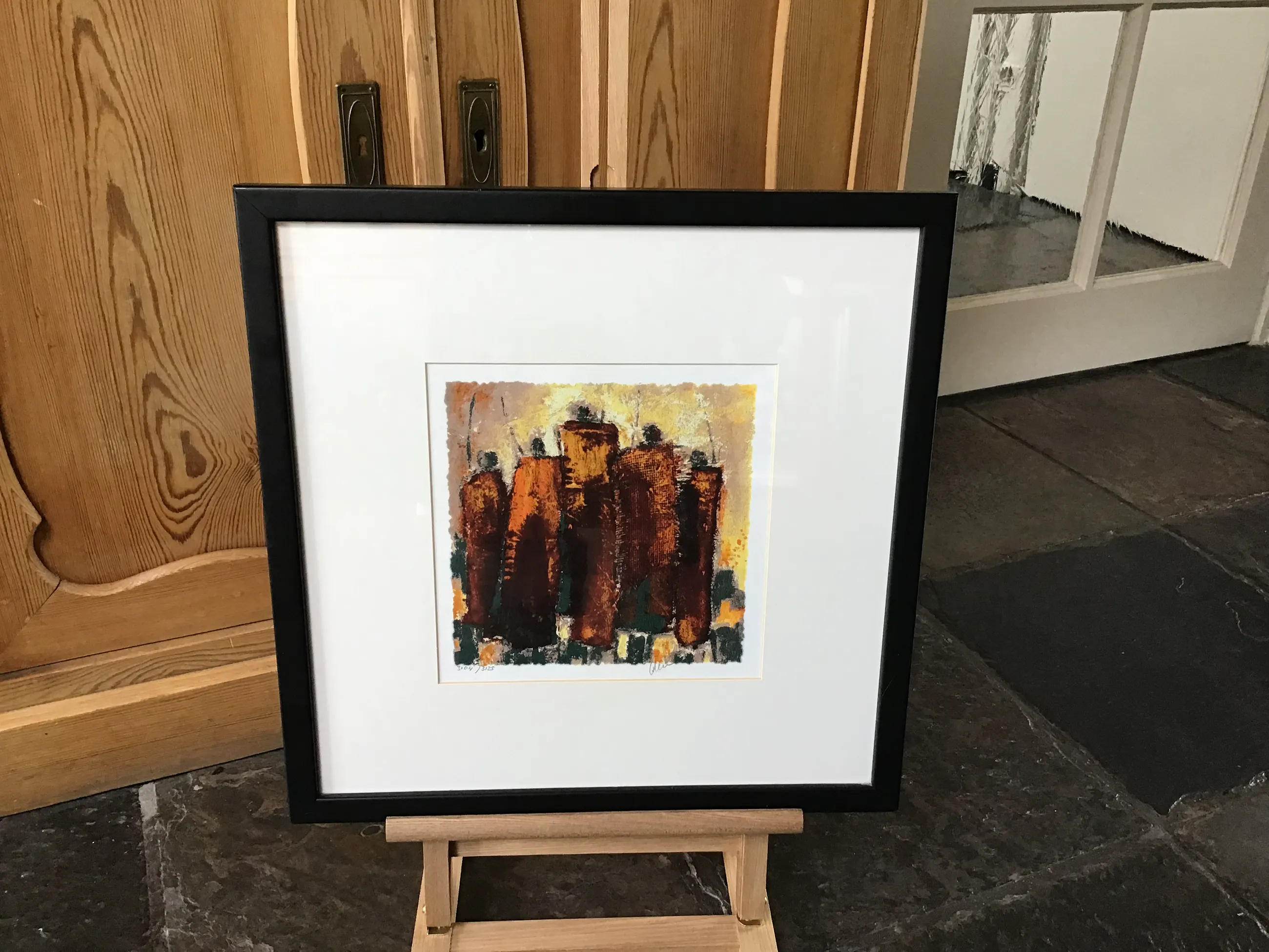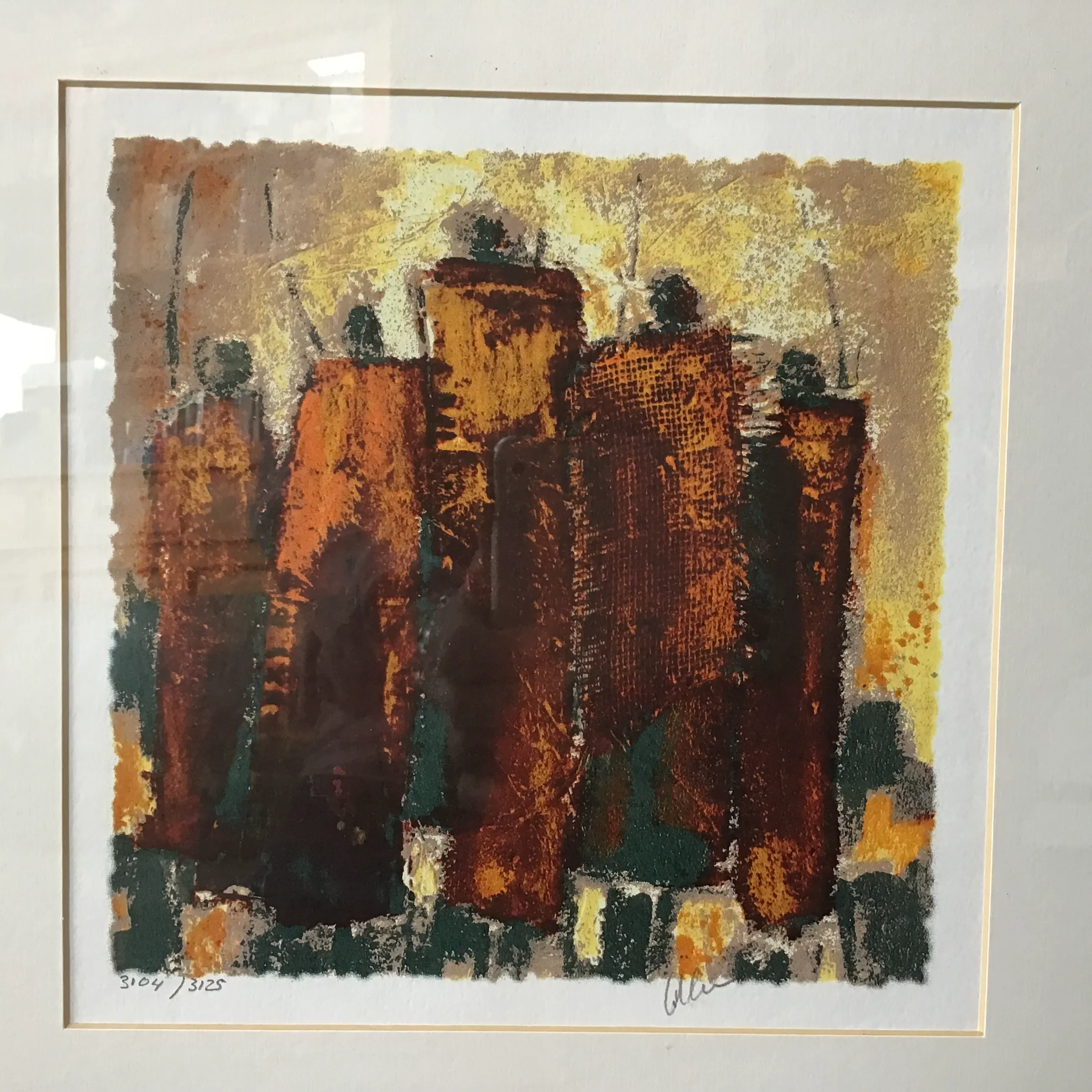 Bekend bijna abstract werk van Alie Kruse-Kolk. Vijf gestileerde mensenfiguren in aarde tinten. Alie Kruse is een veelgevraagde kunstenares. Haar werk is internationaal bekend. In Overdinkel is een permanente tentoonstelling van haar werk.