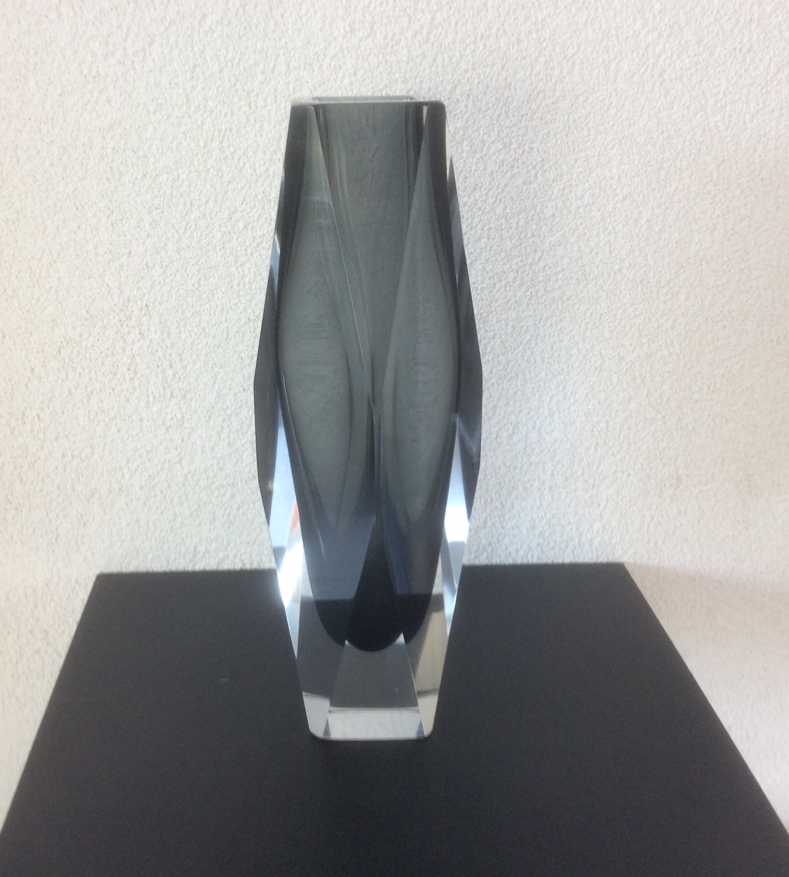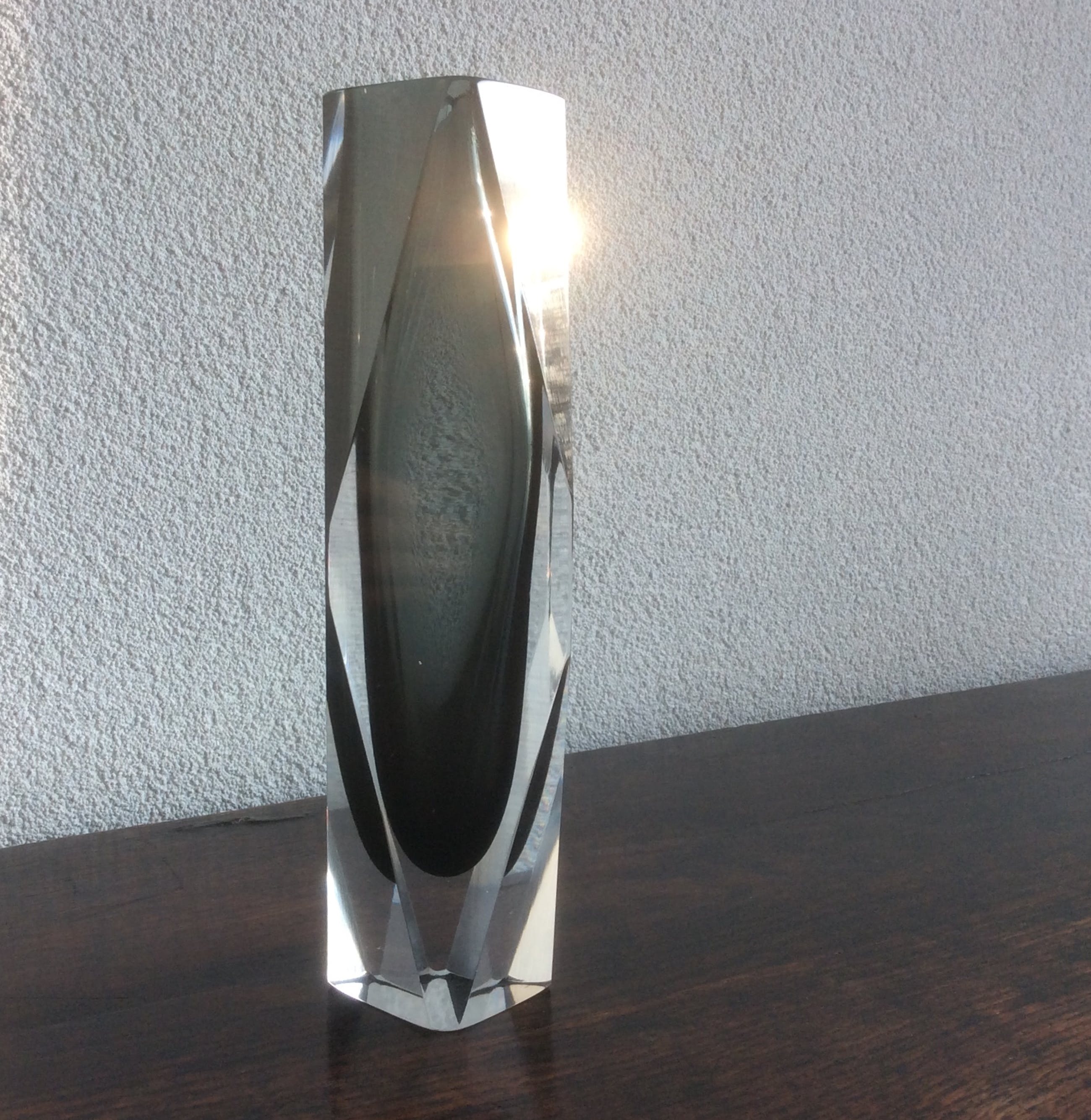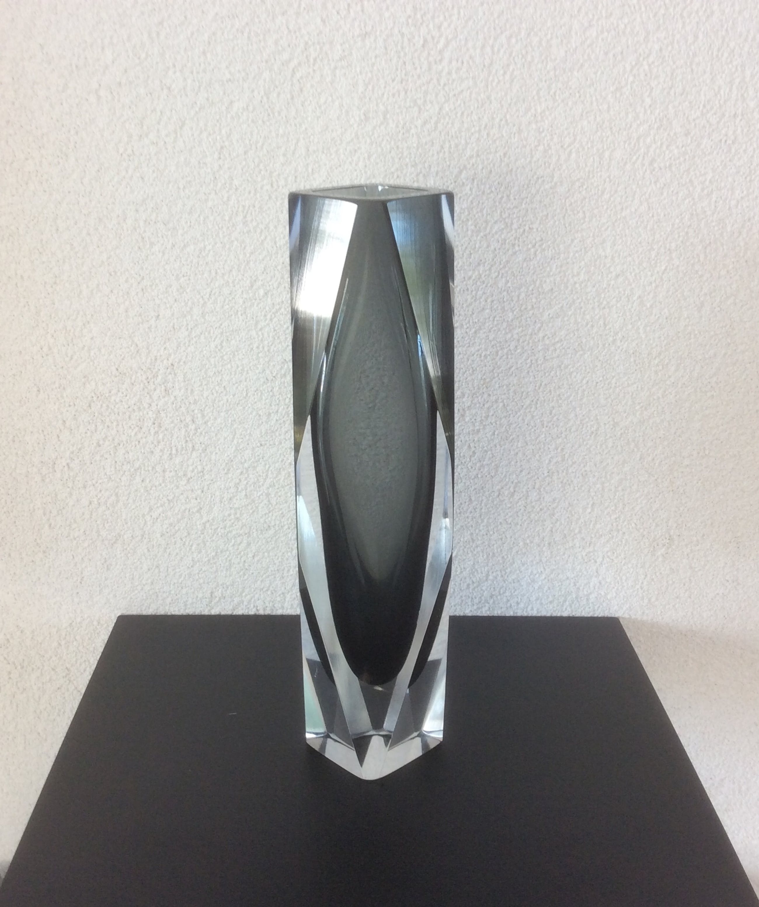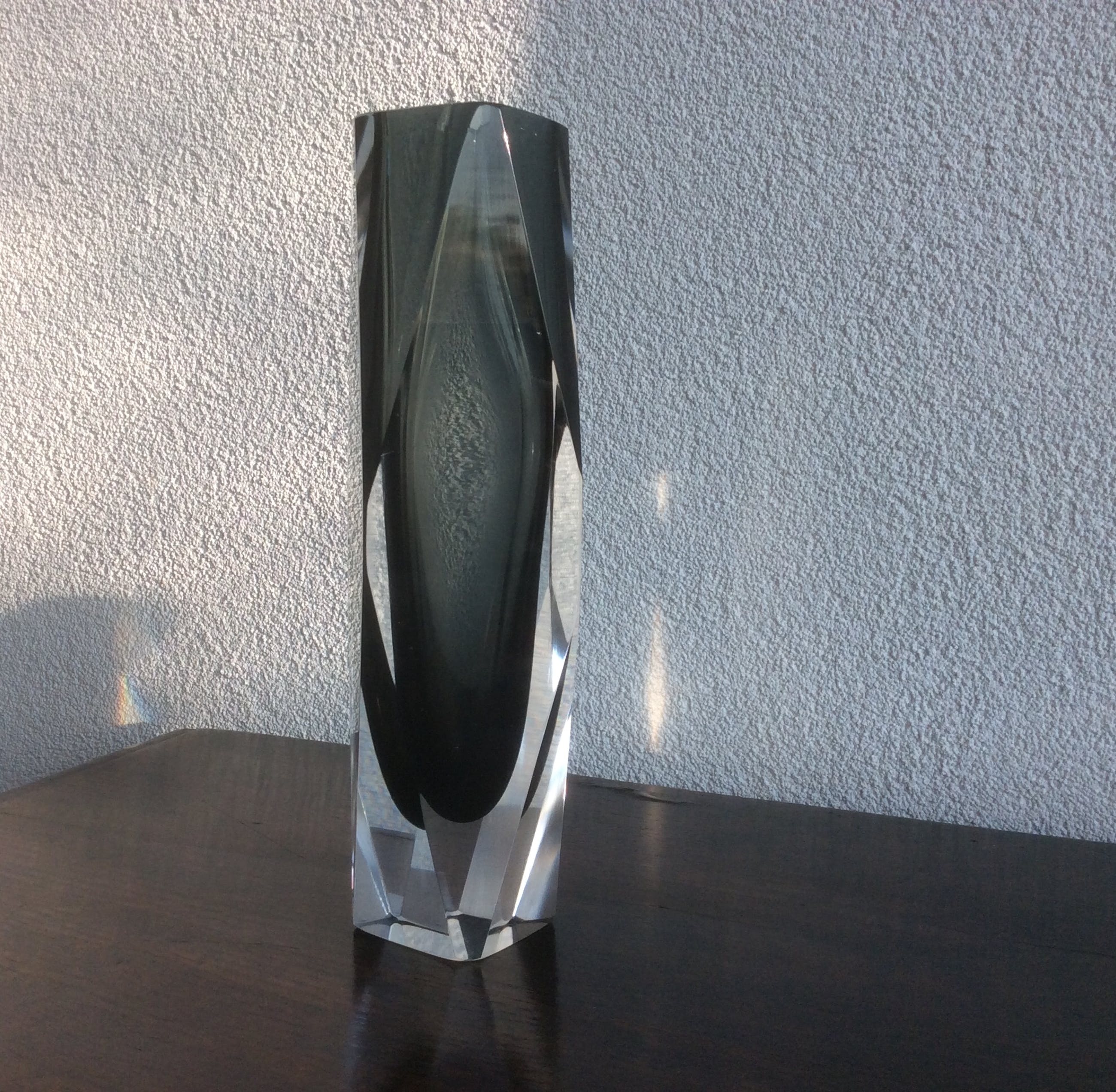 Een Mandruzzato Murano facetgeslepen blokvaas uitgevoerd met de Sommerso techniek in de kleur donkergrijs en omsloten in helder glas. De vaas heeft twaalf facetten. Twee minuscule speldenprikje en een heel klein bijna onzichtbaar krasje.