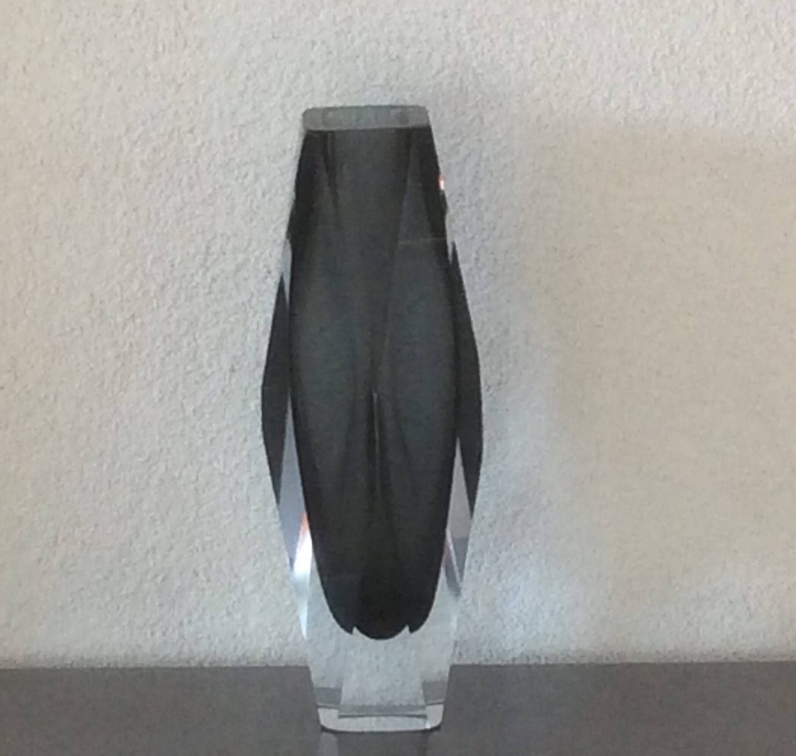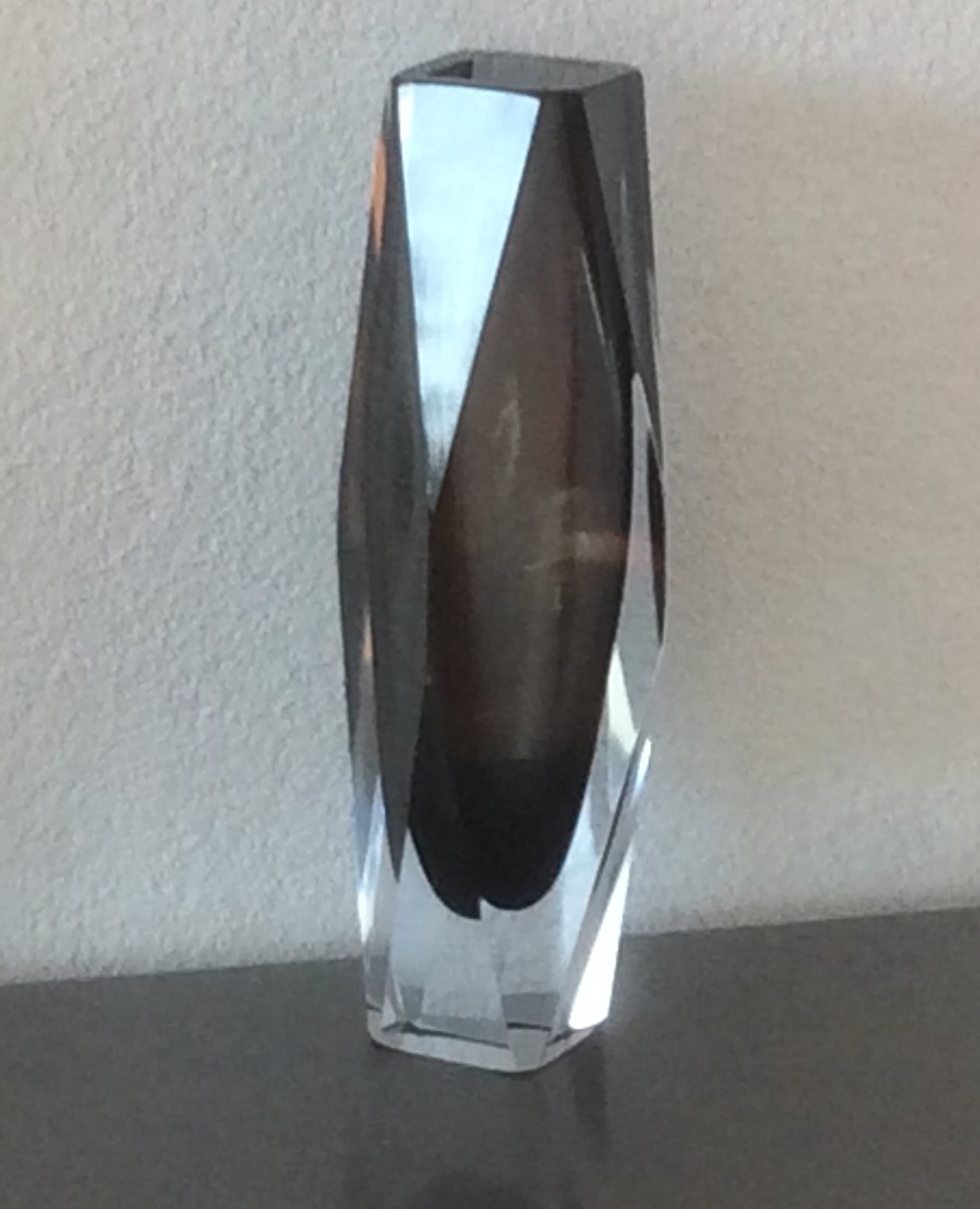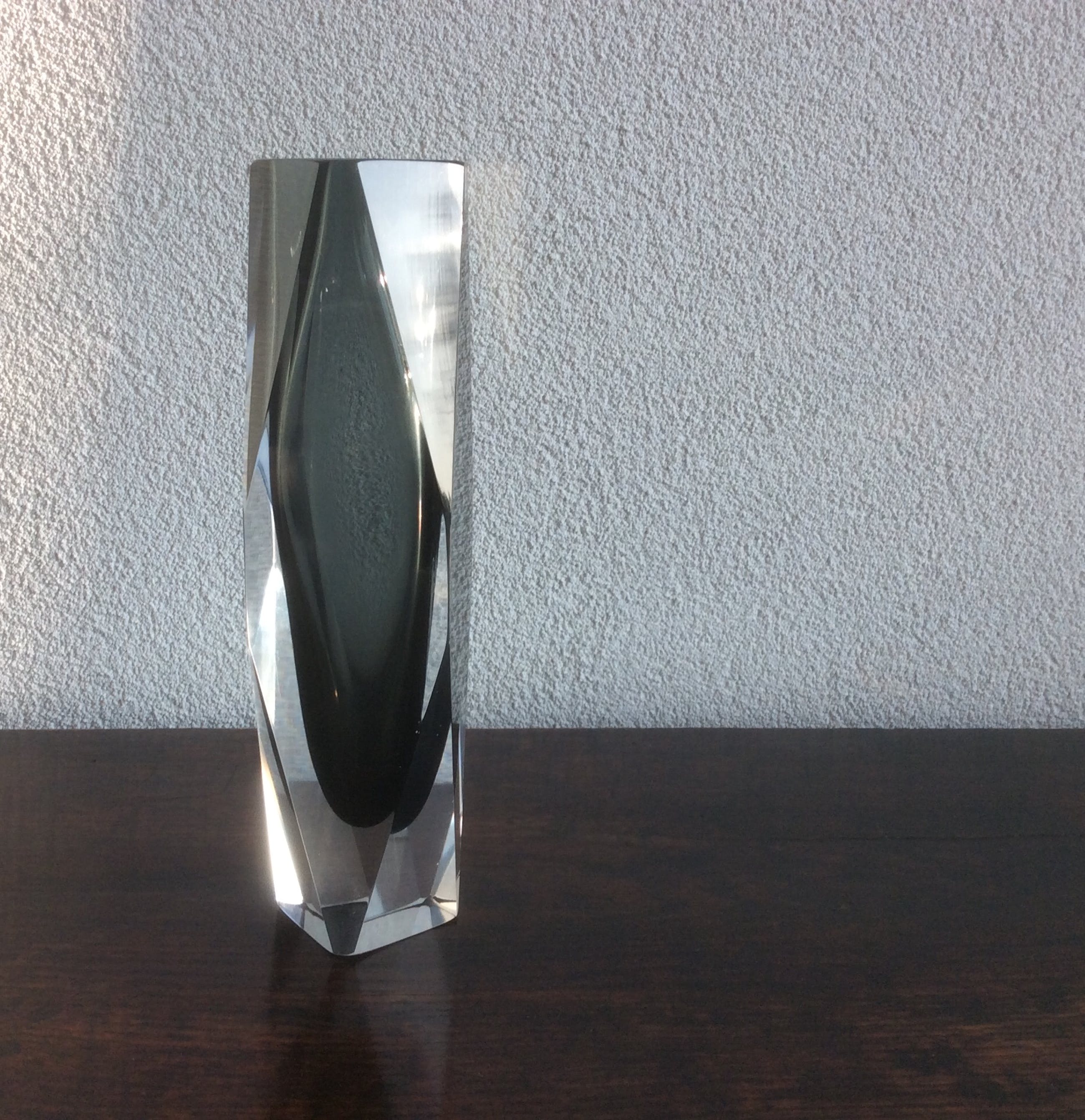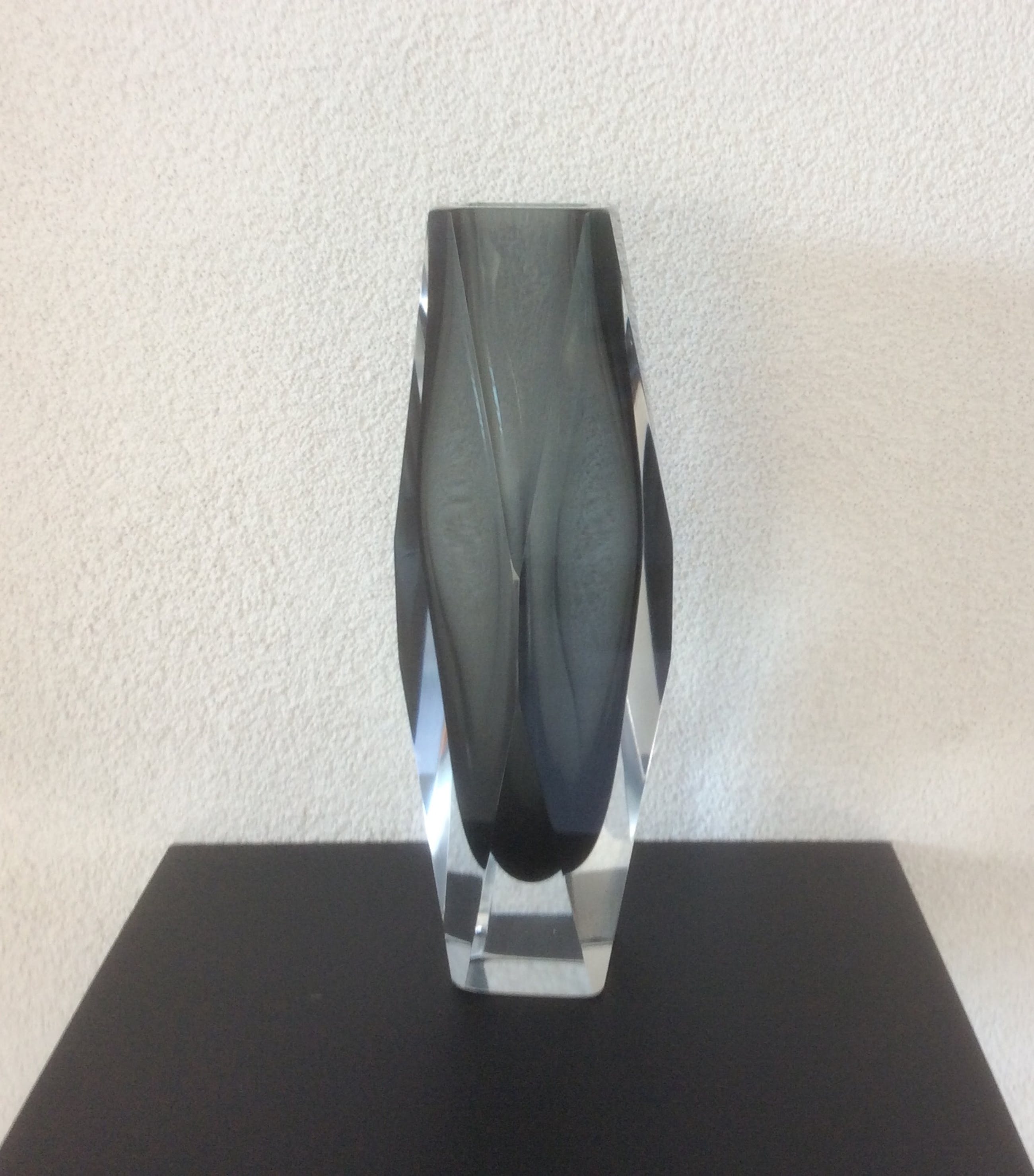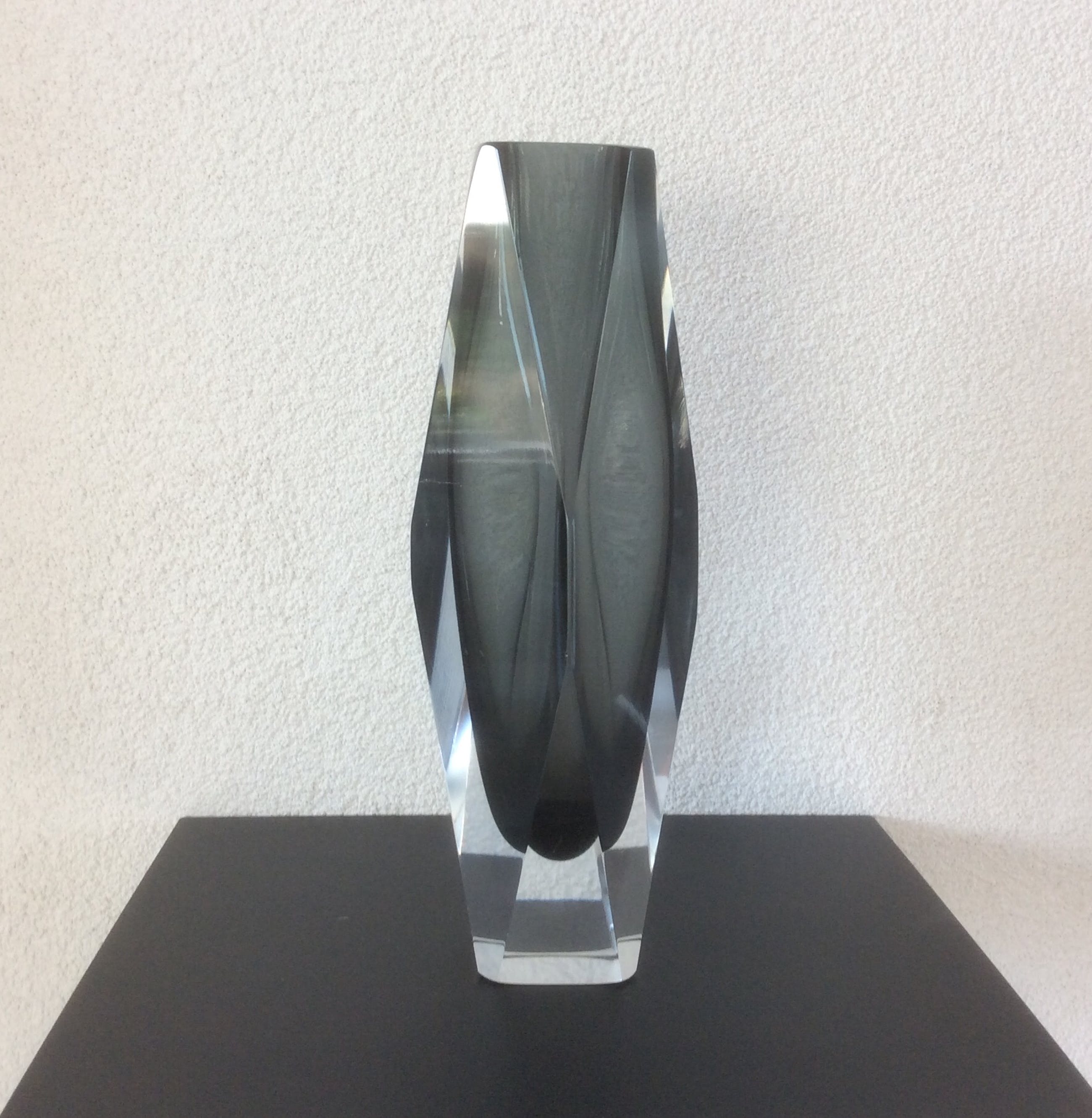 Een Mandruzzato Murano facetgeslepen blokvaas uitgevoerd met de Sommerso techniek in de kleur donkergrijs en omsloten in helder glas. De vaas heeft twaalf facetten. Twee minuscule speldenprikje en een heel klein bijna onzichtbaar krasje.