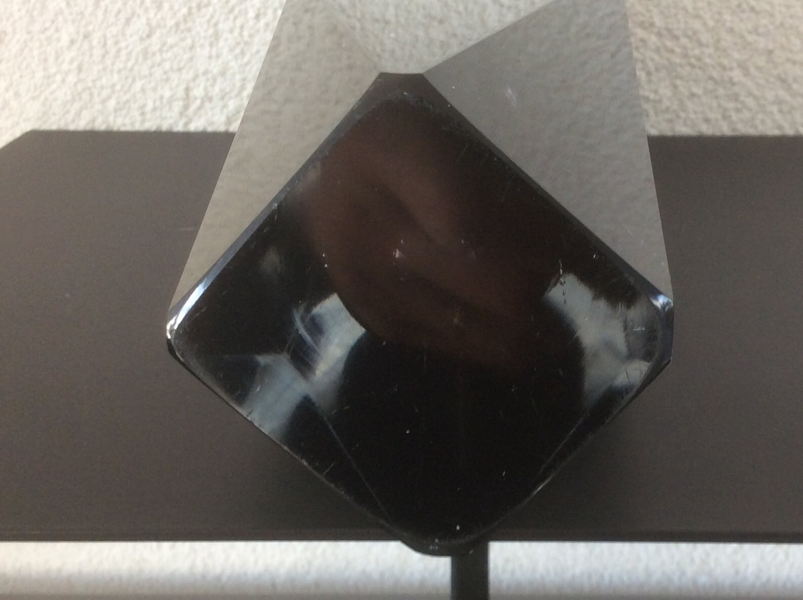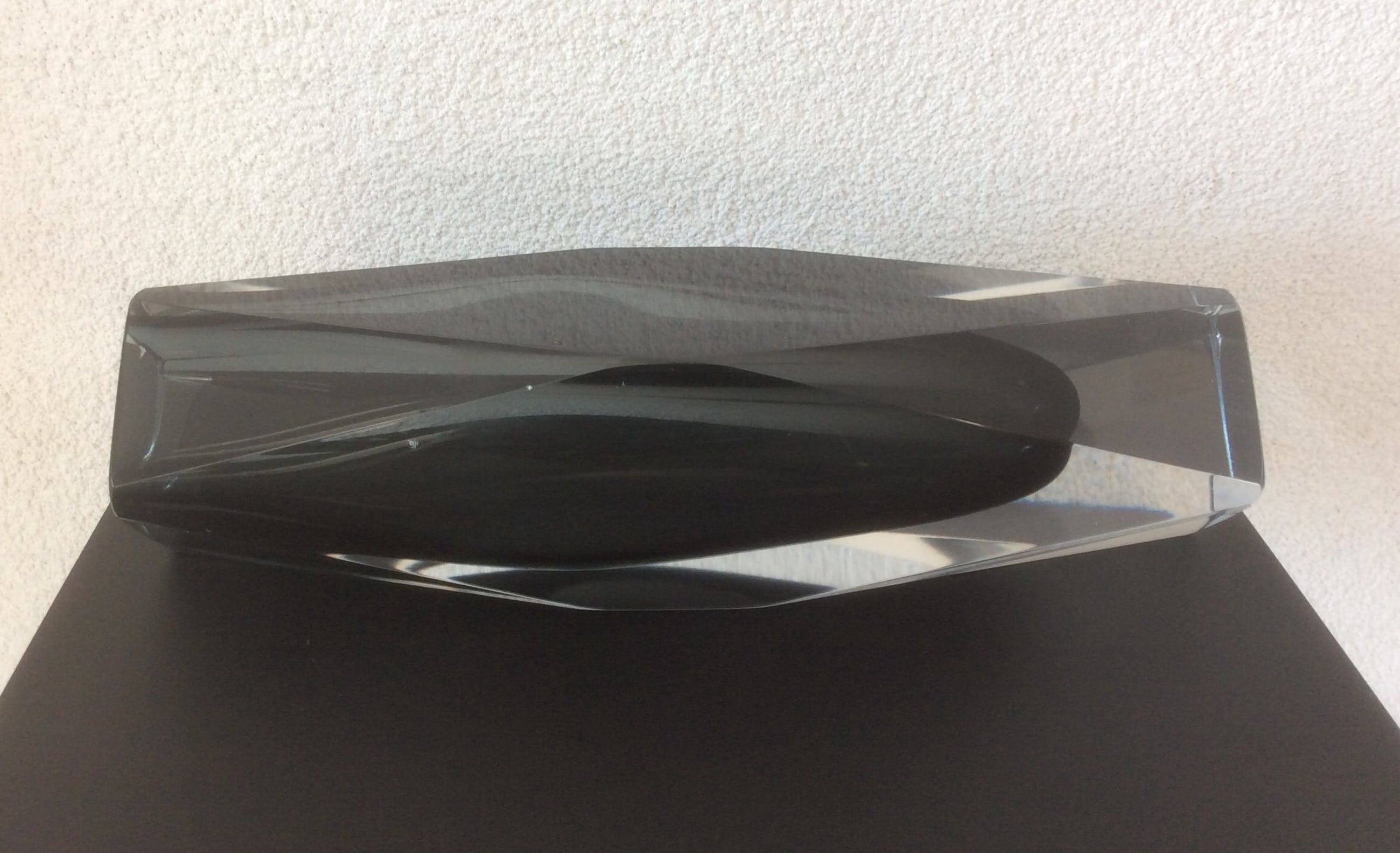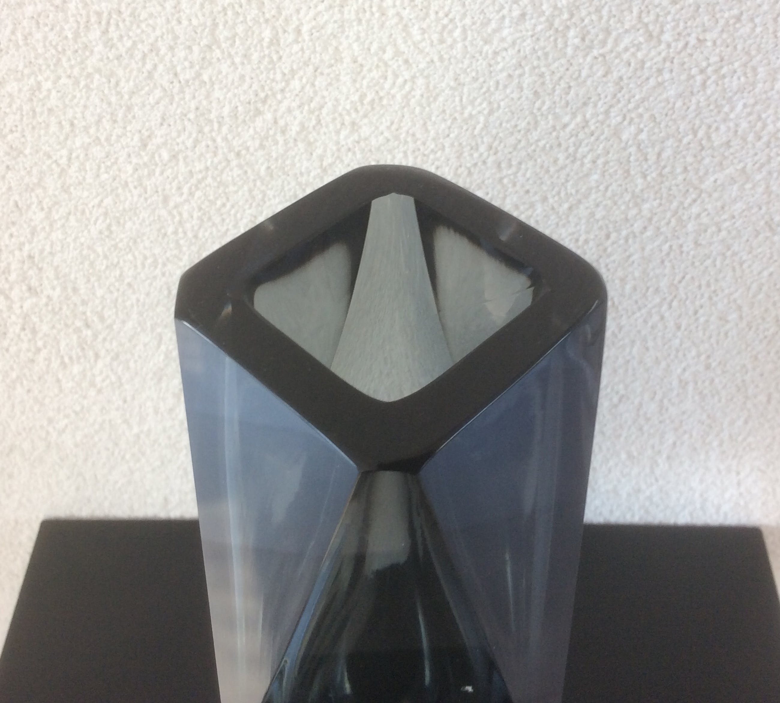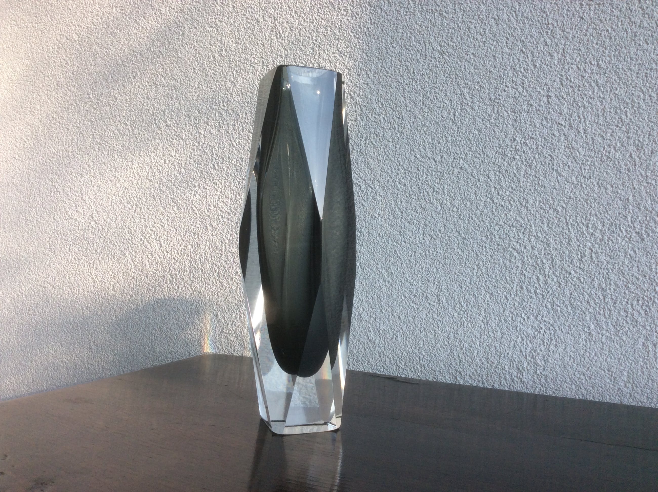 Een Mandruzzato Murano facetgeslepen blokvaas uitgevoerd met de Sommerso techniek in de kleur donkergrijs en omsloten in helder glas. De vaas heeft twaalf facetten. Twee minuscule speldenprikje en een heel klein bijna onzichtbaar krasje.