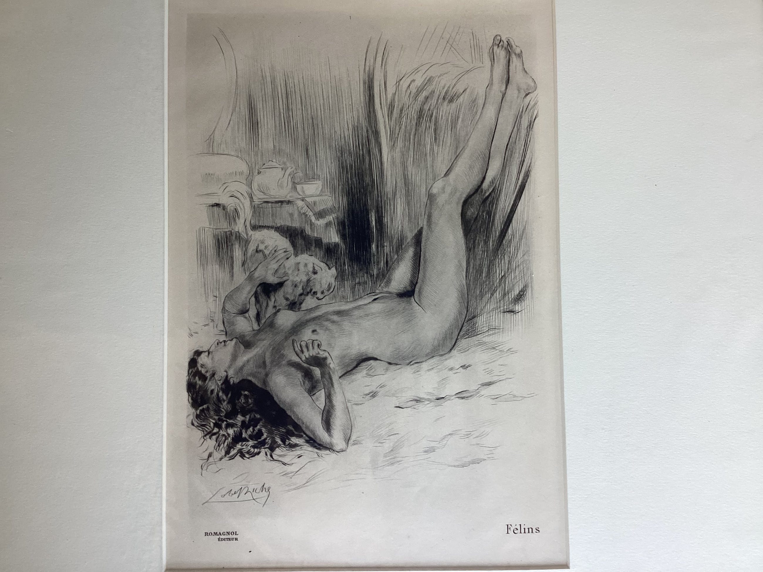 Almery Lobel- Riches 1877 - 1950 Schilder,Graveur Illustrator , Frans en bekend in het bijzonder voor zijn representaties van de wereld van dapperheid. Studeerde aan de Beaux - Arts in Montpellier. Werkte als leerling van Leon Bonnat,Antoine Calbet en Paul Sain.Hij exposeerde al zeer snel met zijn werken op de Salon des Artiste Francais waar hij al snel gedecoreerd werd. Deze gravures zijn door hem op ets gezet in de periode van 1928 - 1939.In die periode gaf hij de wereld in de “Belle Epoque” weer waar zich de Elite van Parijs bevond.Prachtig geeft hij de Erotiek achter de gesloten deuren weer in zijn afbeeldingen. De 3 gravures zijn onderdeel van die wereld. Titels van de gravures zijn :Felins(katachtigen),Apres le Bain(na het bad) en le Manicure(de manicure)