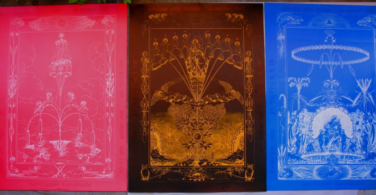 Drei Farbserigraphien , je Blatt 84 x 60 cm . Nach Otto Philipp Runge " VIER ZEITEN " Blatt 1 DER MORGEN ( rot ) Blatt 2 DER TAG ( blau ) Blatt 3 DIE NACHT ( schwarz gold ) . Jedes Blatt am unteren Rand signiert . HAMBURGER KUNSTHALLE 1977/78 . Zwei Blätter mit minimalem Abrieb am unteren Rand , sonst tadellos. Versand Deutschland 8,50 EU 19.- Euro