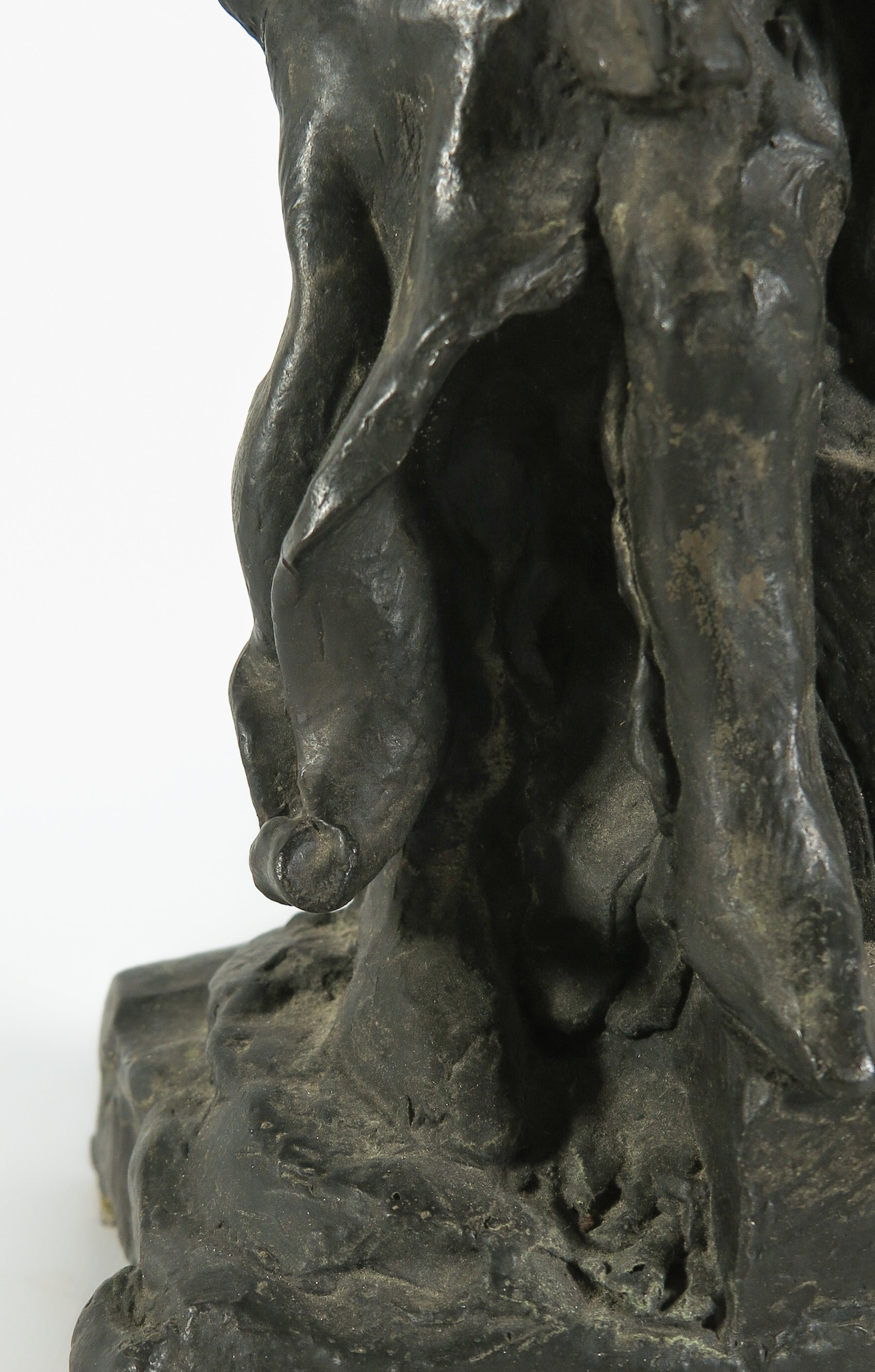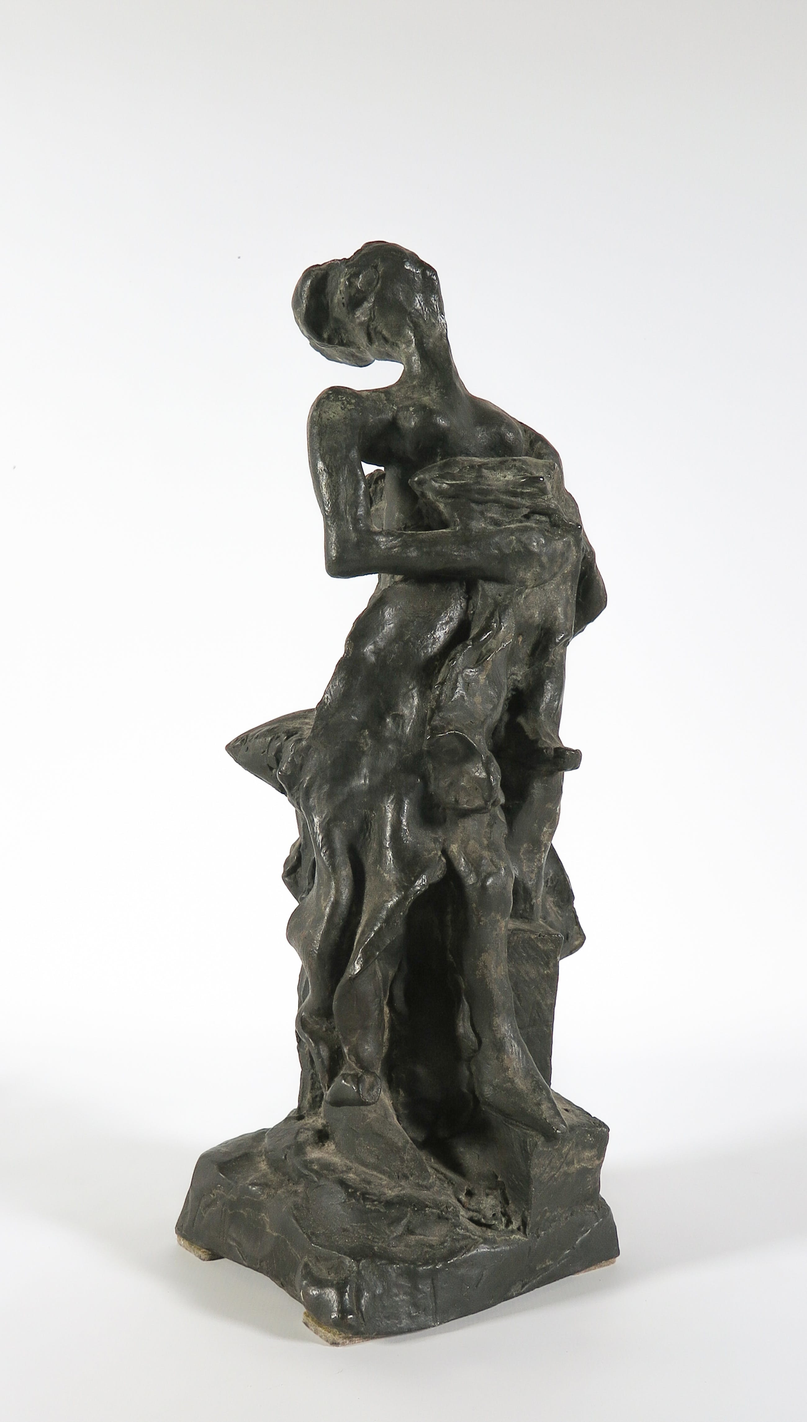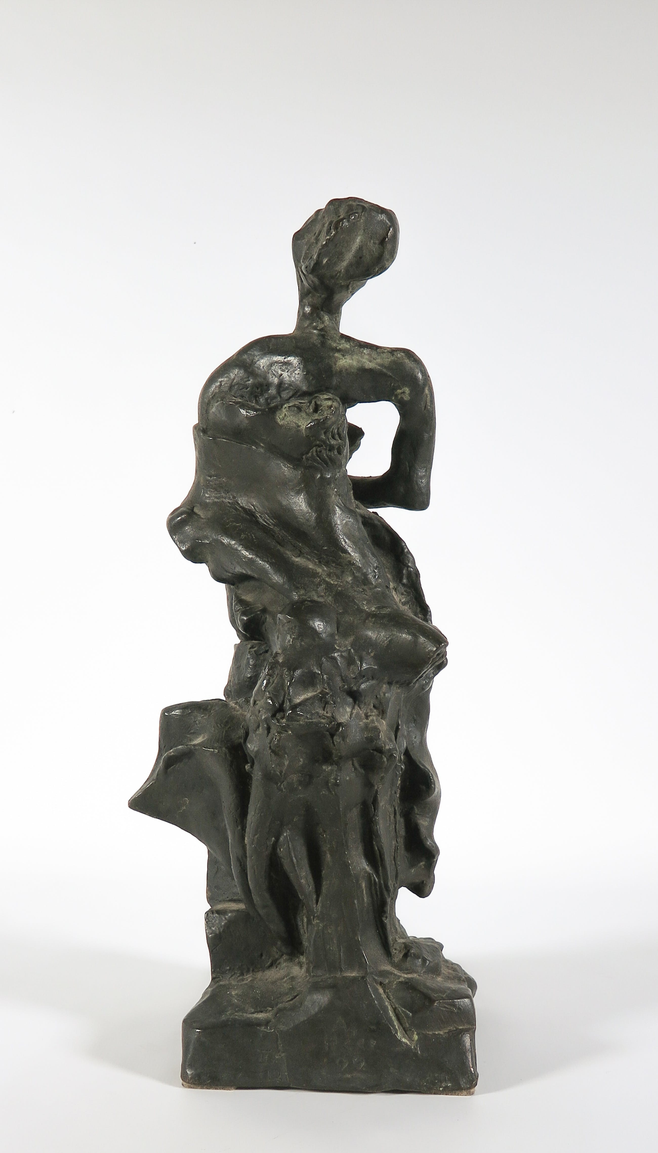 Bijzonder en intrigerend bronzen beeld van een staande vrouw gehuld in een gewaad. Langs de onderste rand gesigneerd, gedateerd en genummerd.