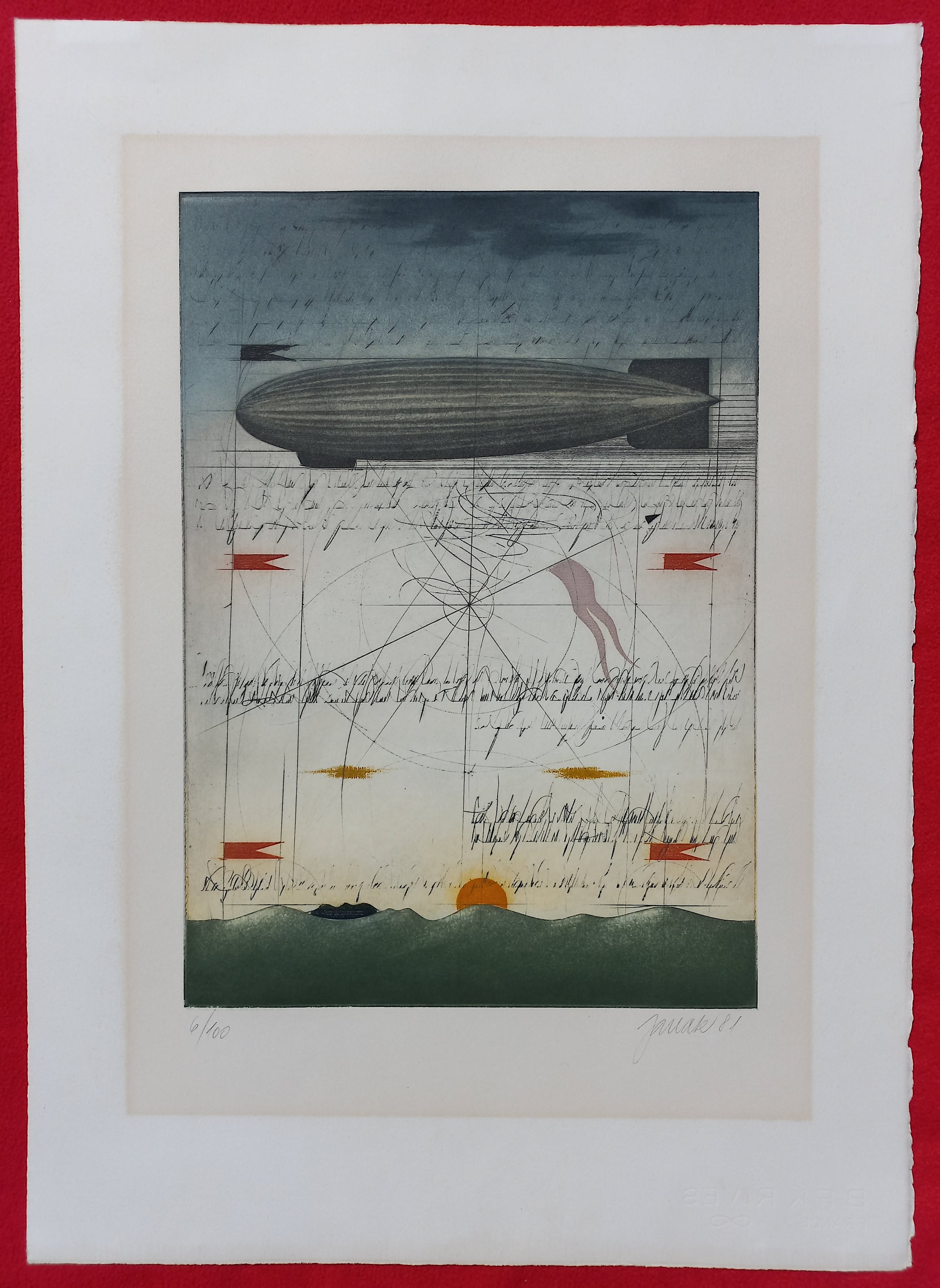Mooie, karakteristieke ets van de Duitse kunstenaar Alois Janak. Originele kleurenets (dus geen giclee) op Rives papier, met potlood gesigneerd, gedateerd (‘81) en genummerd (6/100). In goede conditie; blad heeft ingelijst gezeten want er is een verkleuring binnen een vorig passe-partout. Opnieuw ingelijst met iets strakker passe-partout is het werk zeer goed.