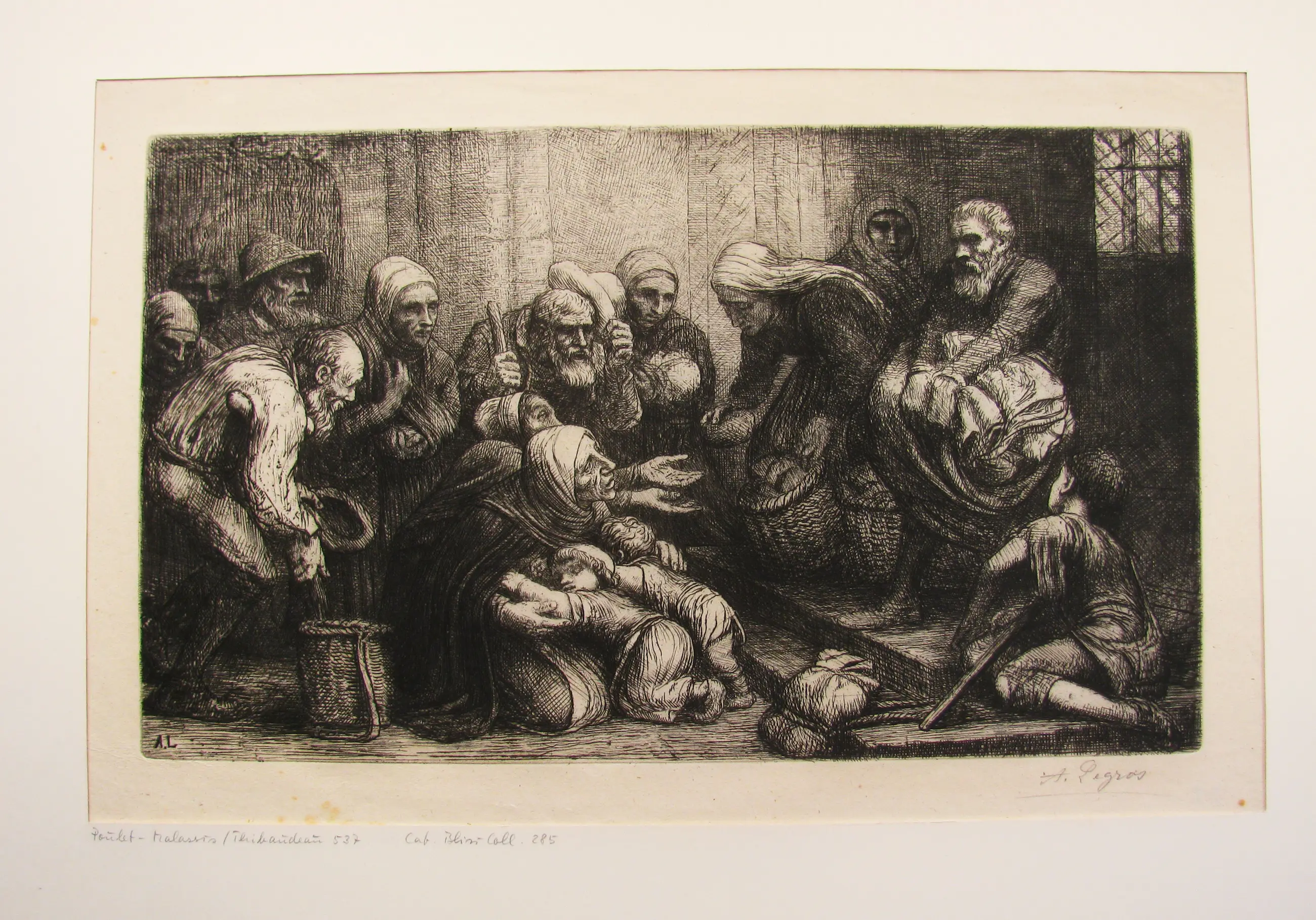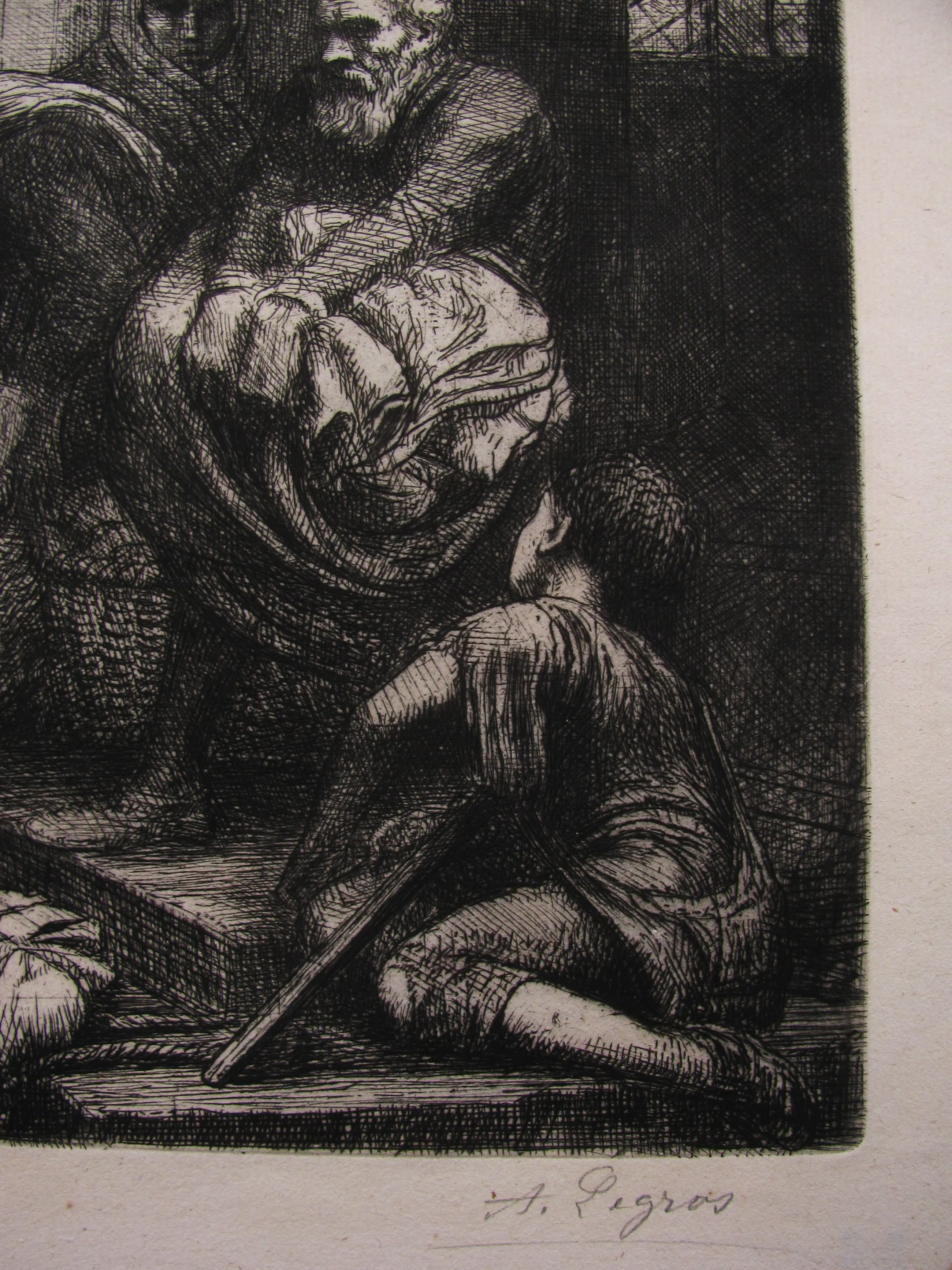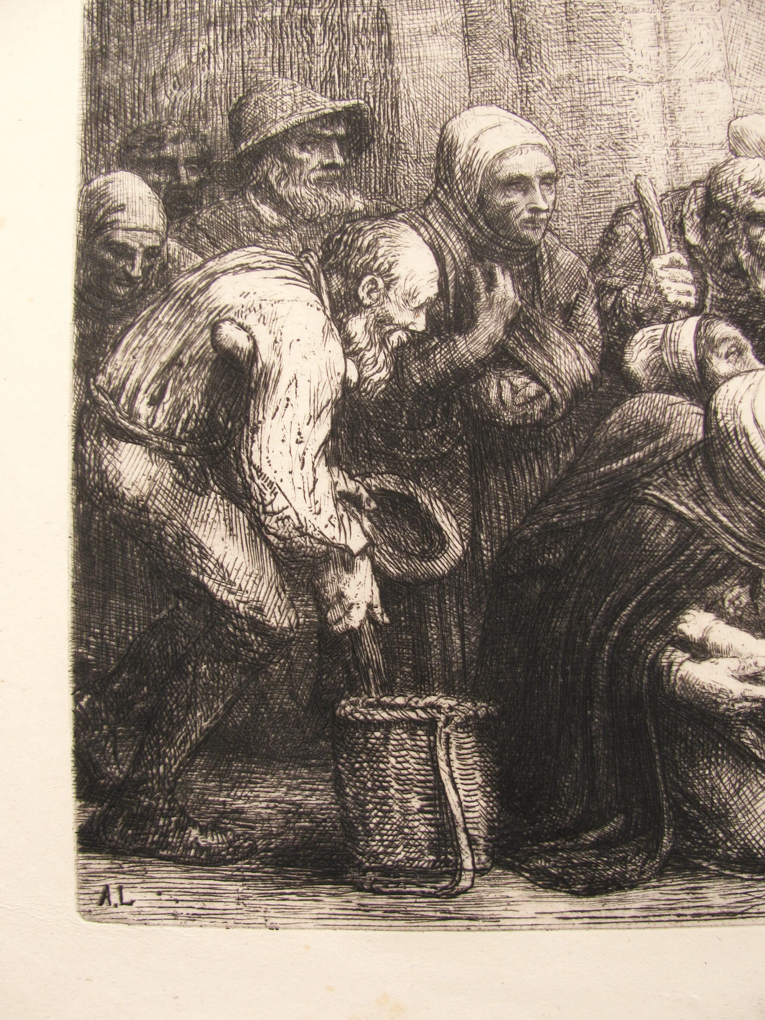 ALPHONSE LEGROS, 1837 - 1911 Ets "LES MEDIANTS DE BRUGGE". 20 x 34 cm (42 x 26 cm van het vel) op fijn Hollands leipapier. Gesigneerd met potlood. Monogram AL in drukletters. Aan de bovenrand gemonteerd onder een passe-partout (48 x 64 cm). In zeer goede staat.