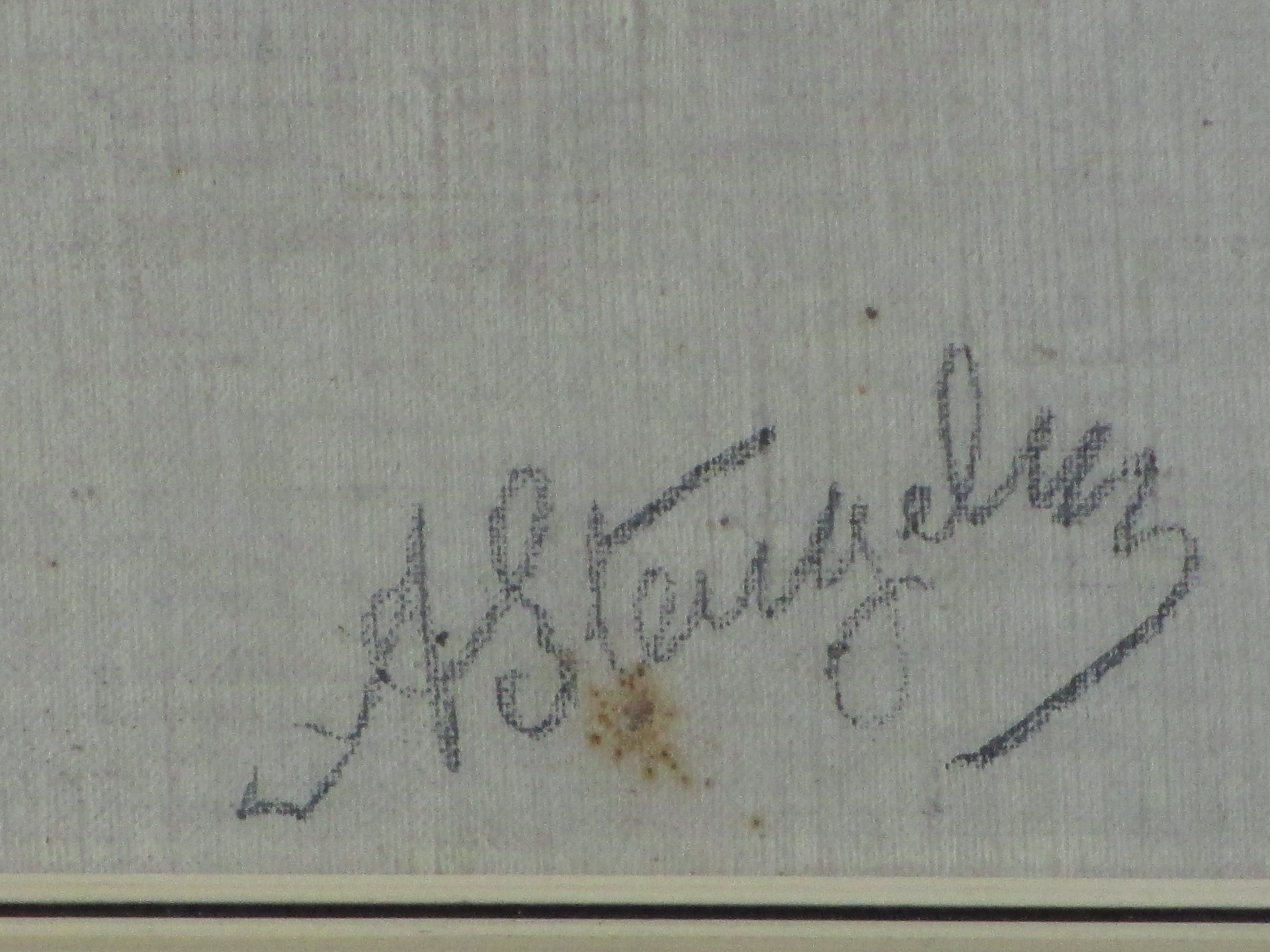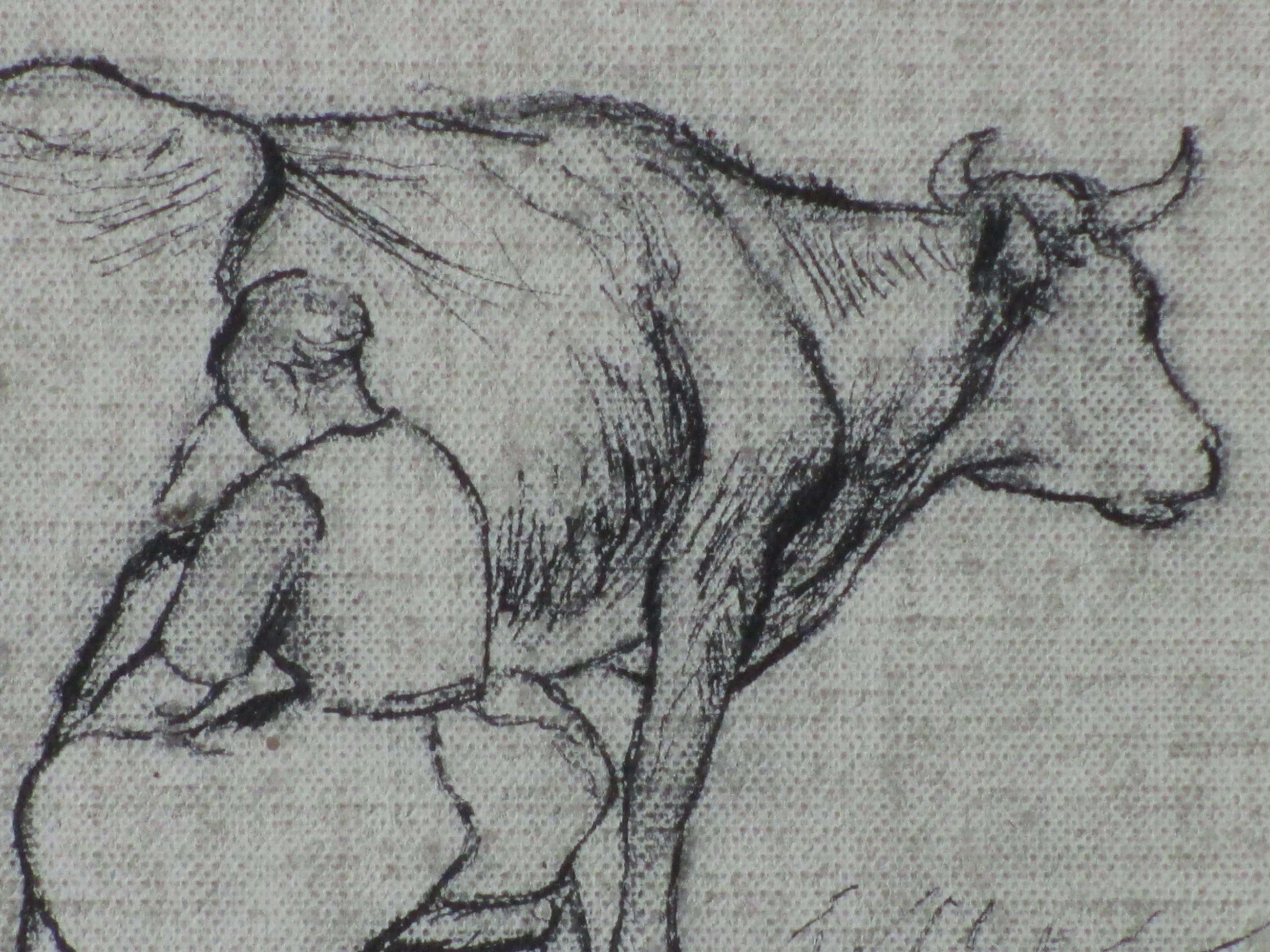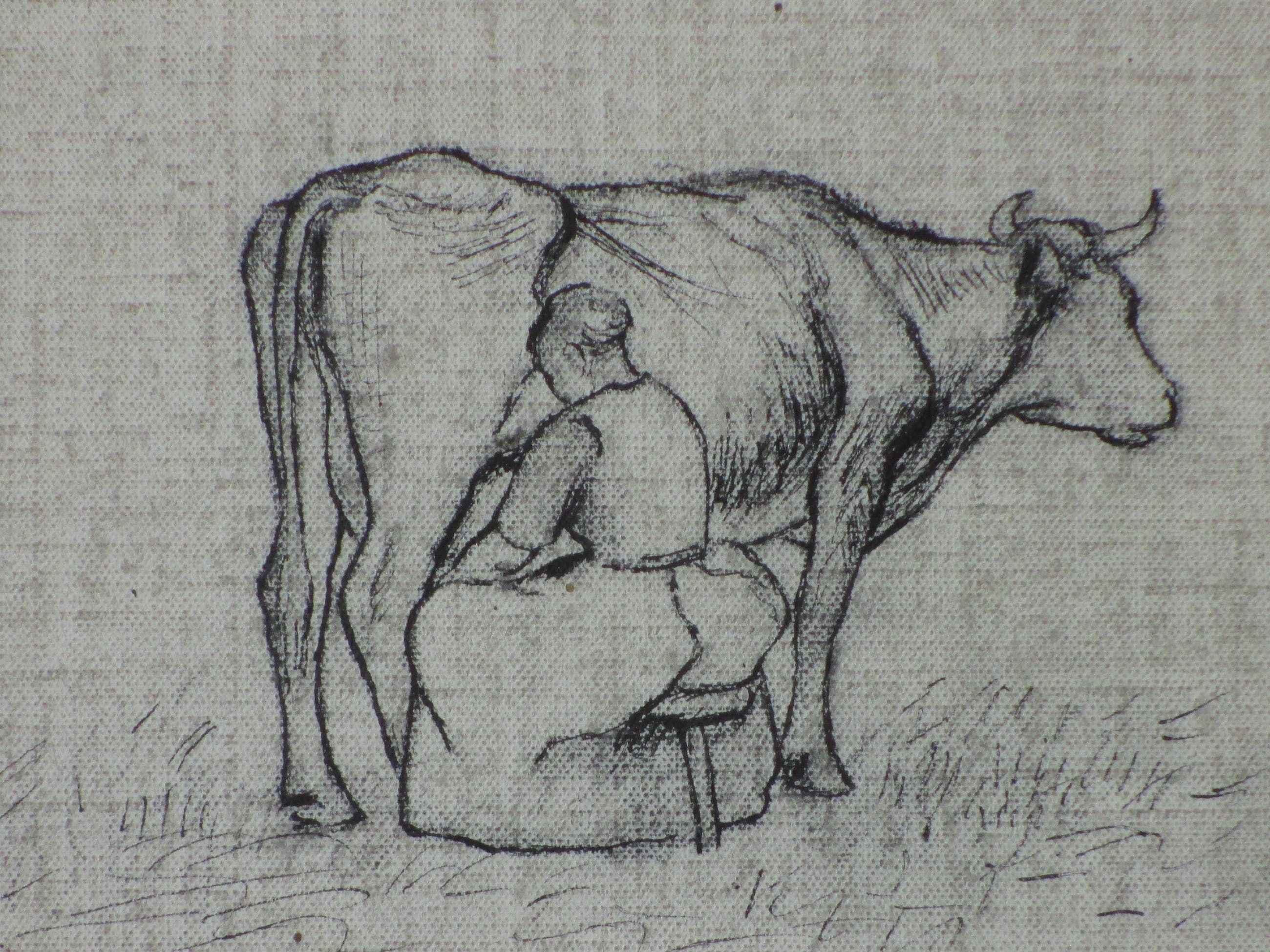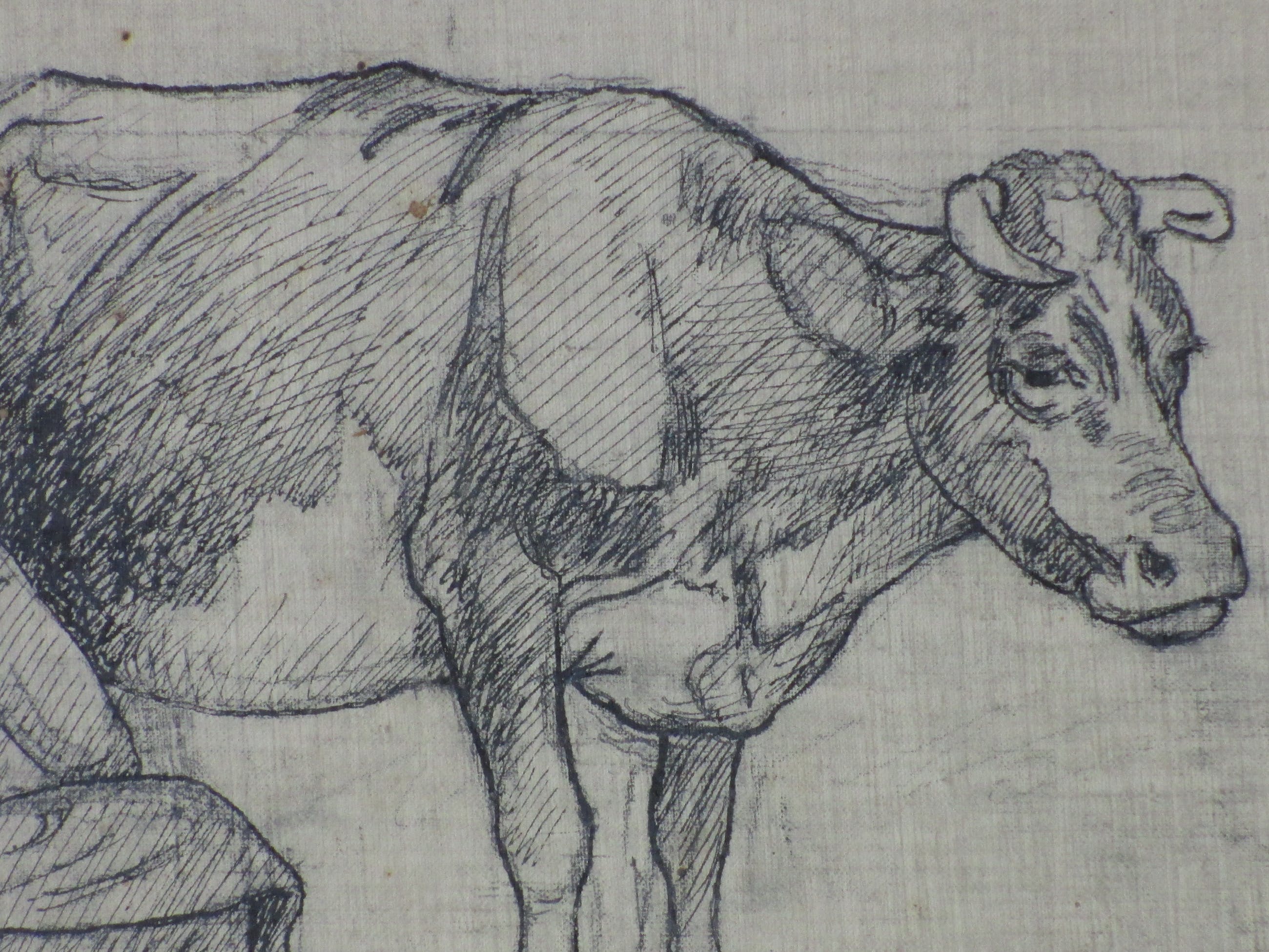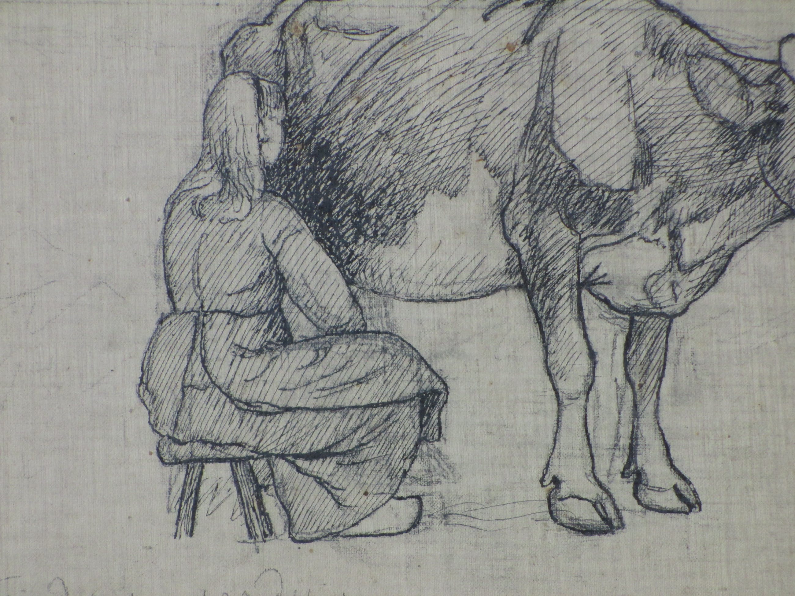 Tekening door Alphonse Stengelin. Voorstelling van een koemelkende boerin Gelijst, beeldmaat 15x20, lijstmaat 25x35 Gesigneerd in potlood r.o.: 'A. Stengelin' Annotatie in potlood l.o: 'Vache noire....?' Herkomst: Kunsthandel C.M. Schoonheim, Utrecht
