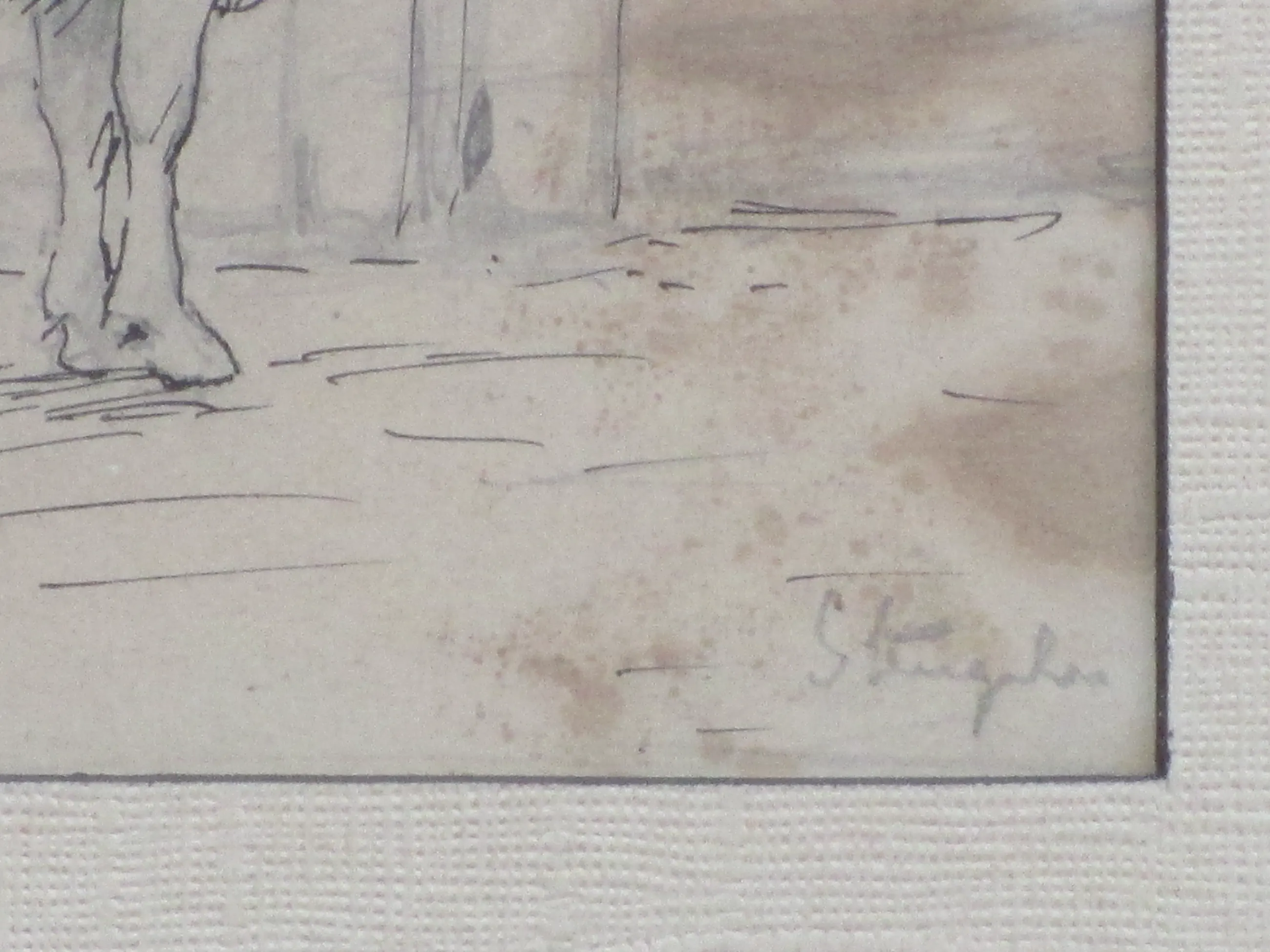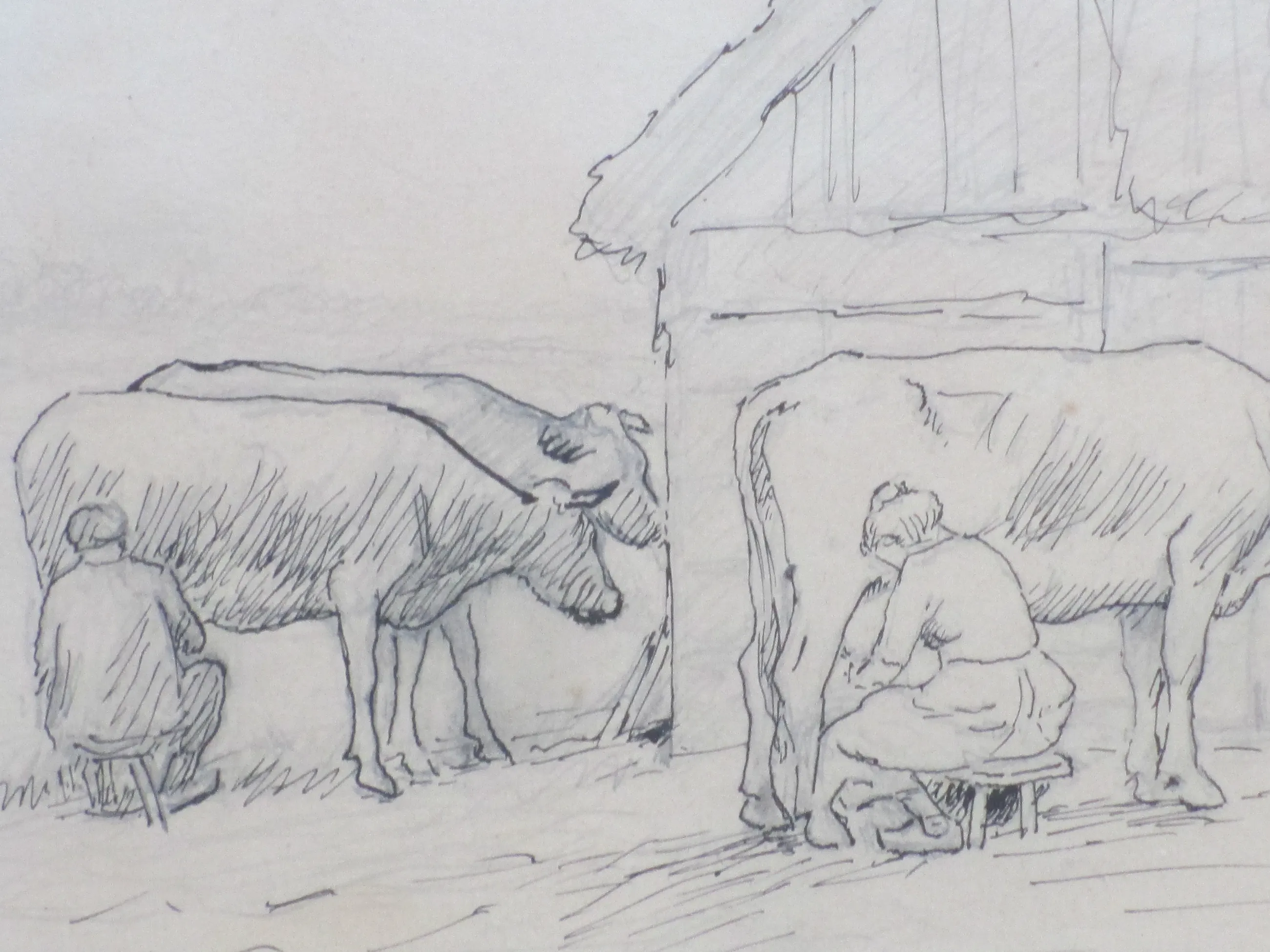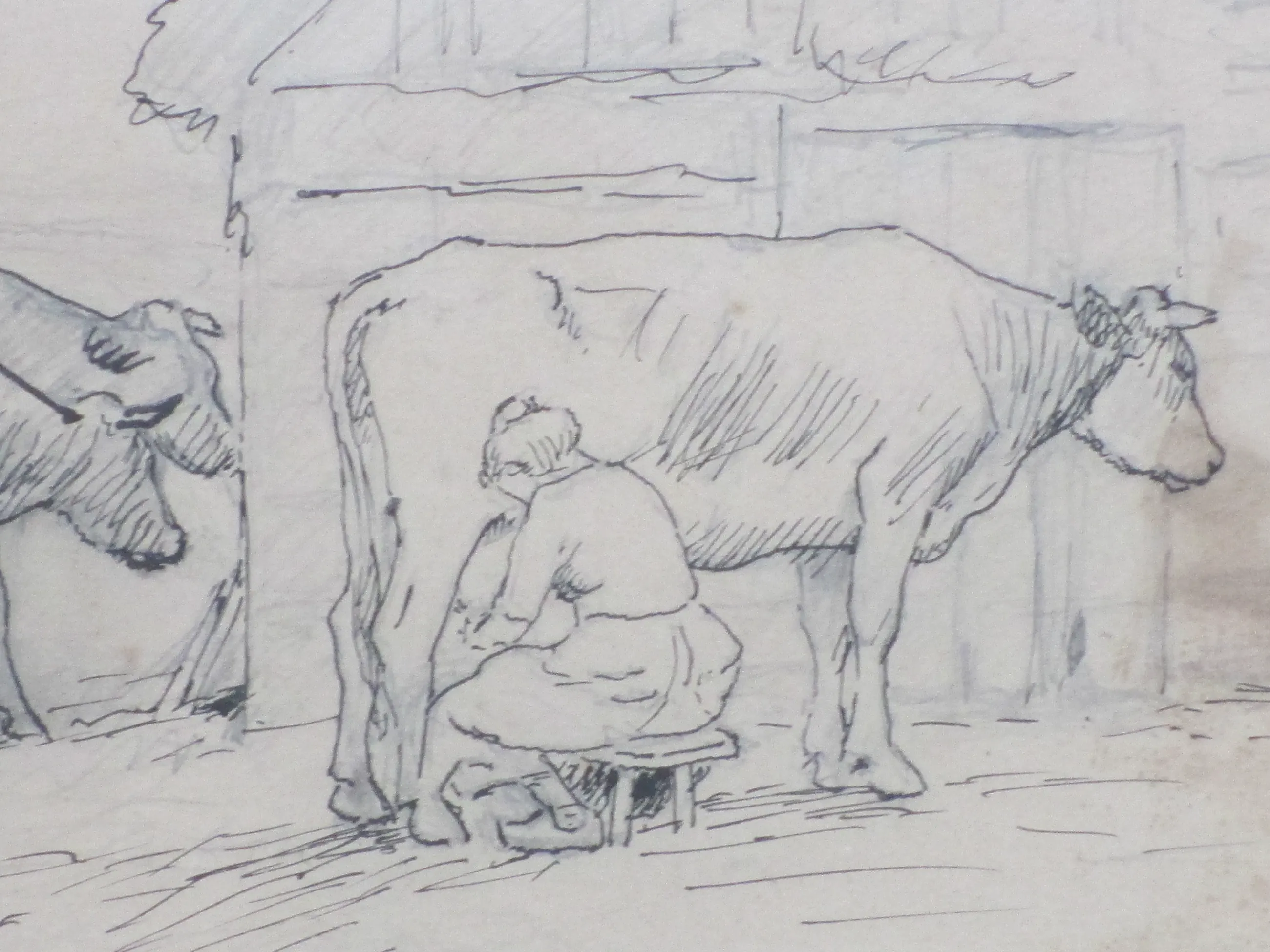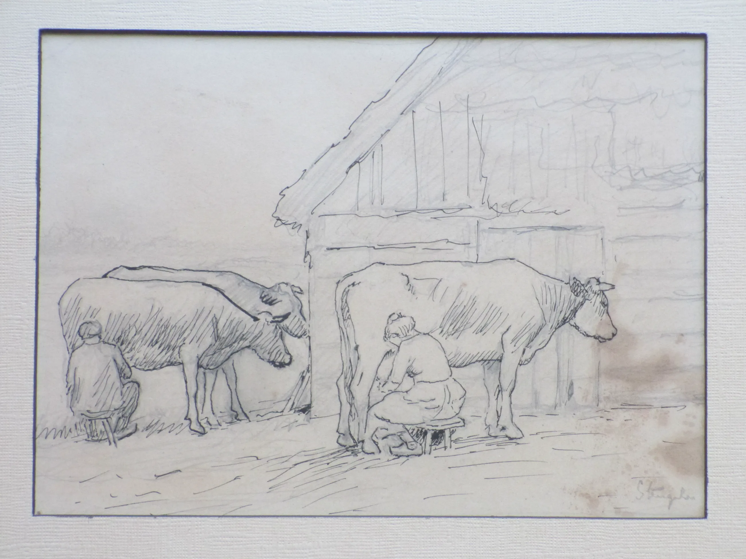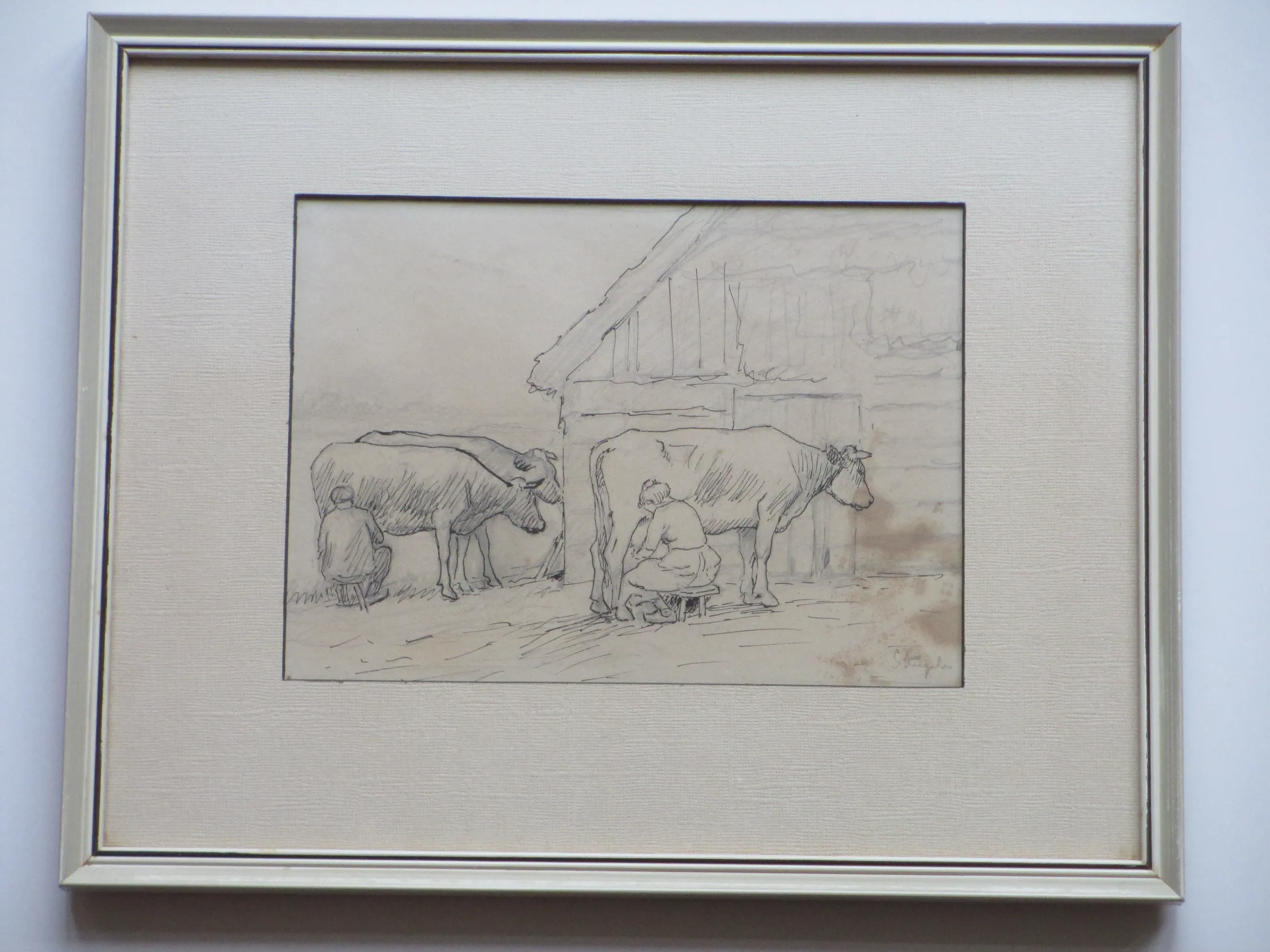 Inkttekening en potlood door Alphonse Stengelin. Voorstelling van melktijd, met boerin en boer die de koeien melken. Gelijst, beeldmaat 12x17, lijstmaat 22x28 Gesigneerd in potlood rechtsonder: 'Stengelin' Authenticiteit volledig gegarandeerd.