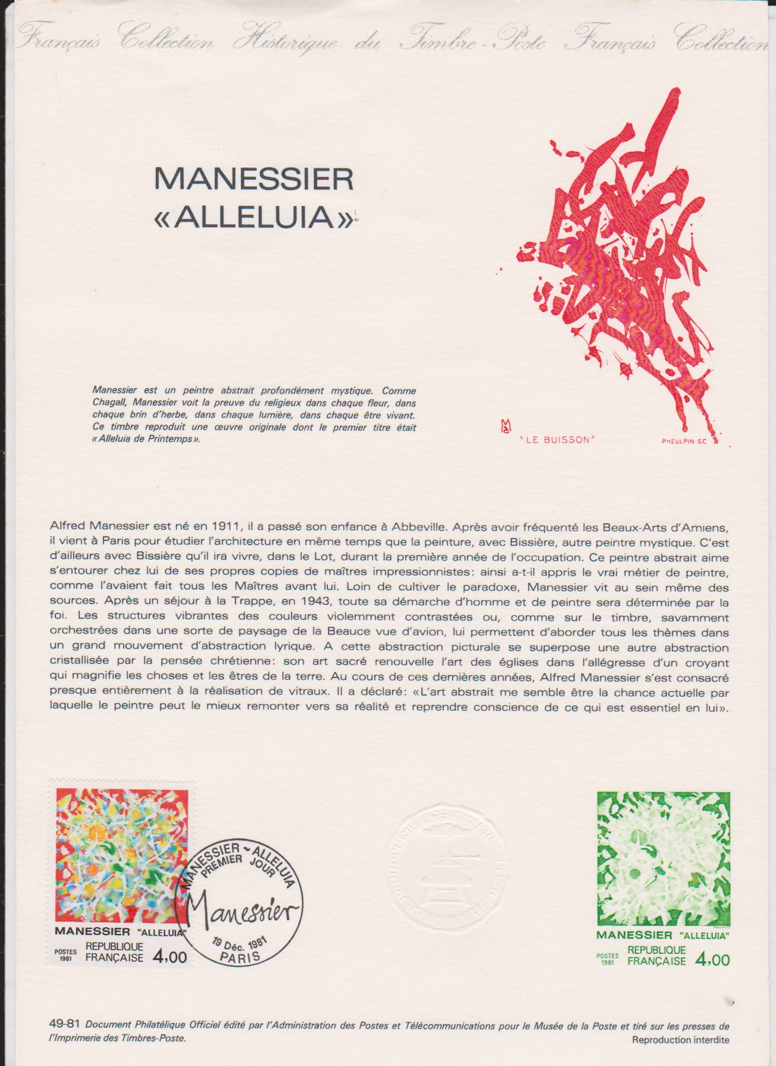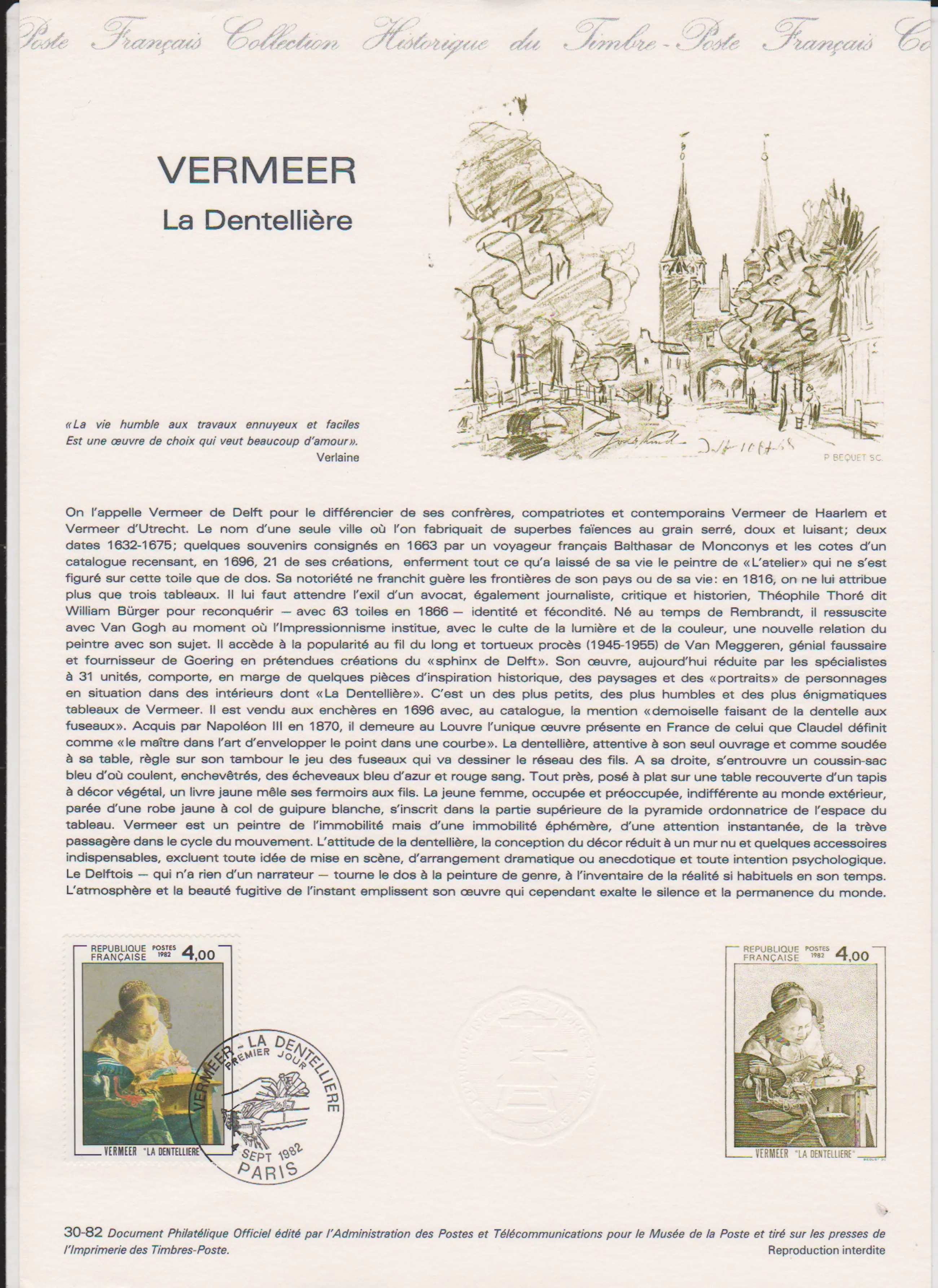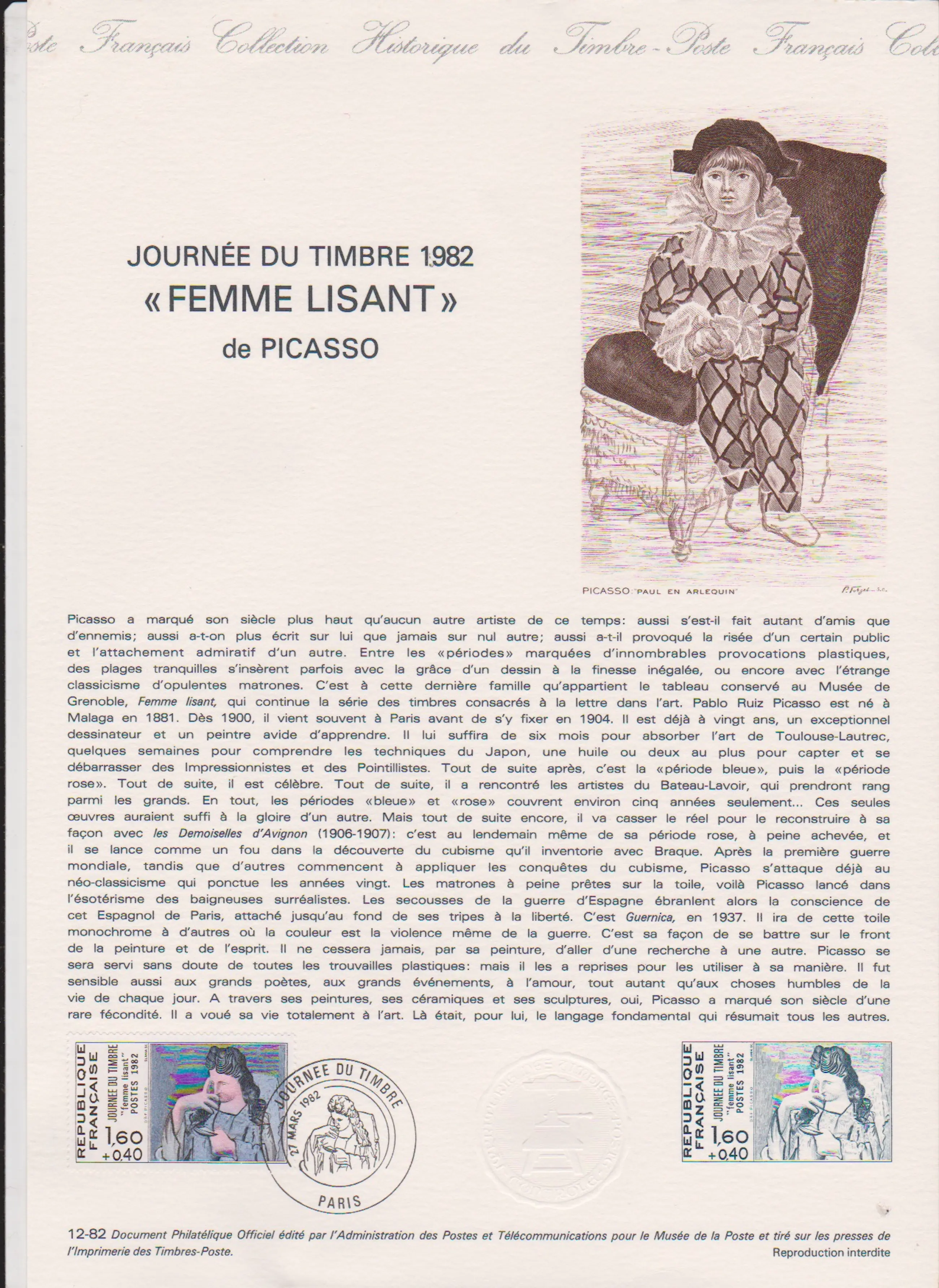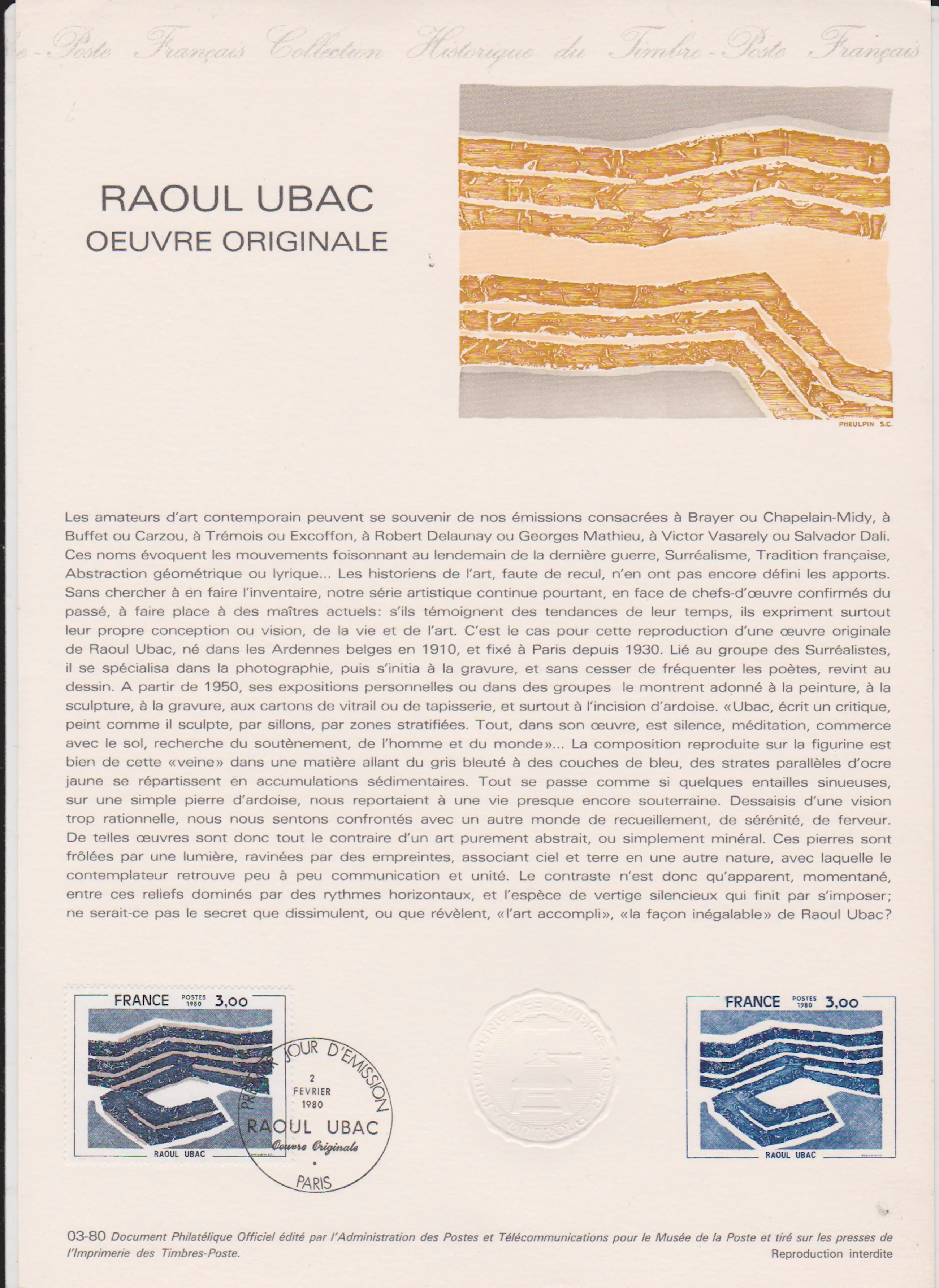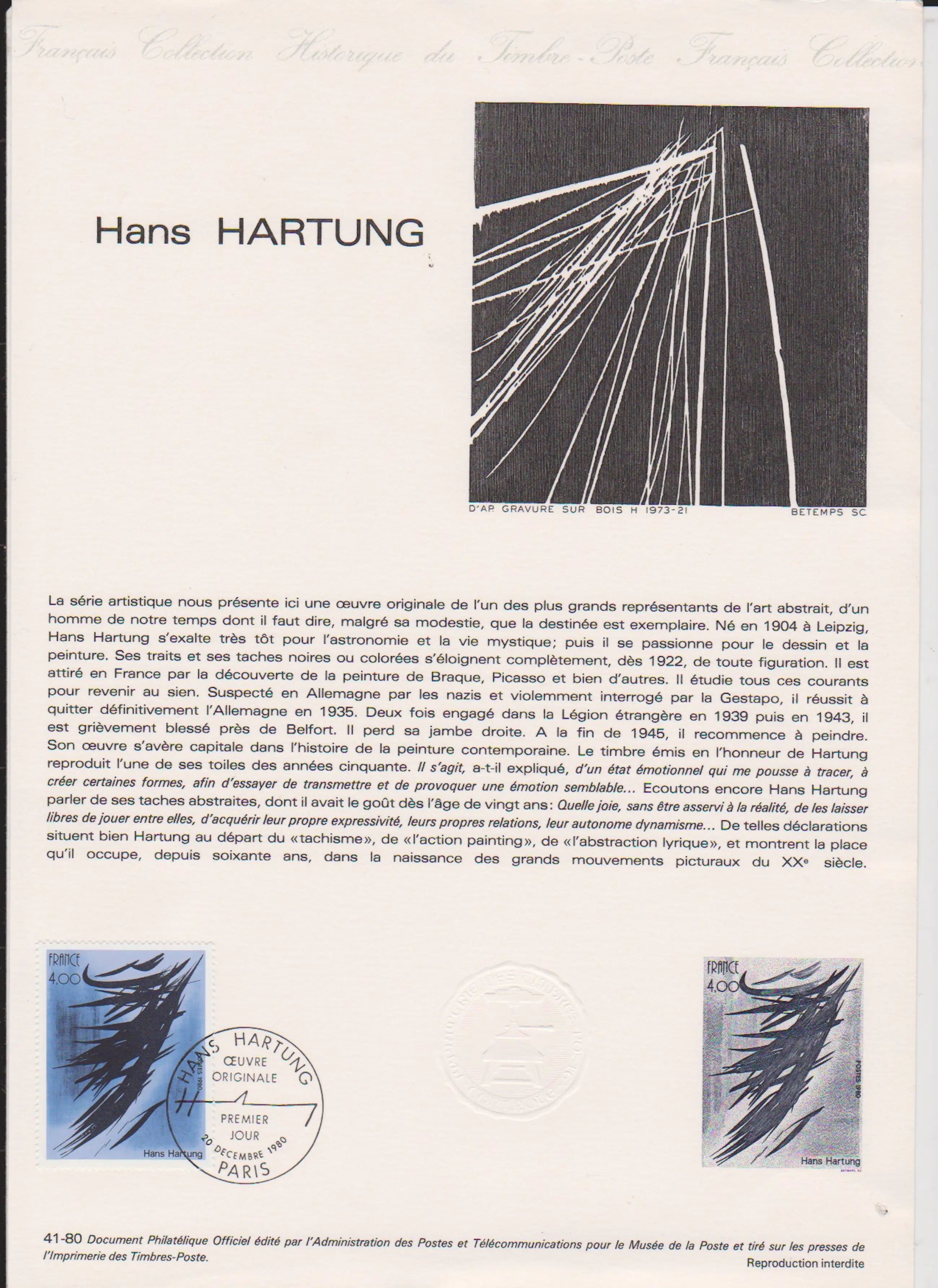 Collectie van 15 speciale bladen met drukken en postzegels diverse kunstenaars, uitgegeven door de Franse Post. Ieder blad bevat een speciale postzegel met speciaal stempel en een zgn. zwartdruk van de zegel + informatie over de kunstenaar. Interessante verzamel-items, maar ook geschikt om bijvoorbeeld in te lijsten.