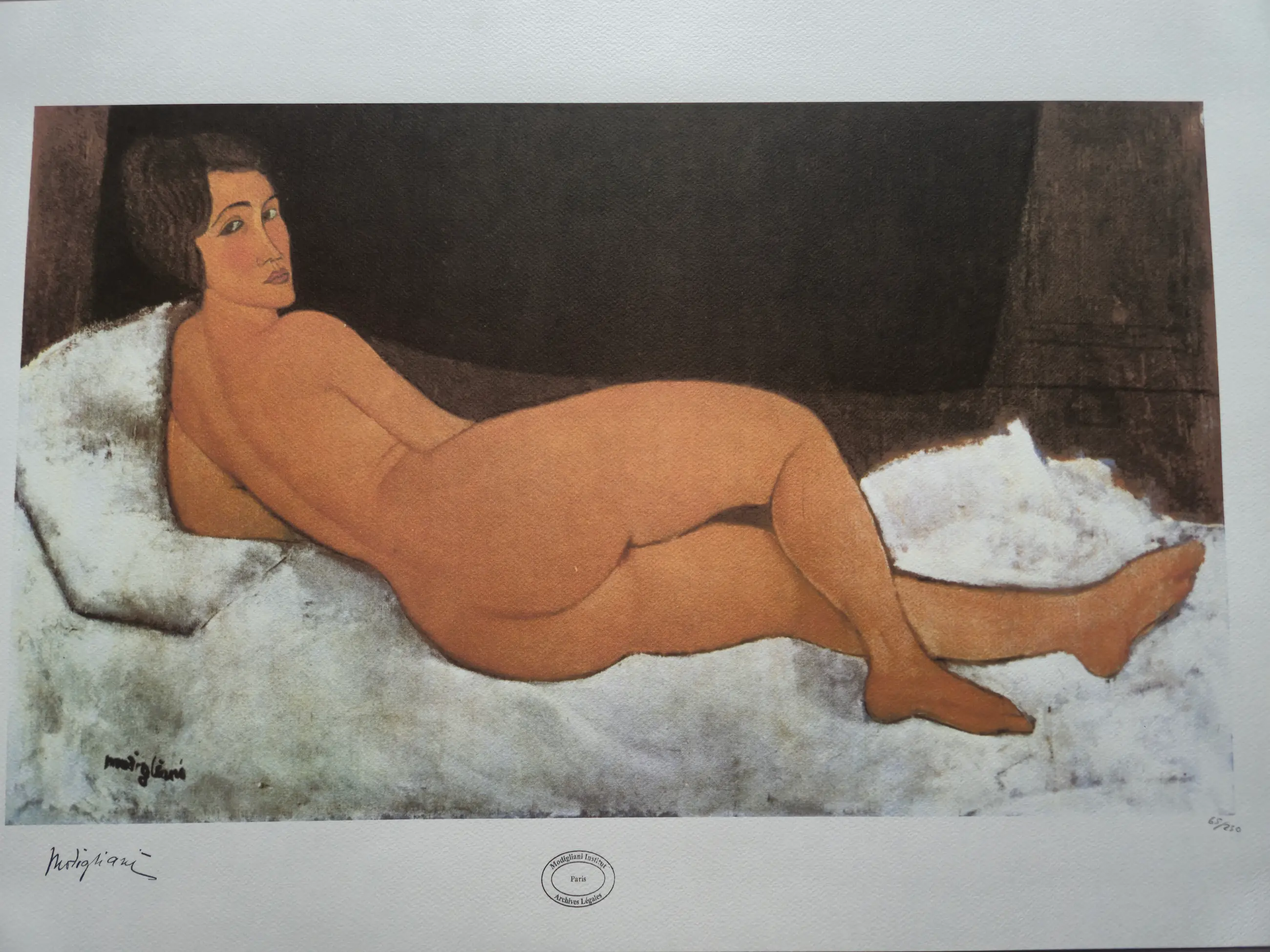 Te koop is een hoogwaardige prent naar een werk van Amedeo Modigliani met het motief “Liggend naakt”. Dit is een geautoriseerde facsimile-reproductie uitgegeven door Edizioni Jeanne Modigliani in samenwerking met het Modigliani Institut Archives Légales Paris