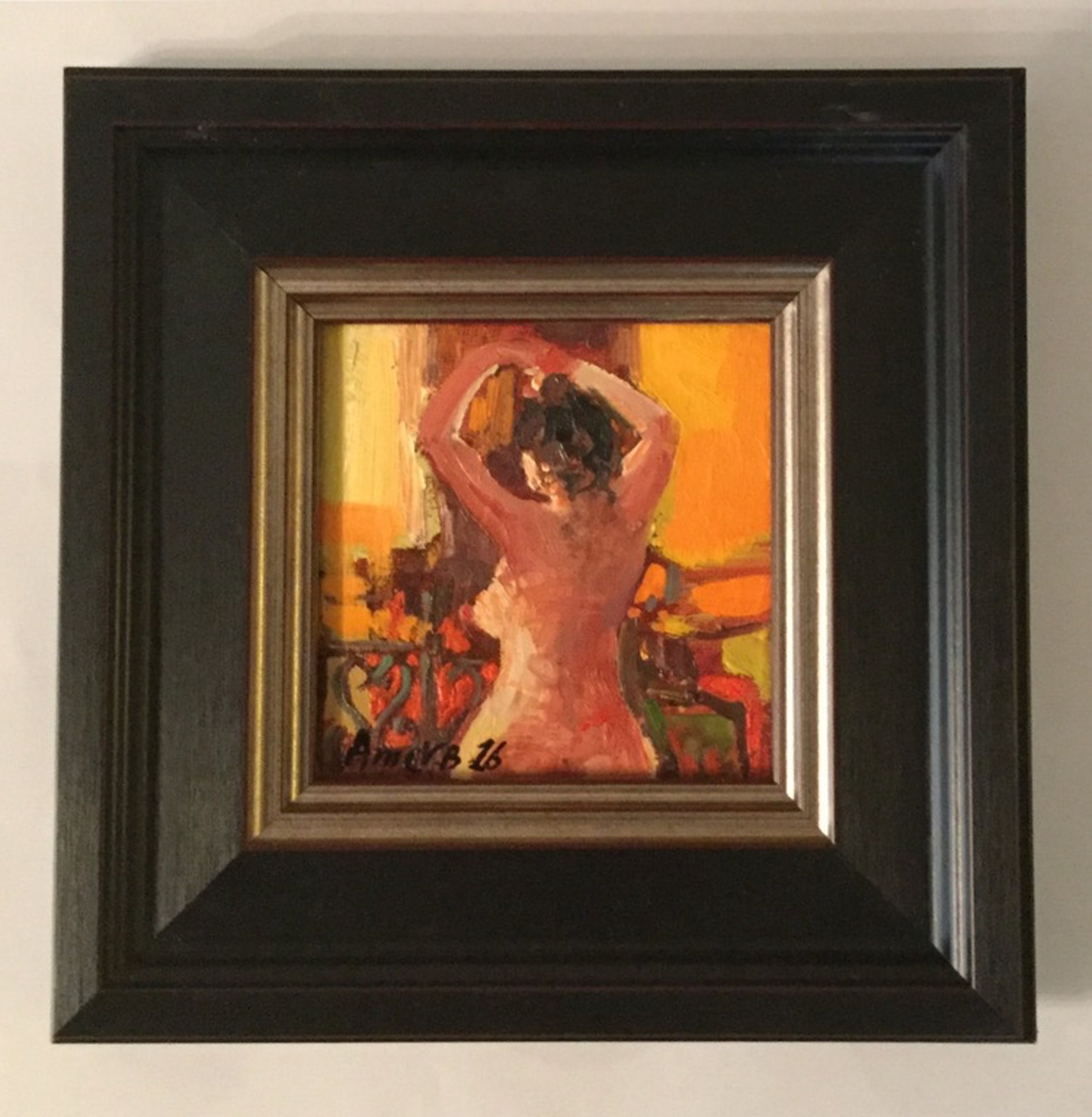 Amer Bader, irakees kunstschilderi, sinds 2010 in Nederland. Opgeleid universiteit Baghdad (Institute Fine Arts). Woond, werkte en exposeerde in Syrie en Jordanie. Techniek: olie op canvas. Afmetingen 10x10 cm. Ingelijst, afmeting lijst 19x19 cm. Handgesigneerd, met certificaat van echtheid, ondertekend door kunstenaar zelf.