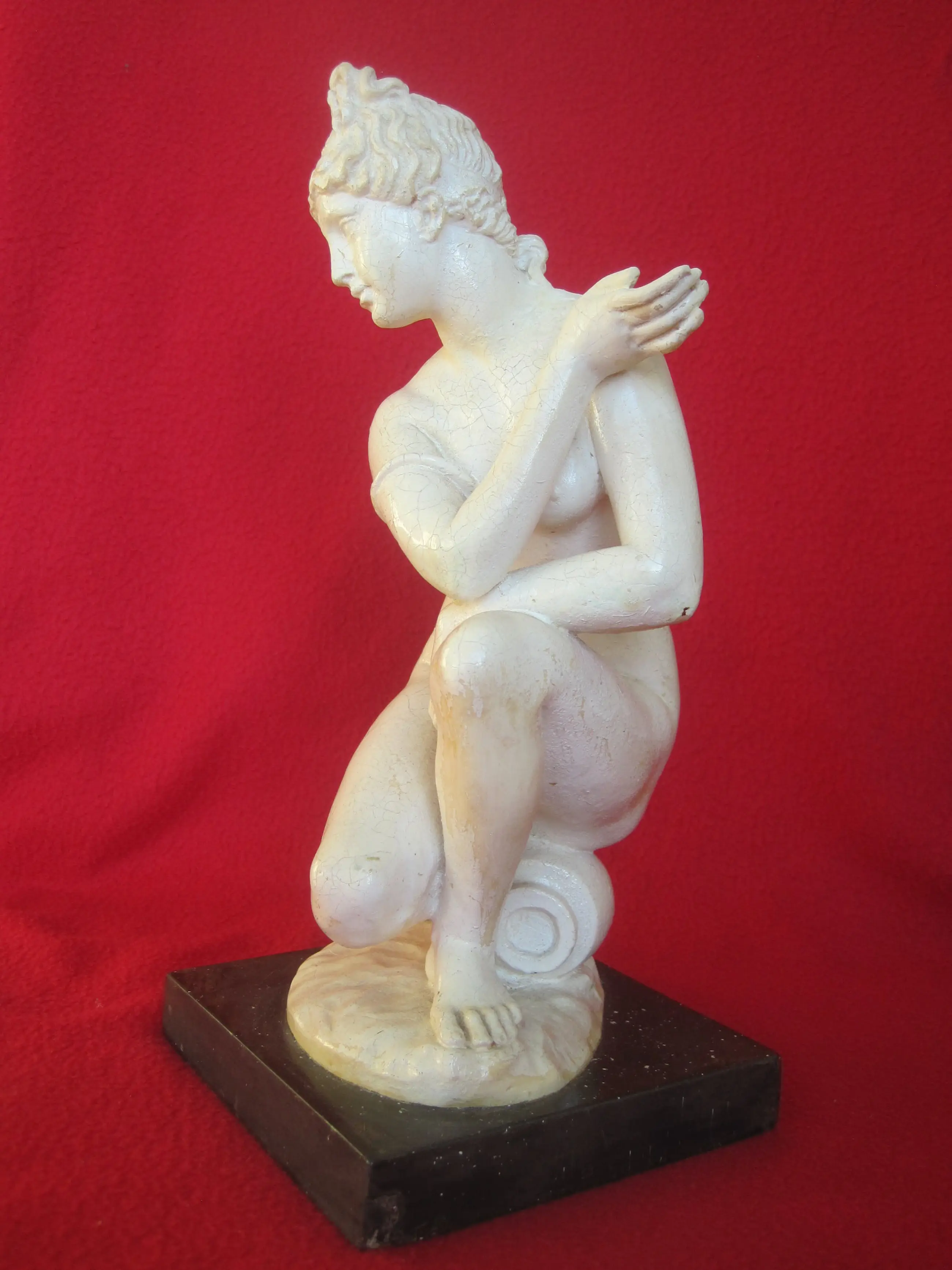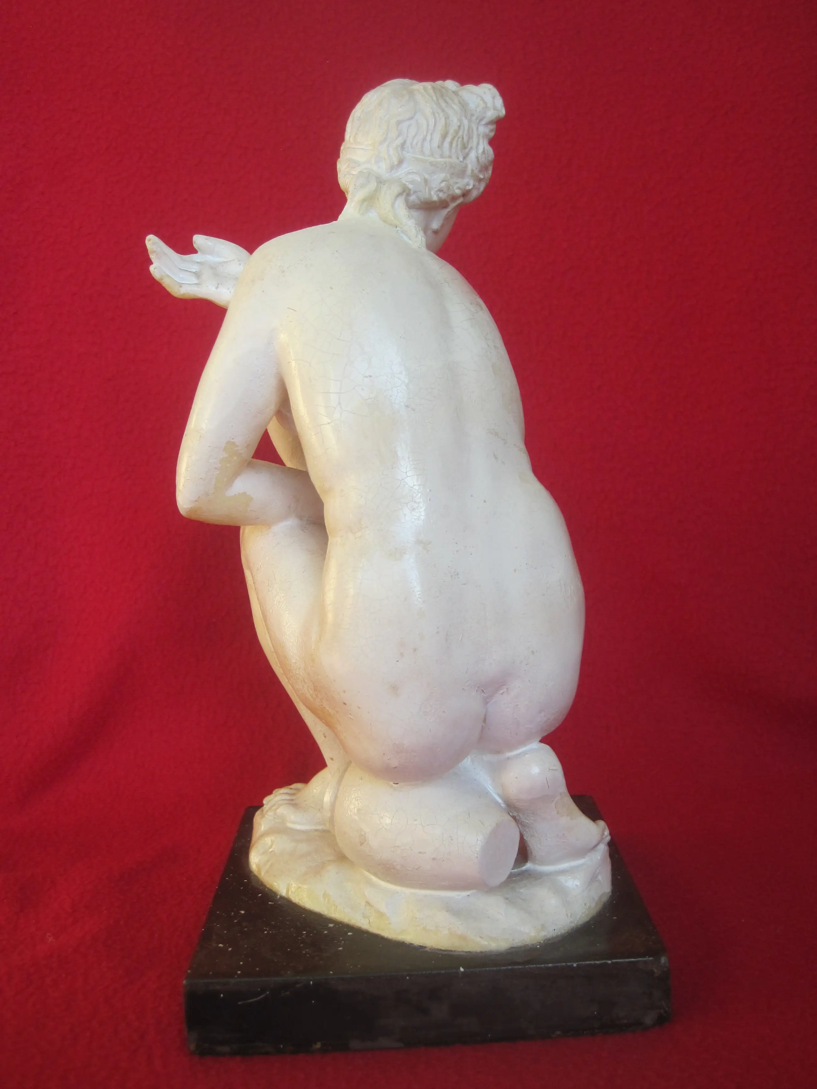 Een beeldje voorstellende een hurkende Venus door A. Santini. Dit mooie beeldje is van kunststof en bedekt met een craquelé verf die op sommige plaatsen gesleten is. Kijkt u aub goed naar de foto's.