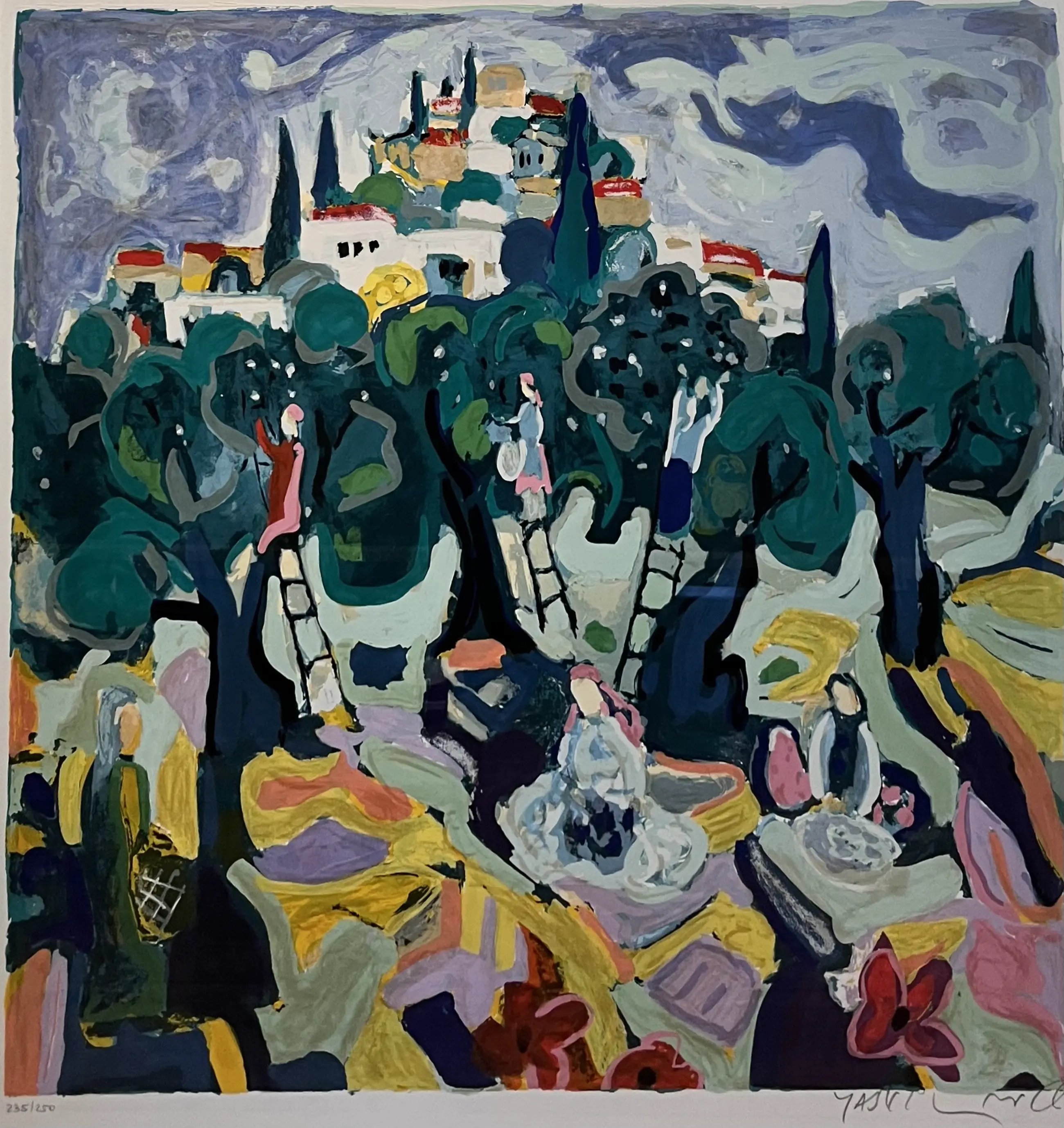 Fraai kleurrijk en groot werk van Amos Yaskil met passe partout en lijst. De lijst is niet nieuw maar goed toonbaar. Het werk kan zo aan de muur worden opgehangen. Het werk kunt u vooraf komen bekijken en beoordelen. Het werk kan na aankoop afgehaald worden bij galerie Rotor in Gorcum of verzonden worden per koerier worden verzonden binnen Nederland en België. U kunt het werk ook laten opslaan in onze opslagkamer en in een later stadium ophalen. De foto is door het glas van de omlijsting heen genomen. Verzenden oer koerier.