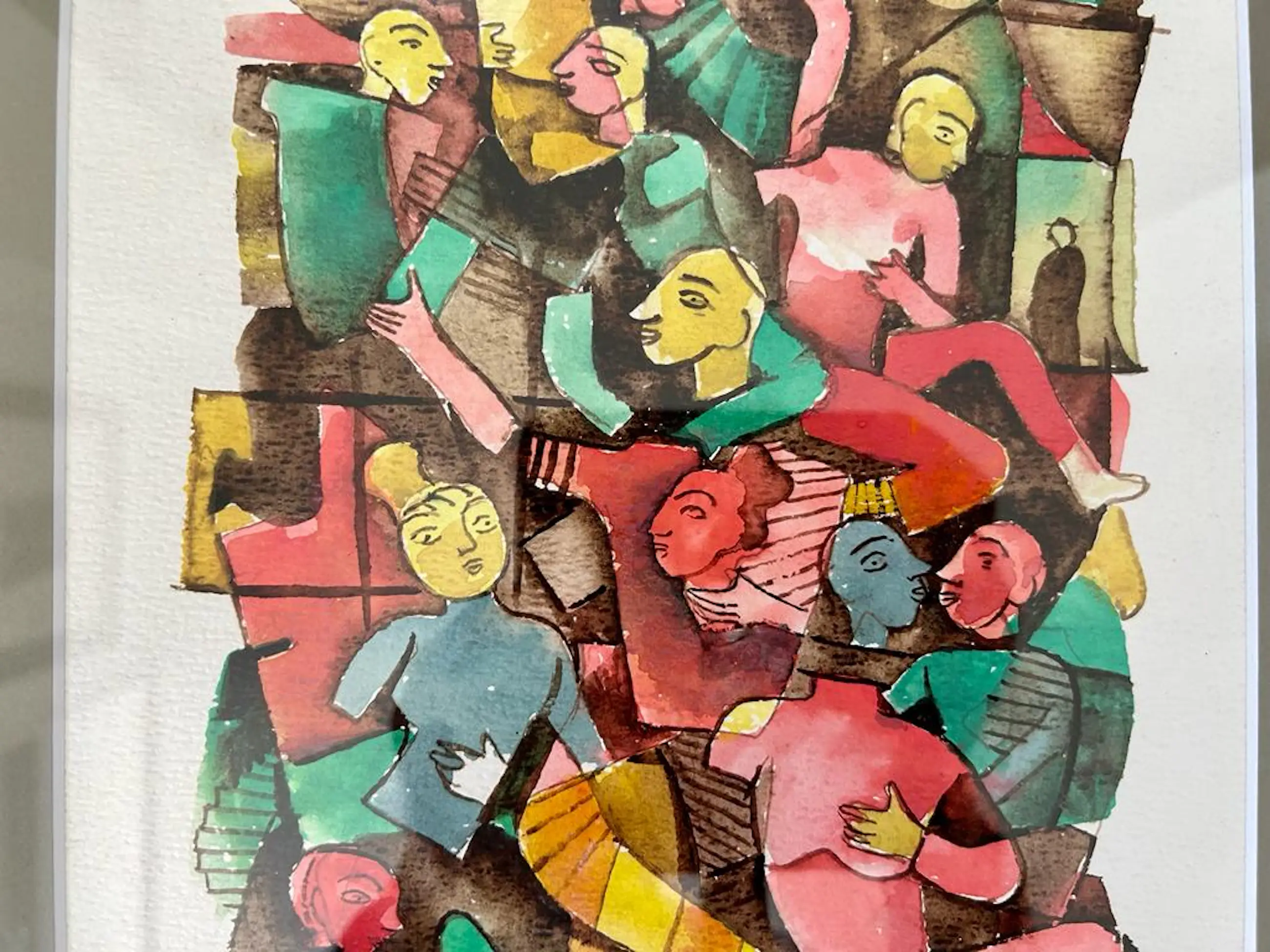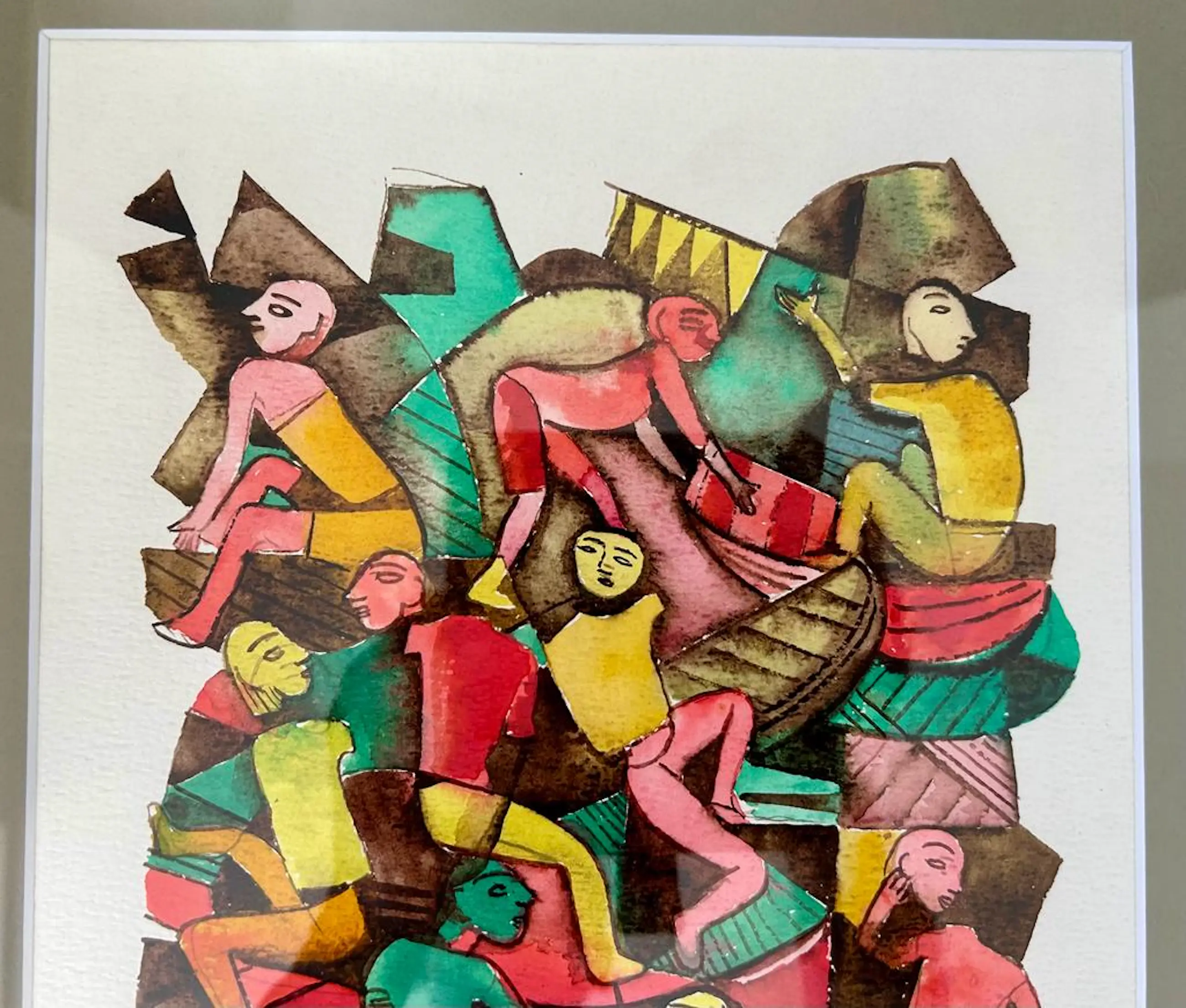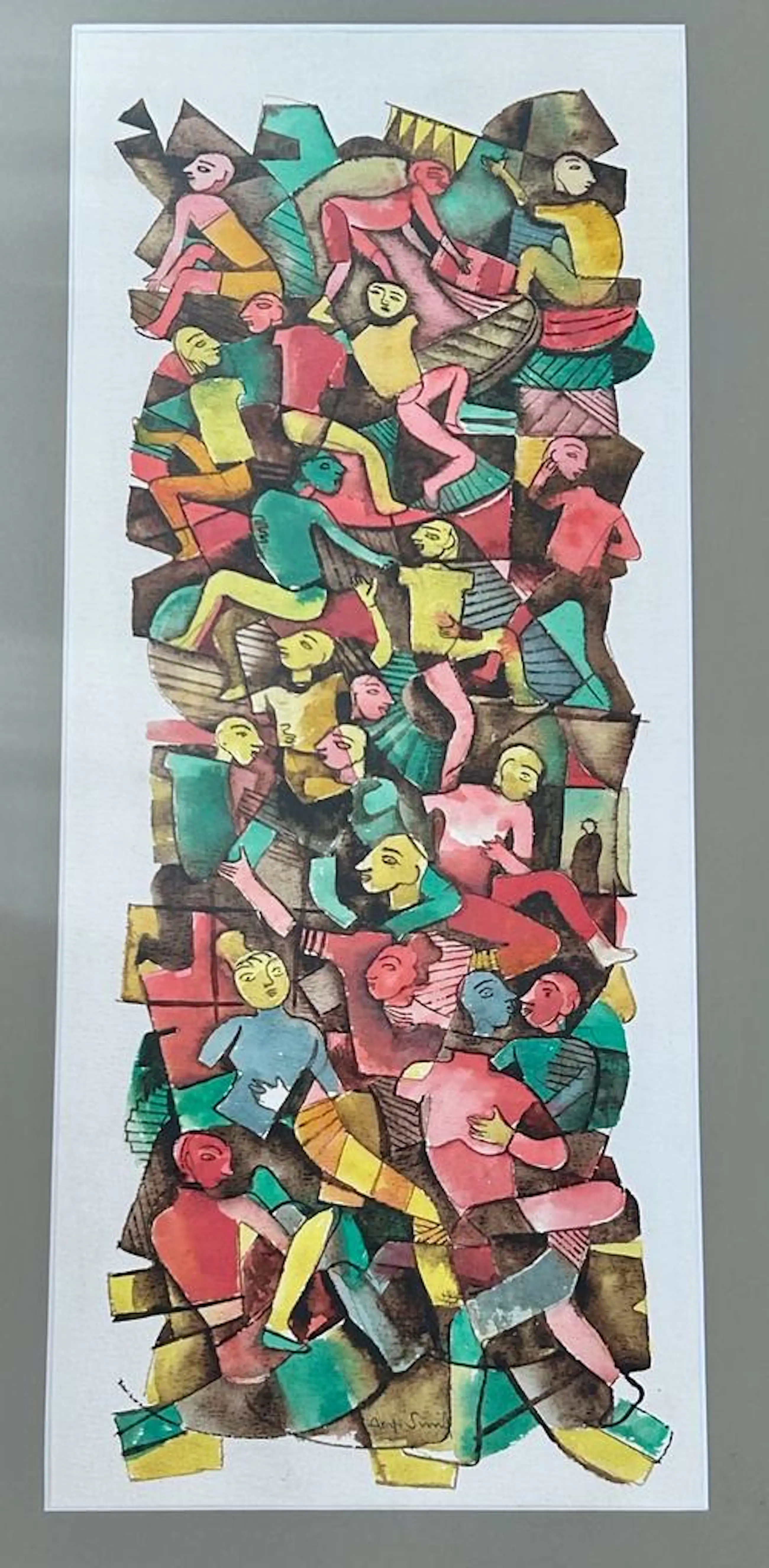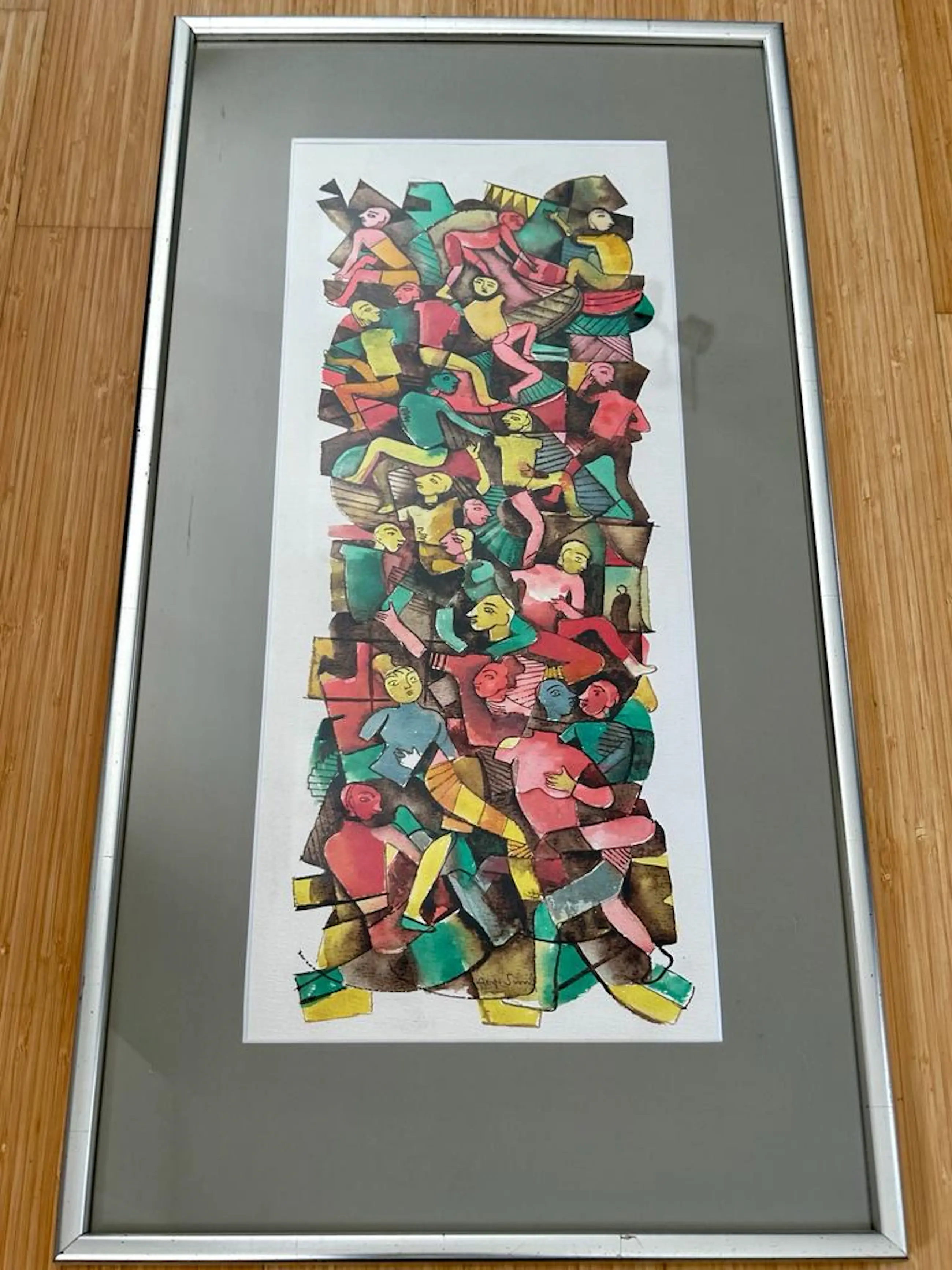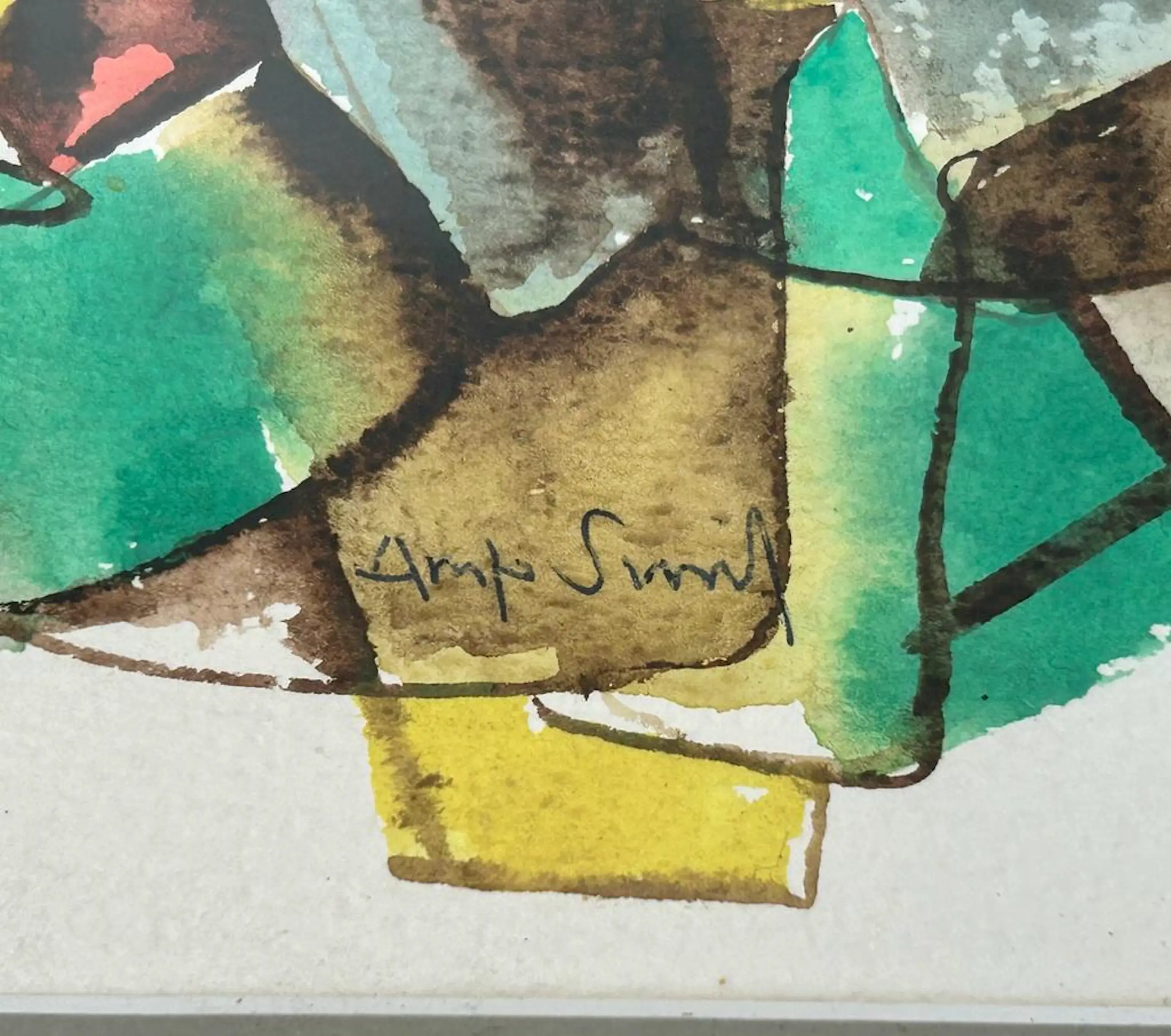 Bijzondere aquarel van Amp Smit uit de jaren vijftig. Speelse afbeelding van dansers. Mooi ingelijst. In verband met de kwetsbaarheid heeft ophalen de voorkeur.