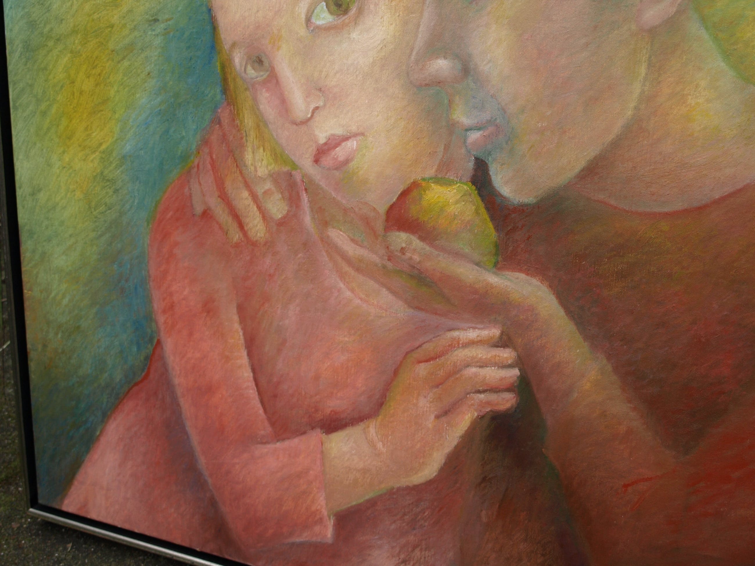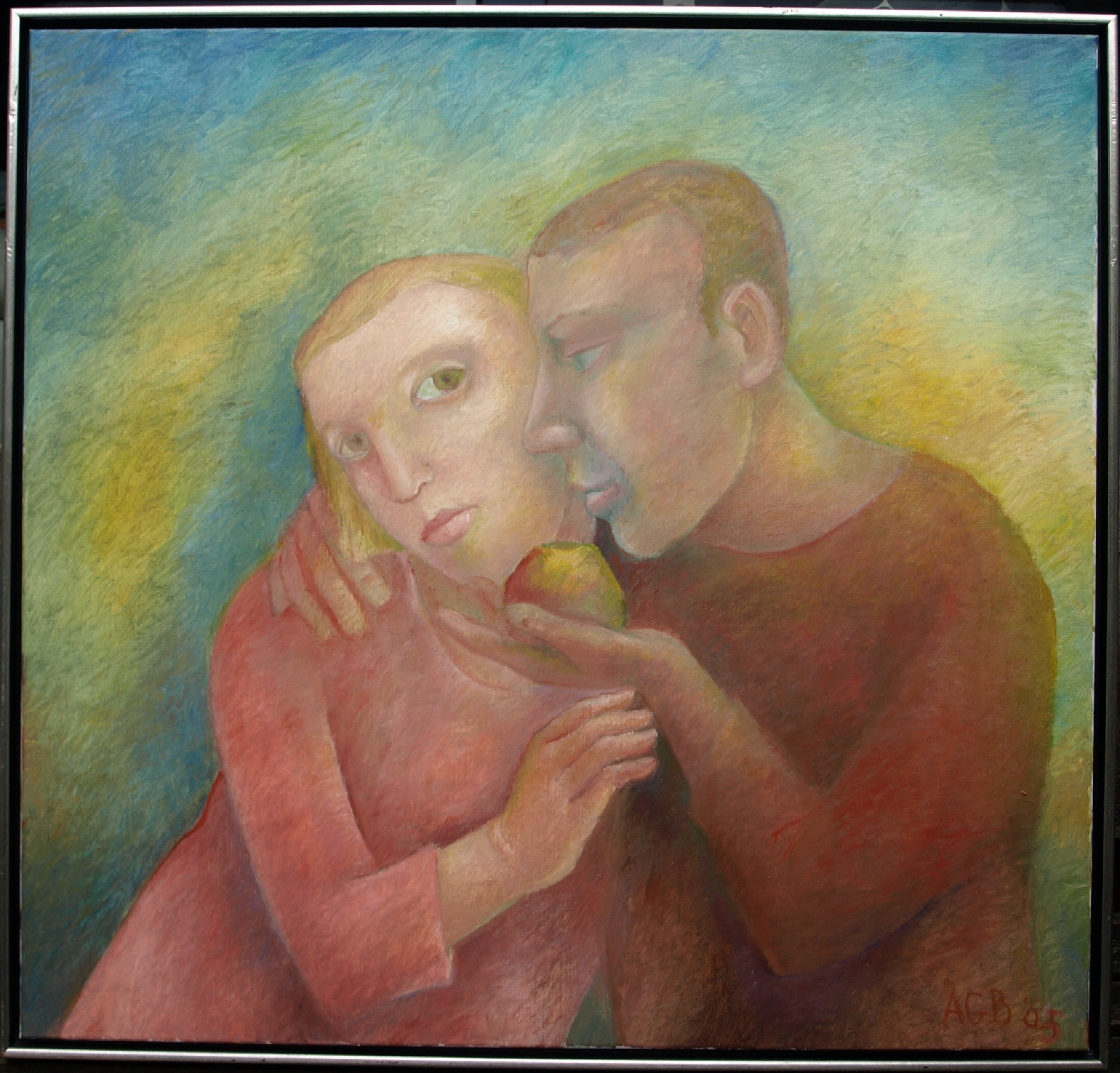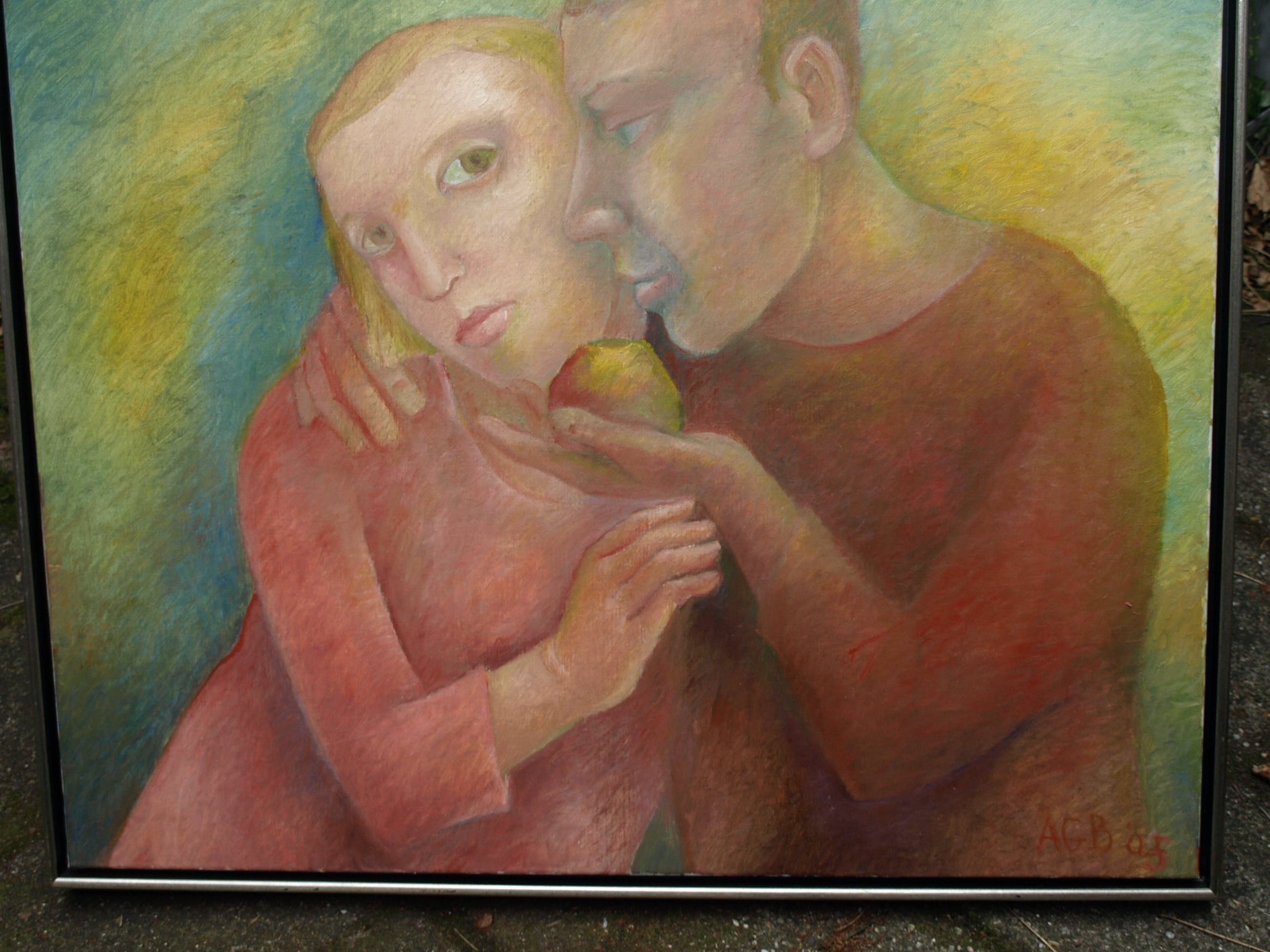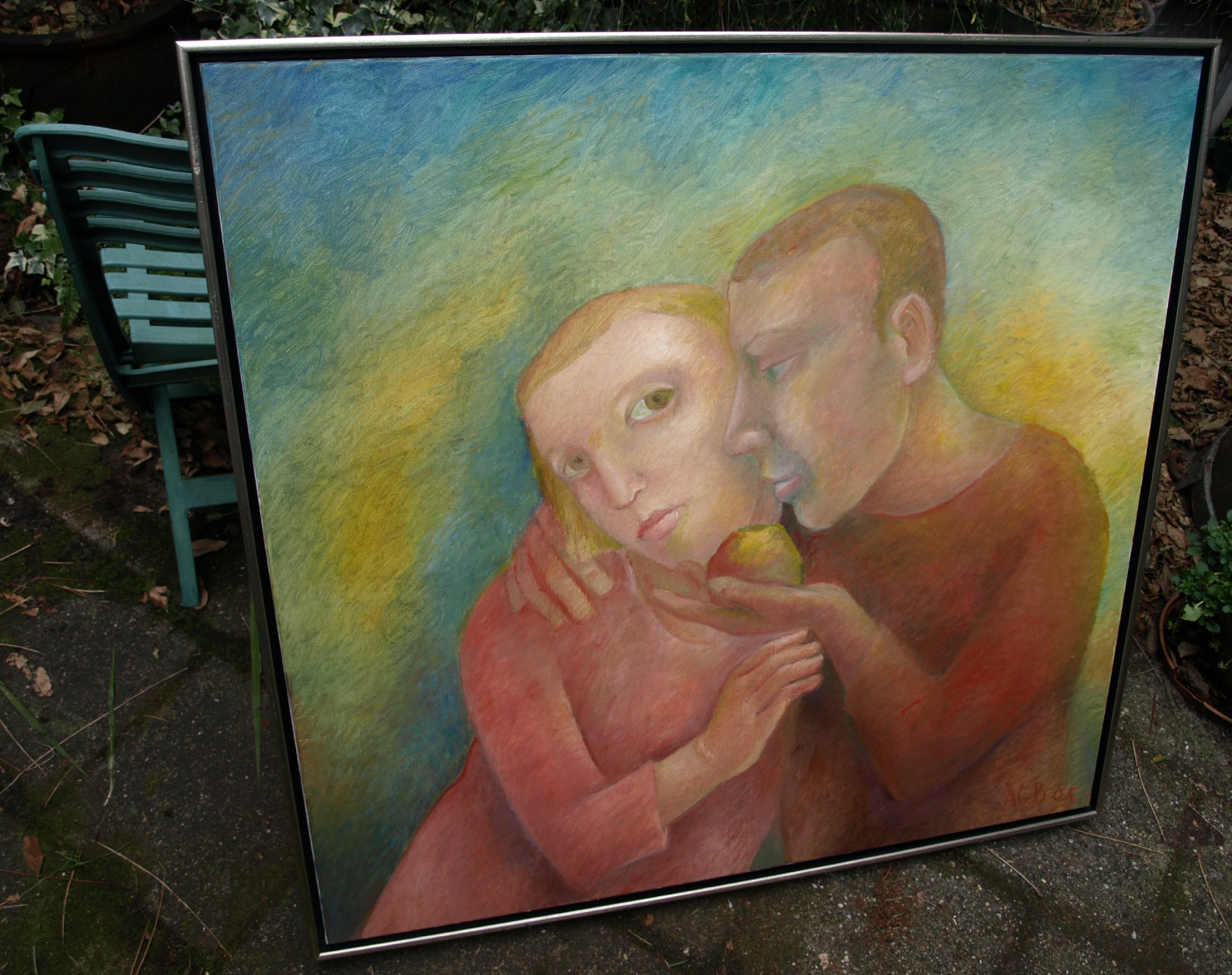 Een groot ingelijst schilderij uit 2005 van de Nederlandse kunstenares An Goedewagen-Beerman (1928-2014), getiteld “Verleiding”. -Olieverf op linnen doek, opgespannen op een houten spieraam en ingelijst in een houten baklijst. -Gesigneerd ('A.G.B.') en gedateerd rechtsonder en ook met informatie op stickers op de achterkant van de lijst. -Afmetingen: Lijst, 93,5 x 98,5 cm. Beeld, 90 x 95 cm. -Herkomst: Galerie Meander, Zevenaar. De oorspronkelijk galerieprijs was € 1100,-. -Conditie: Het werk is in zeer goede staat. De lijst heeft slijtplekjes. Zie ook de foto’s. Kan zo aan de muur.