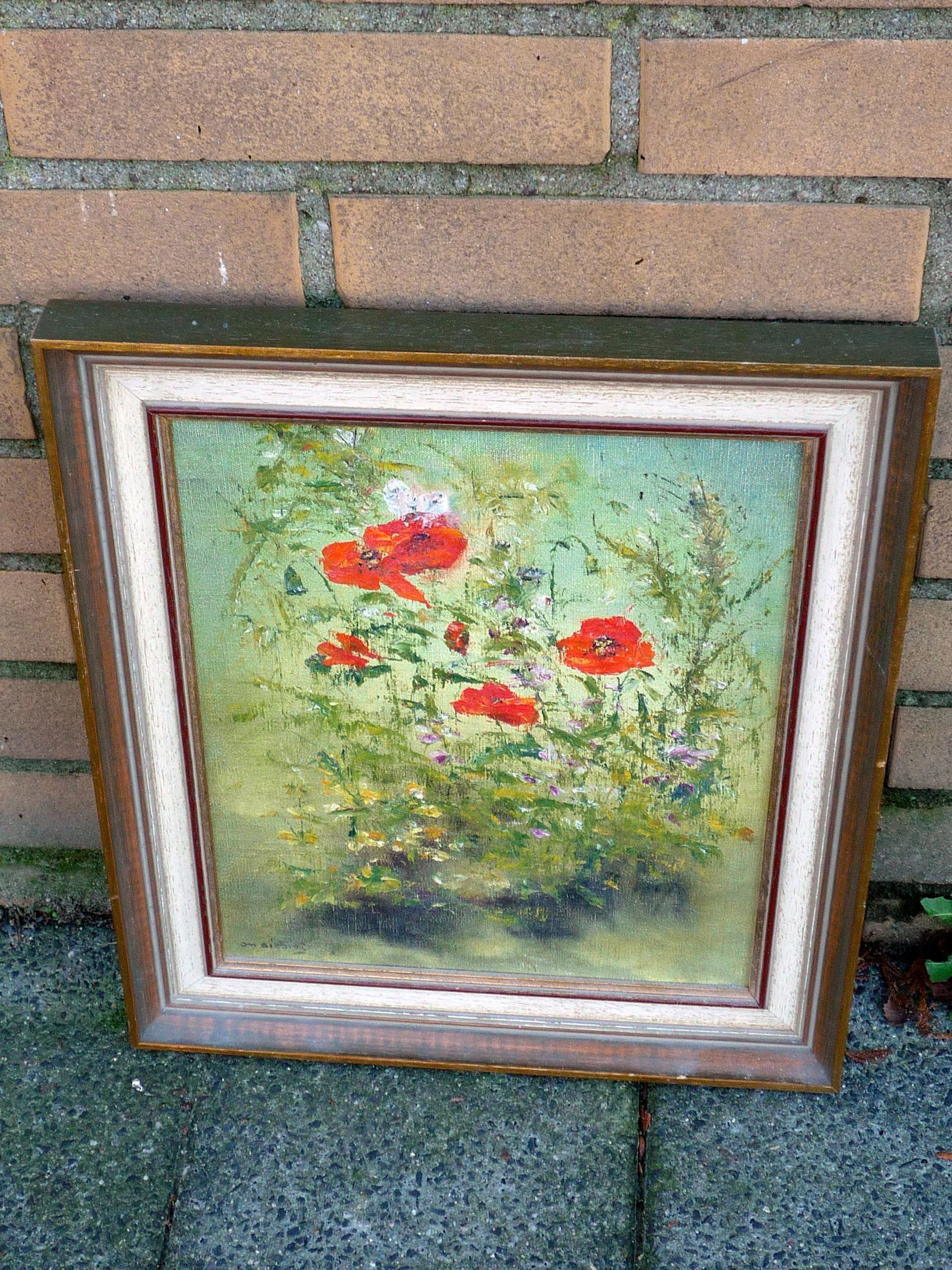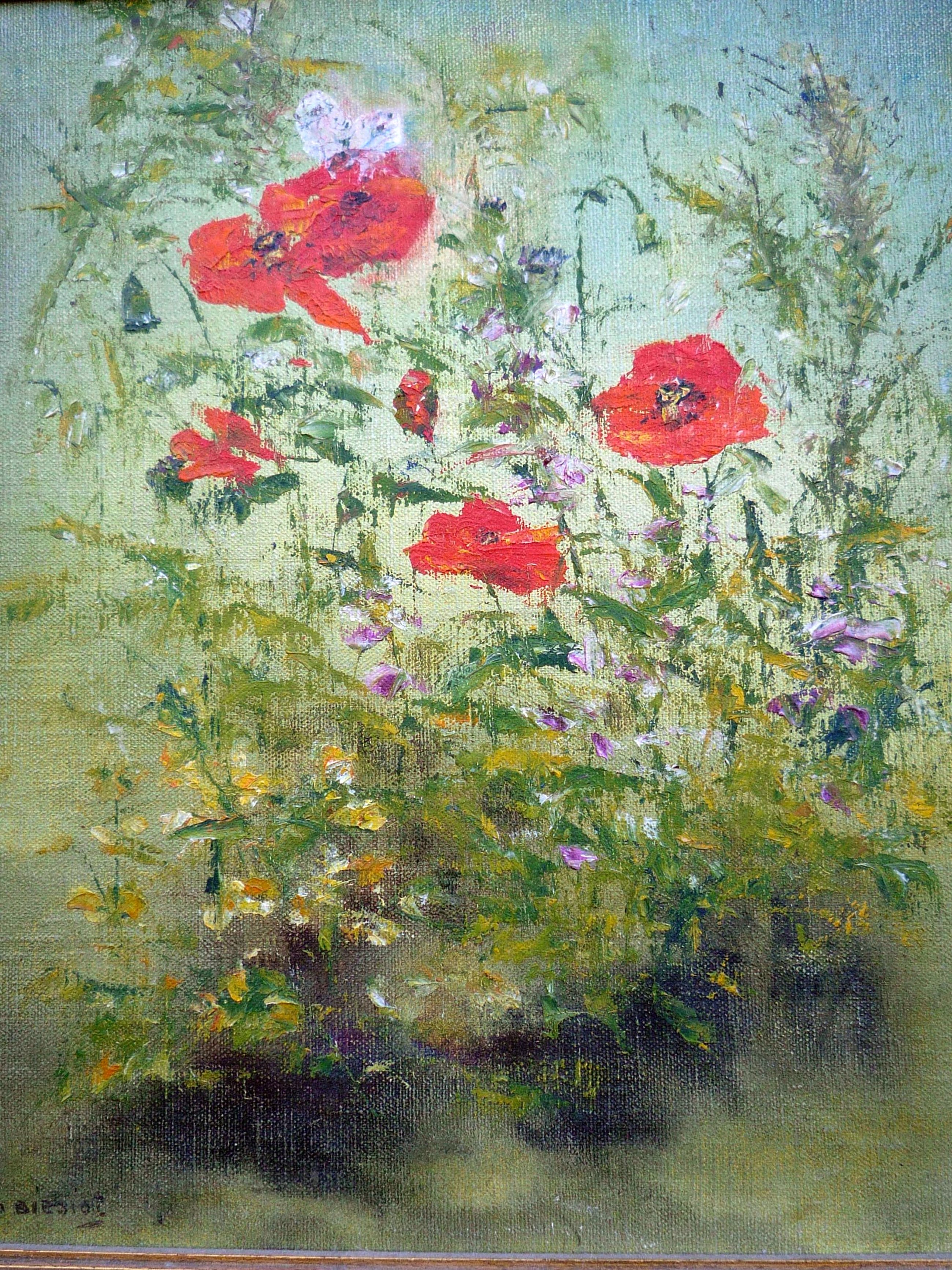 Een zeer sfeervol schilderijtje met klaprozen in een weelderige tuin. Dit werk behoort tot de beste 10% van haar oeuvre.