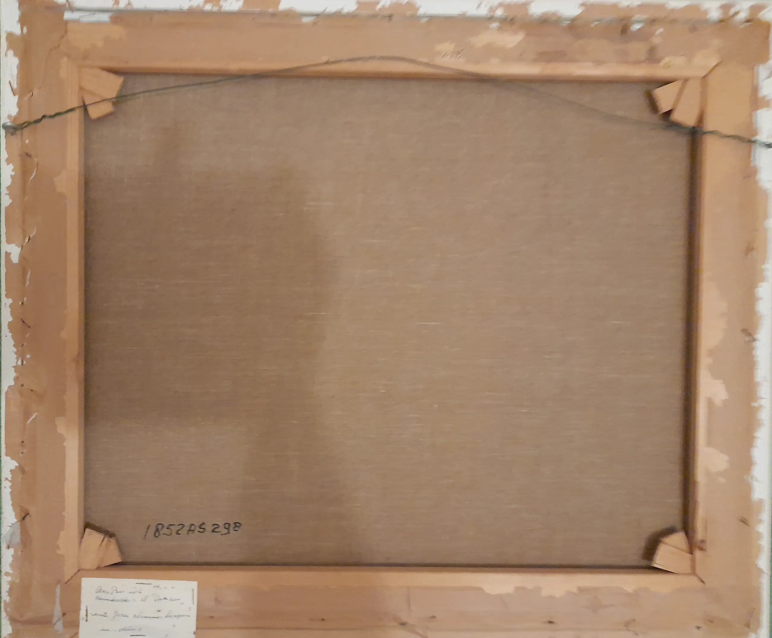 In blanken houten baklijst ingelijst olieverfwerk van An Biesiot. Dochter van kunstenaar Pieter Biesiot. Tot haar dood in 2006 schilderde ze nog iedere dag in het Rosa Spier Huis, het woon- en werkcentrum voor oudere kunstenaars en wetenschappers in Laren, ‘t Gooi.