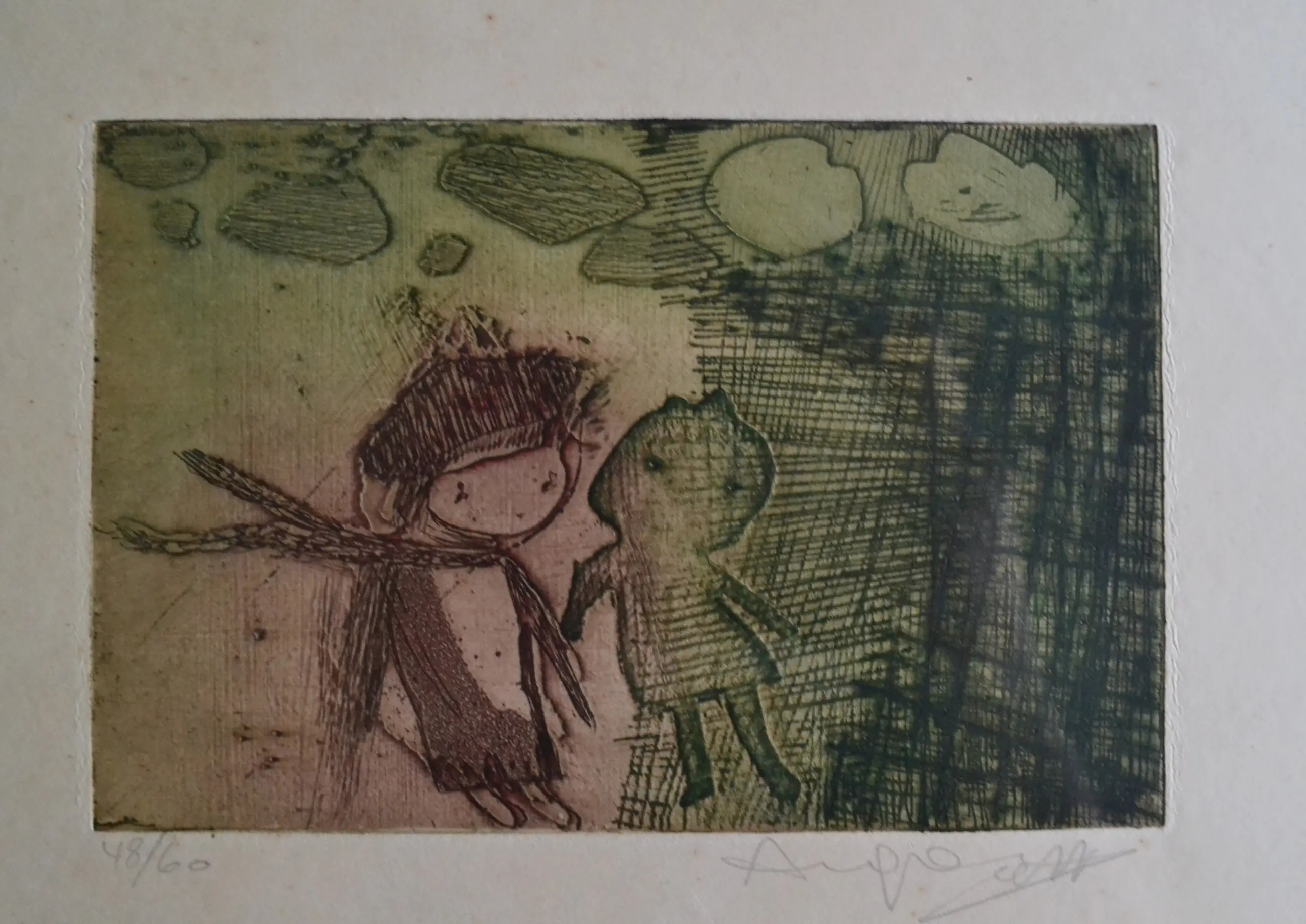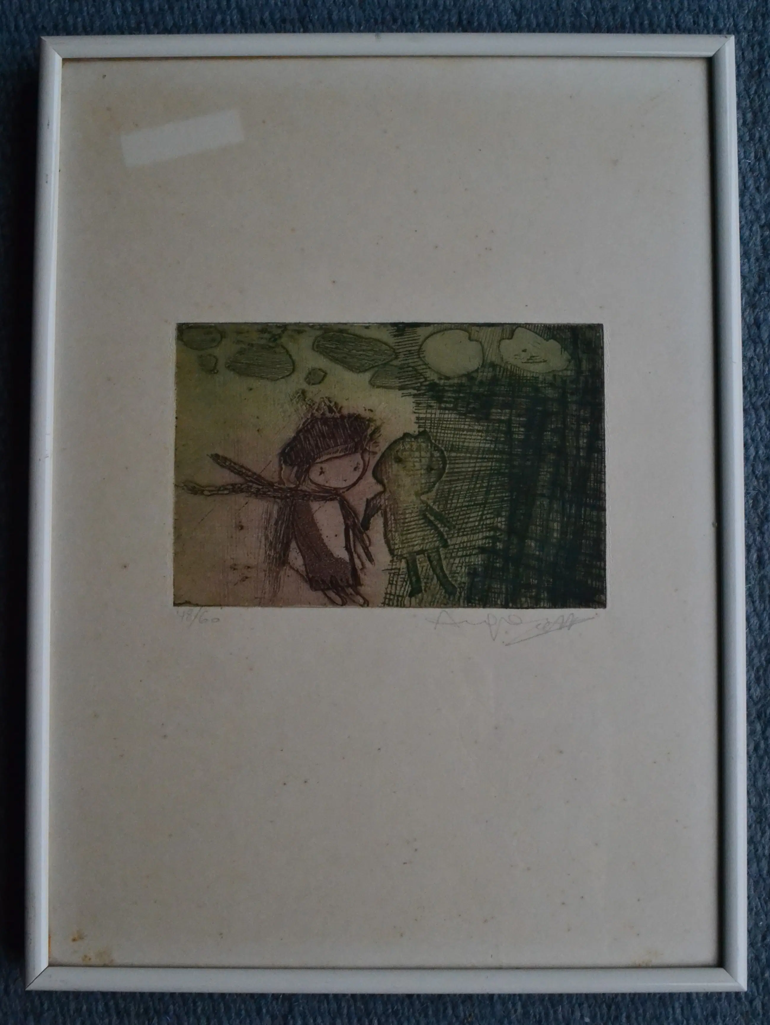 typische An Goris kleurenets die twee figuren in een geabstraheert landschap voorstelt