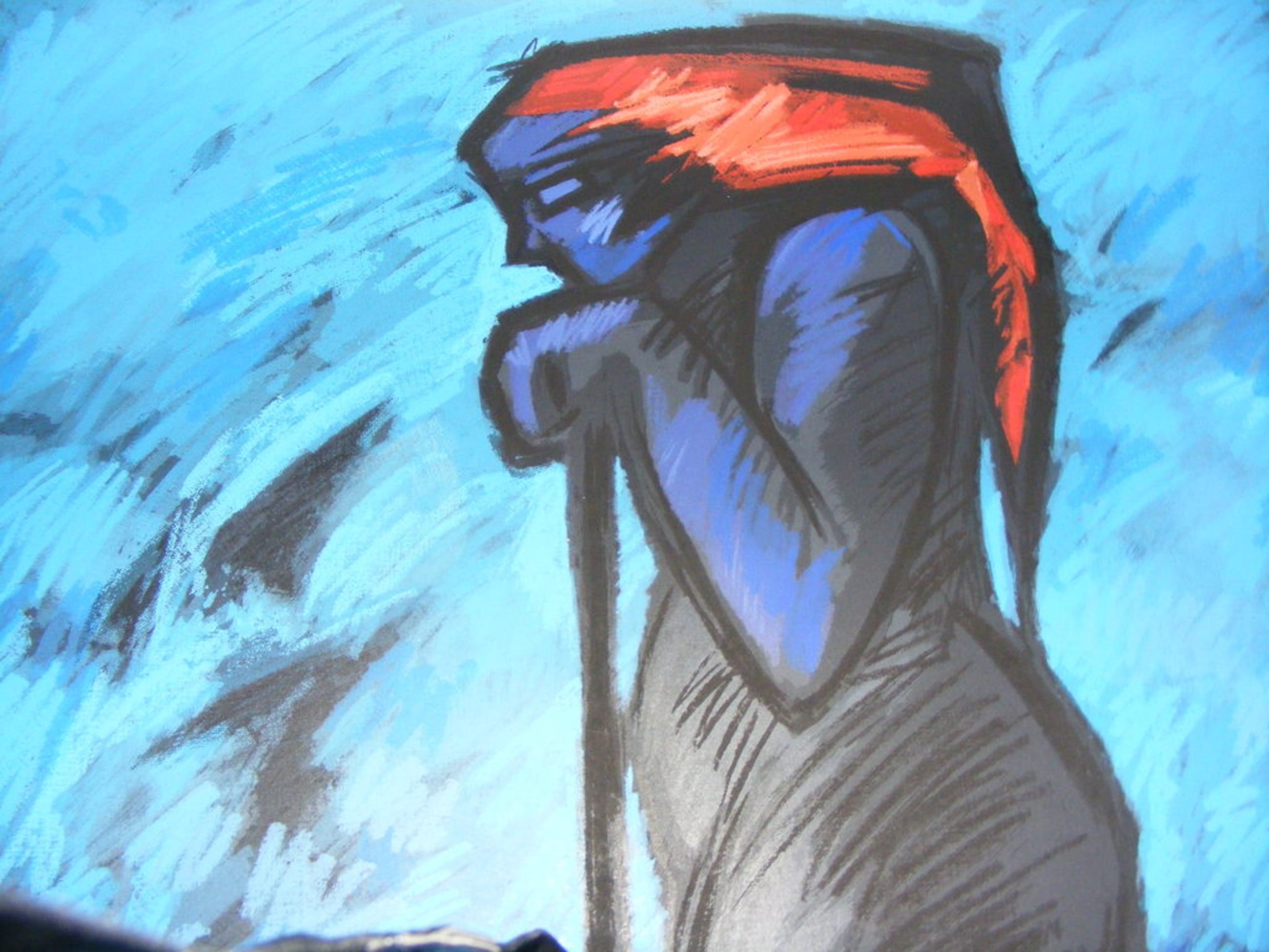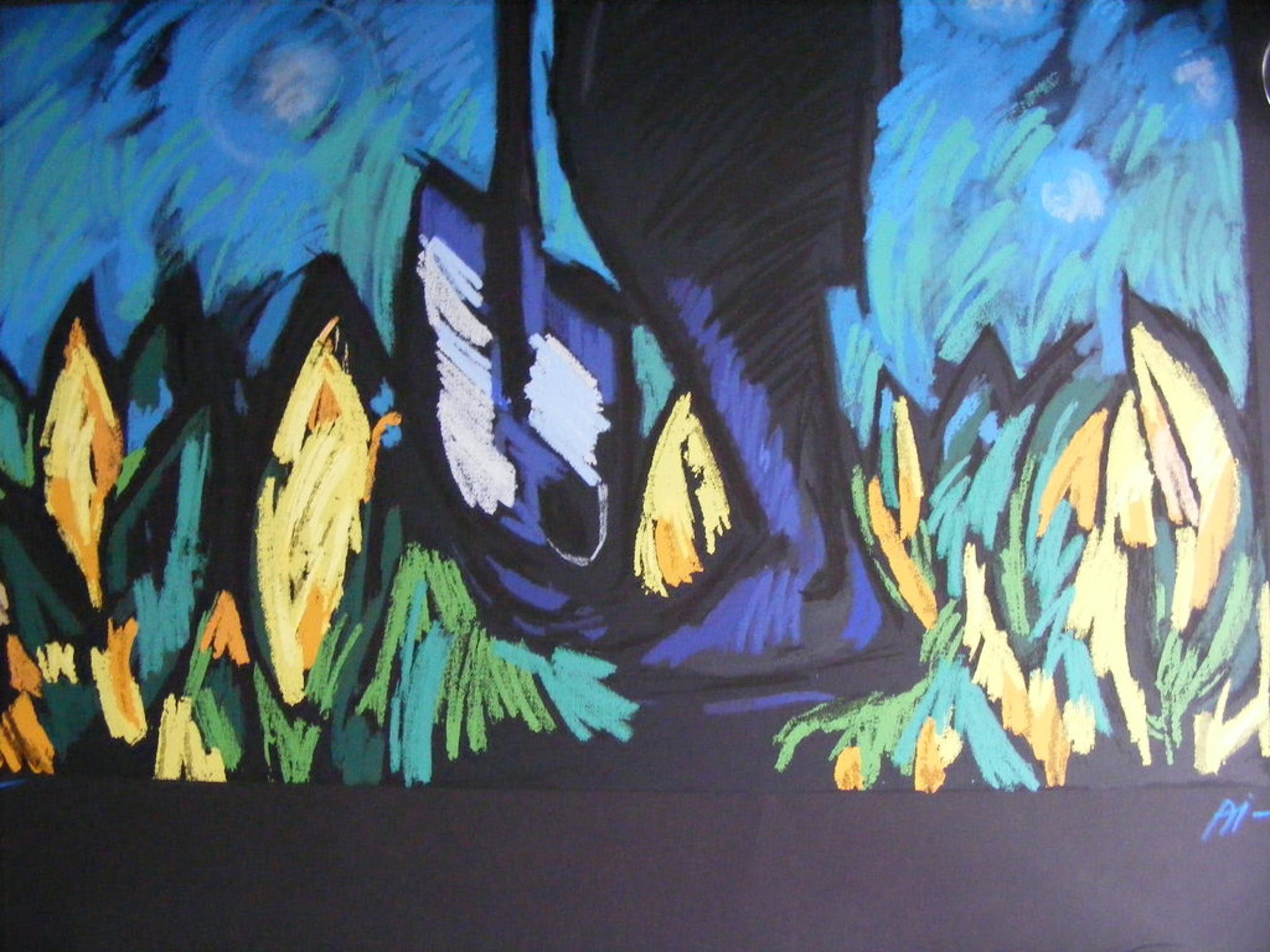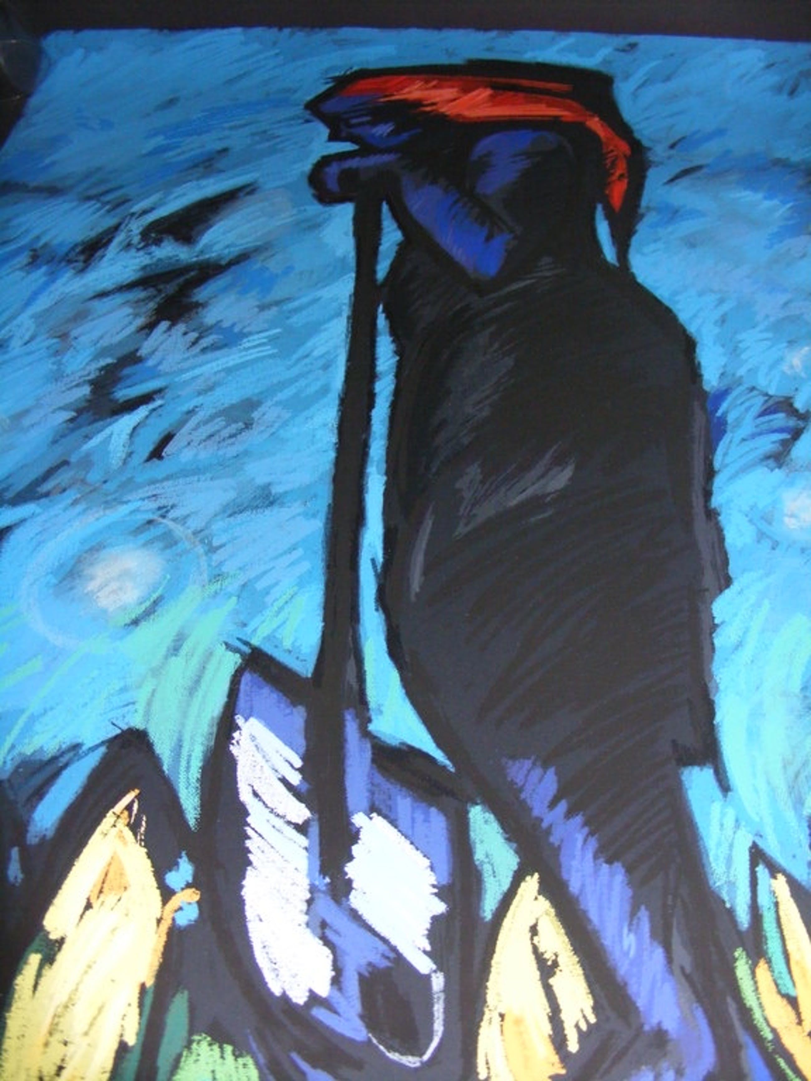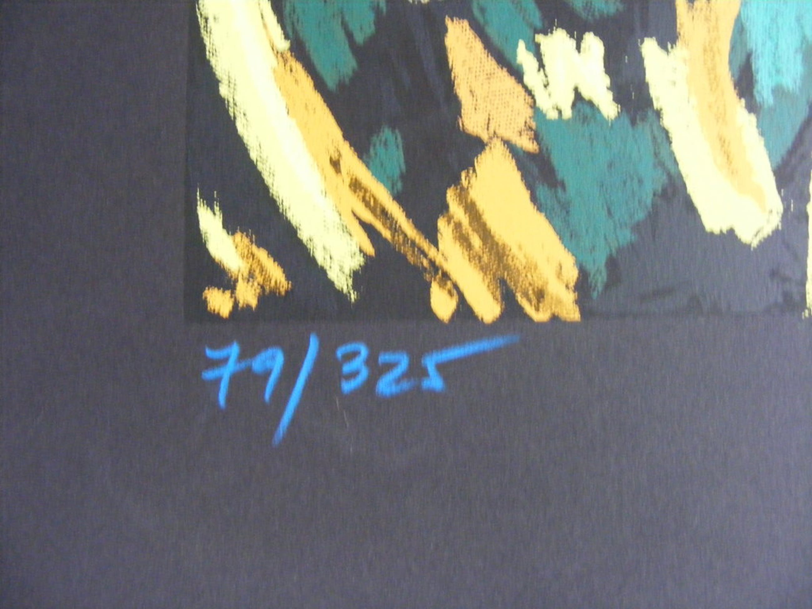 Van de authentieke kunstenares Anca Ionescu een bijzonder in het oog springende zeefdruk op zwart "Frans" papier, uit gelimiteerde oplage.