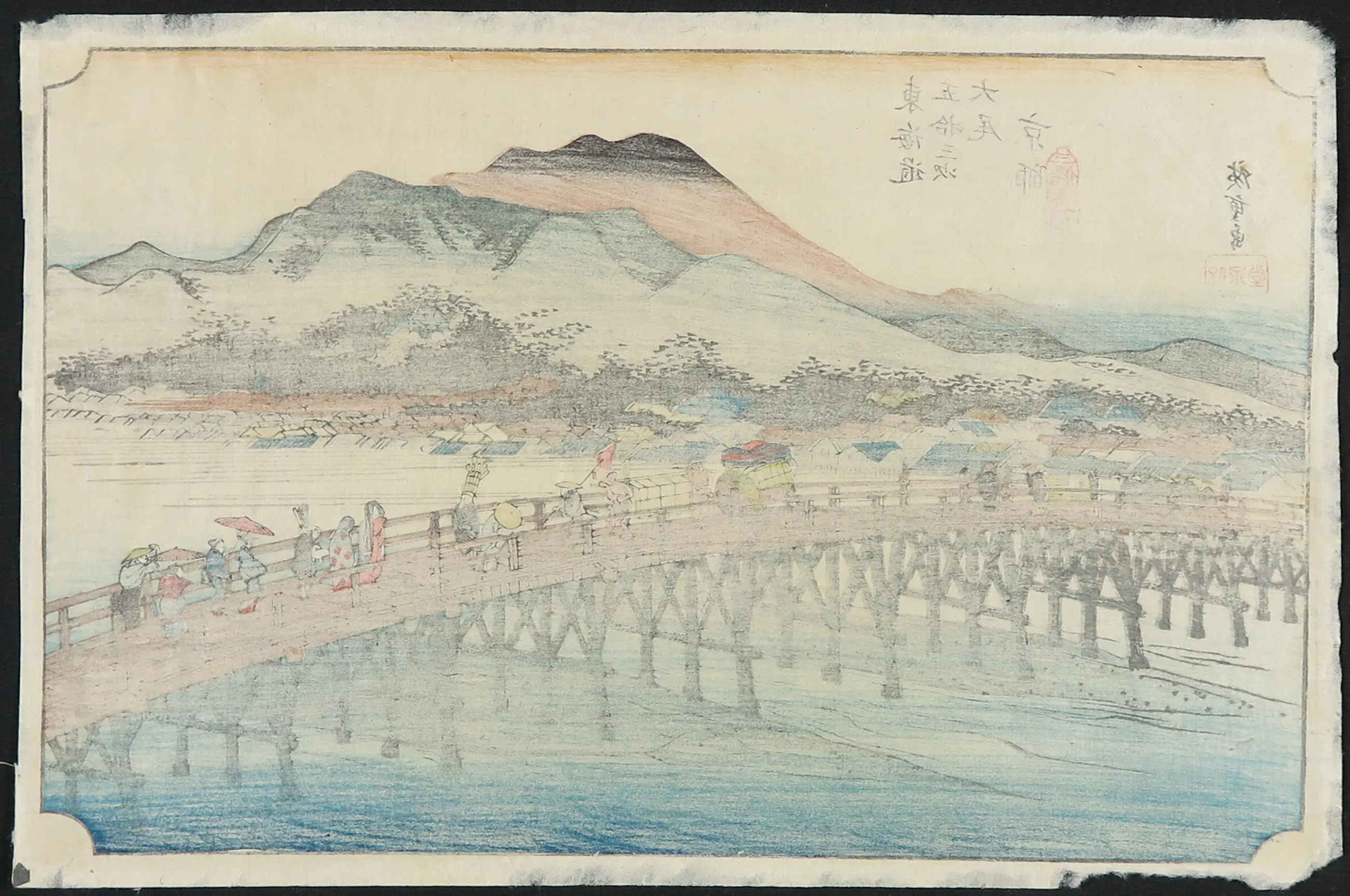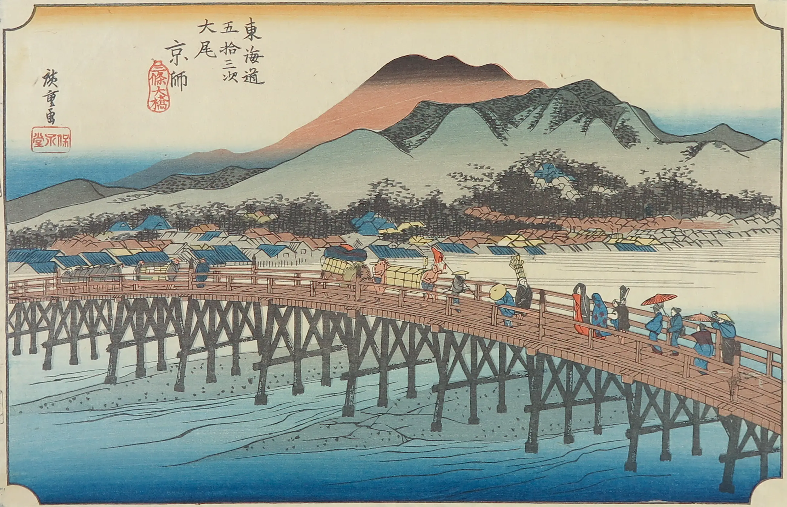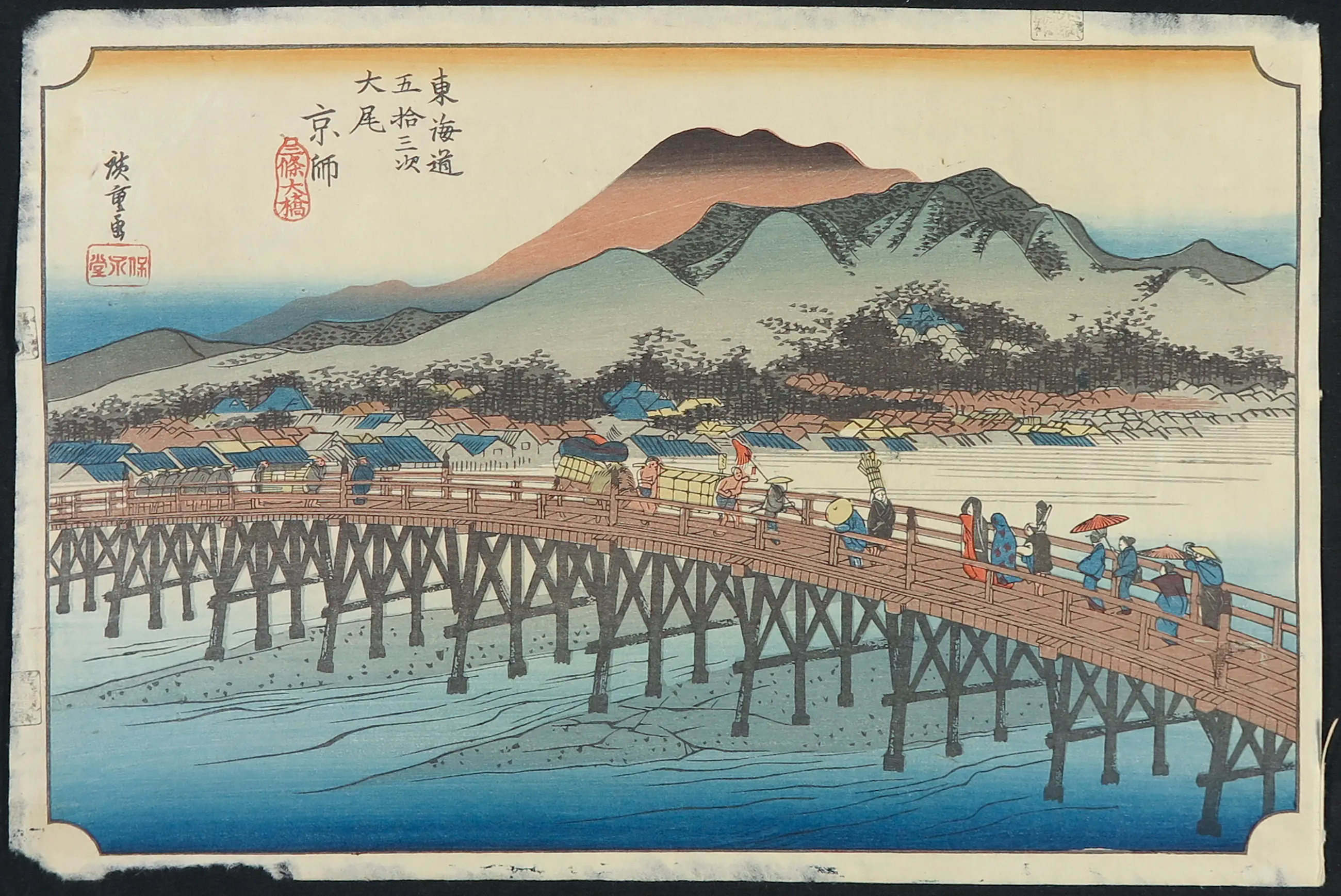 Ukiyo-e houtdruk uit de serie The 53 Stations of the Tokaido door Ando Hiroshige. Dit betreft nummer 55 uit de reeks, getiteld Arriving at Kyoto. Dit is de laatste afbeelding uit de serie.