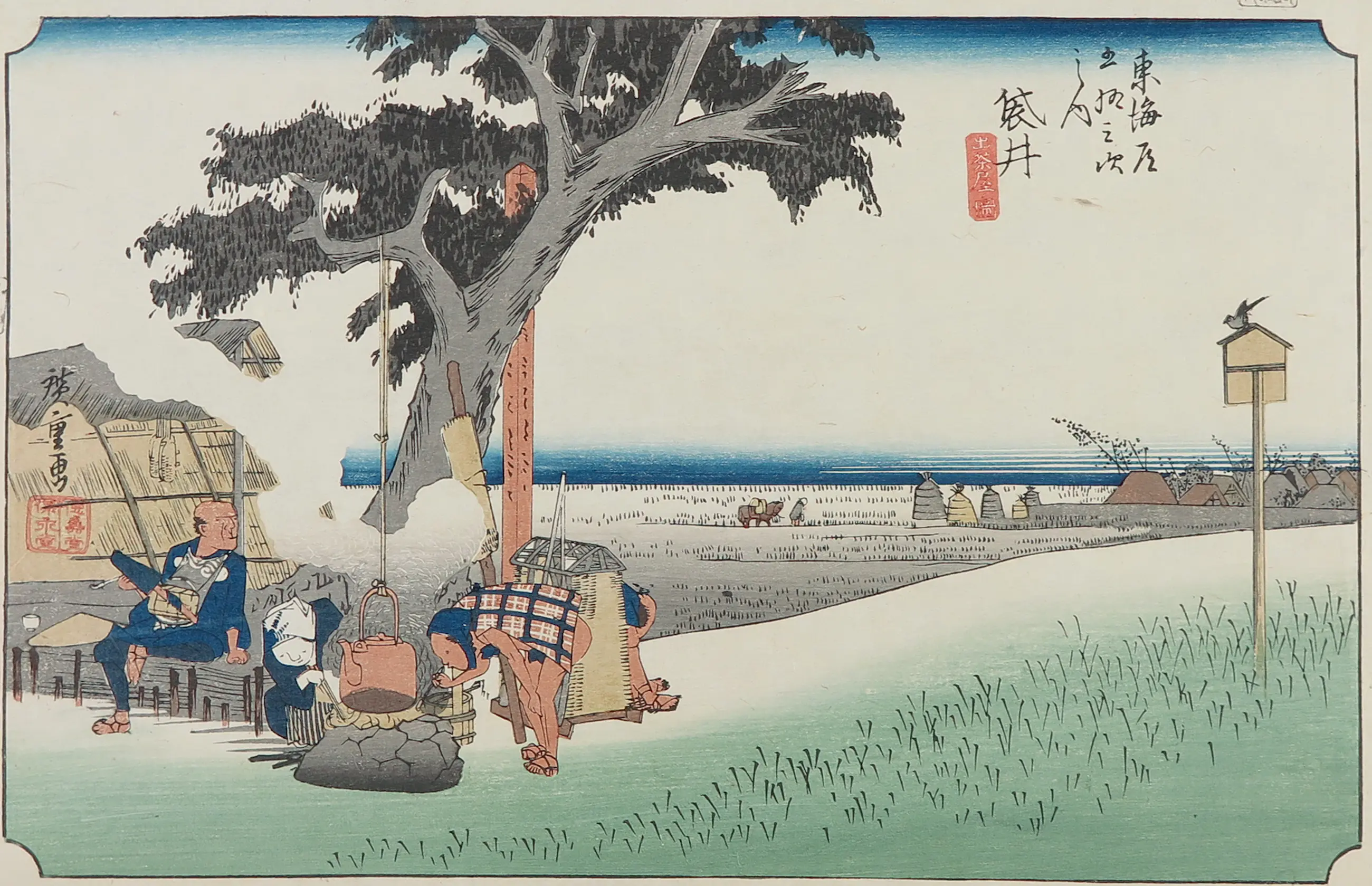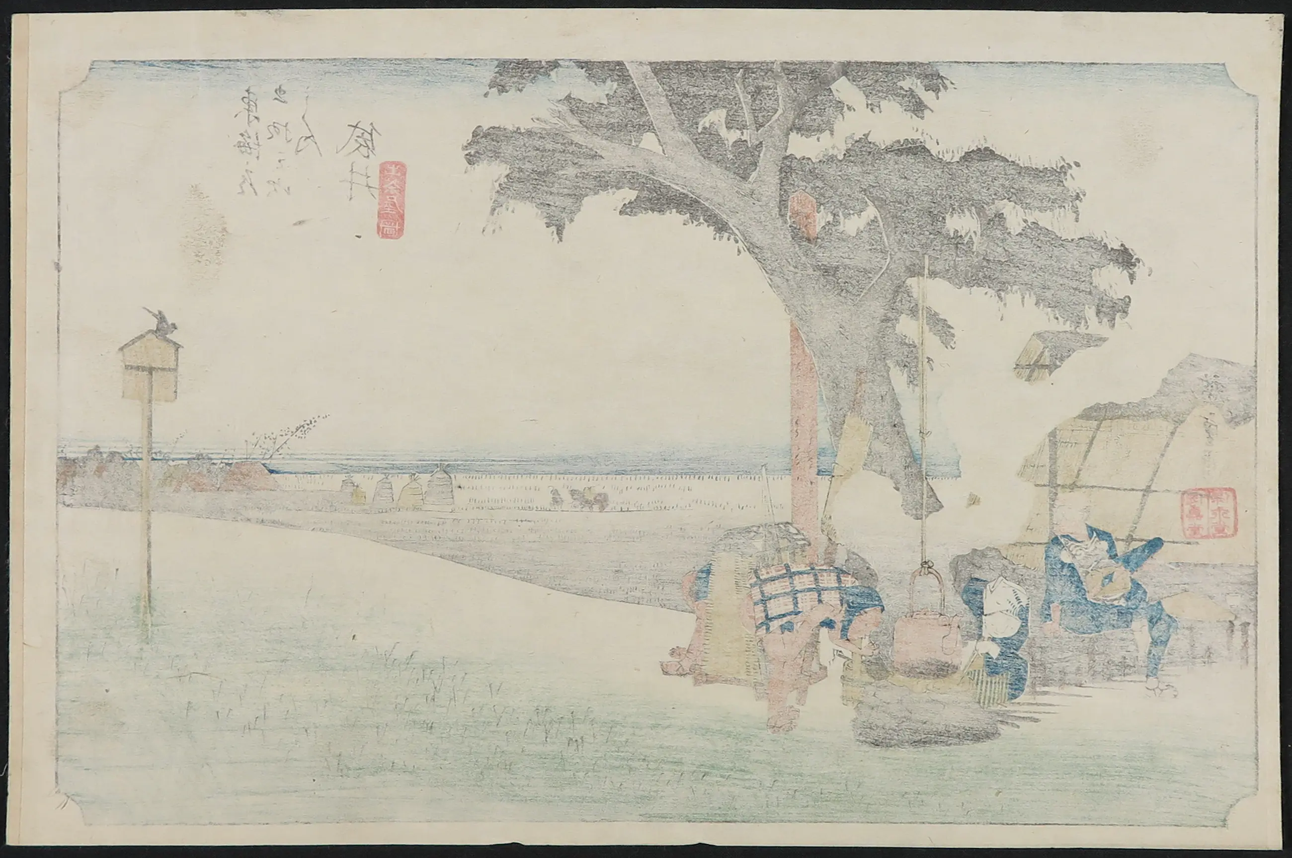 Ukiyo-e houtdruk uit de serie The 53 Stations of the Tokaido door Ando Hiroshige. Dit betreft nummer 28 uit de reeks, getiteld Fukuroi.