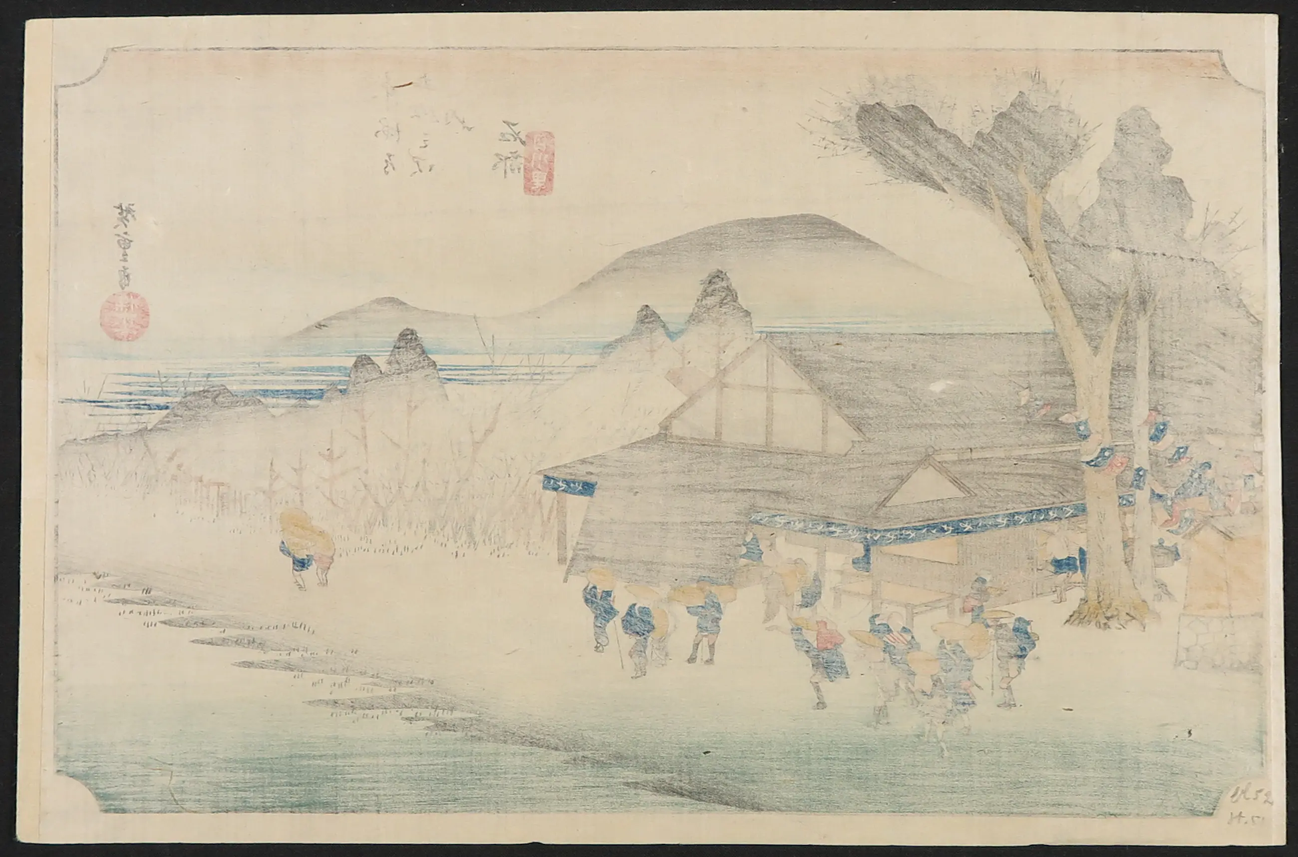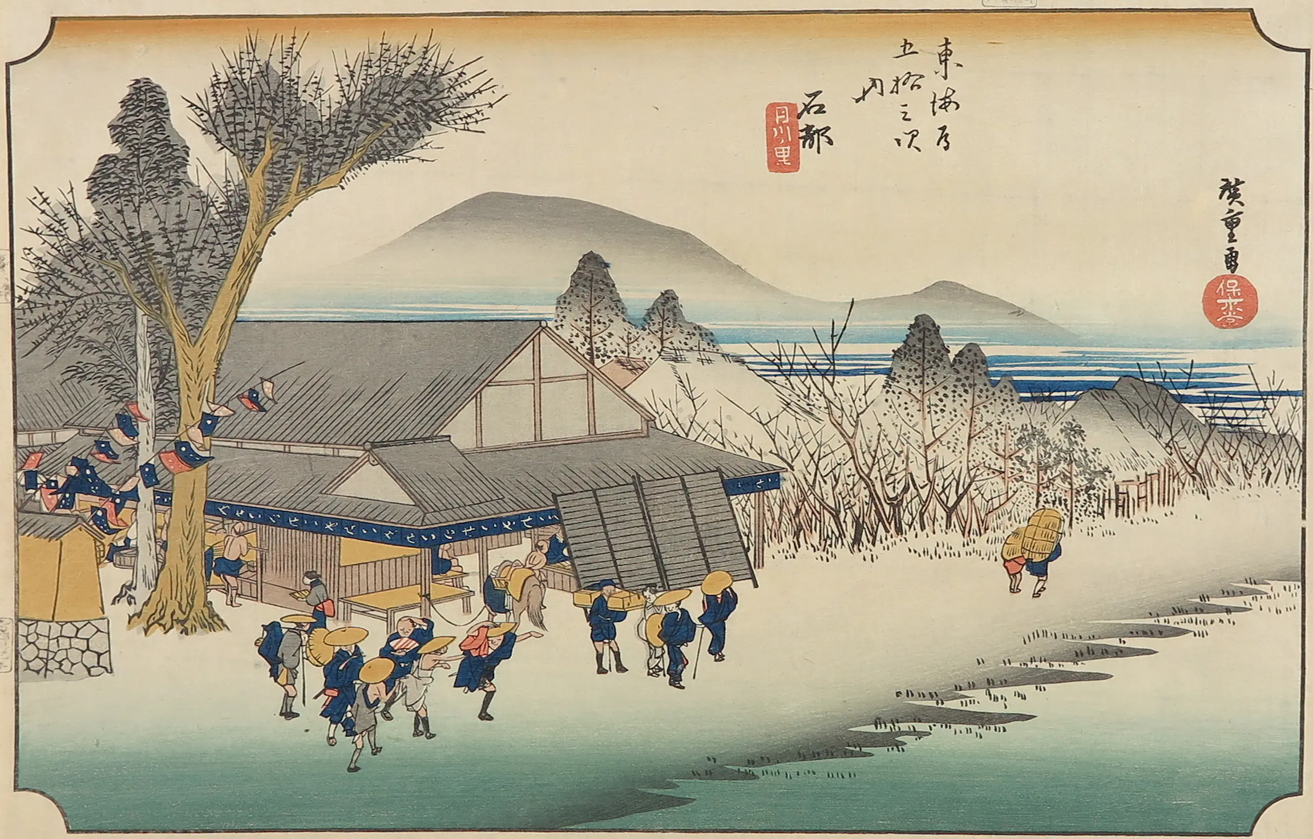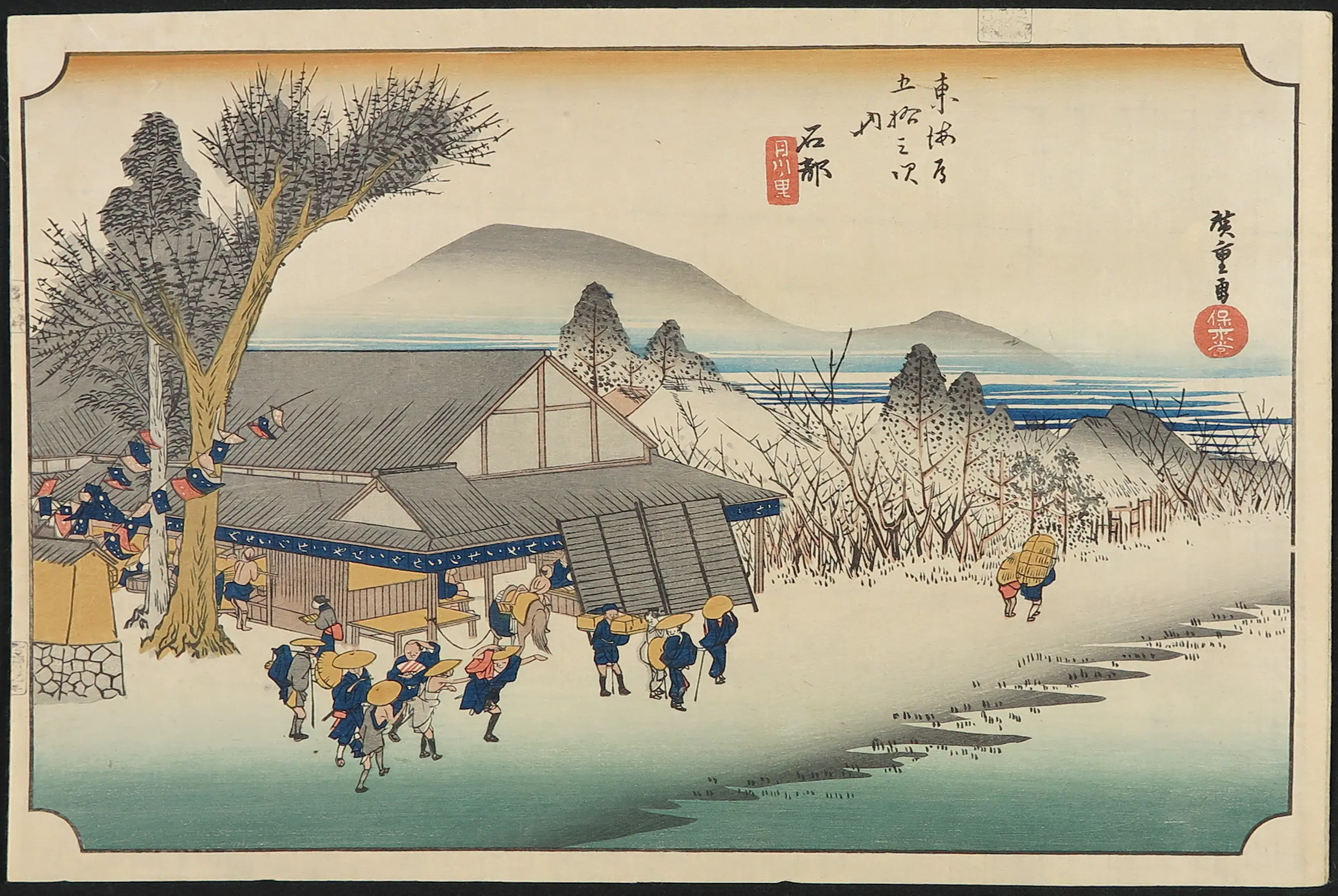 Ukiyo-e houtdruk uit de serie The 53 Stations of the Tokaido door Ando Hiroshige. Dit betreft nummer 52 uit de reeks, getiteld Ishibe.