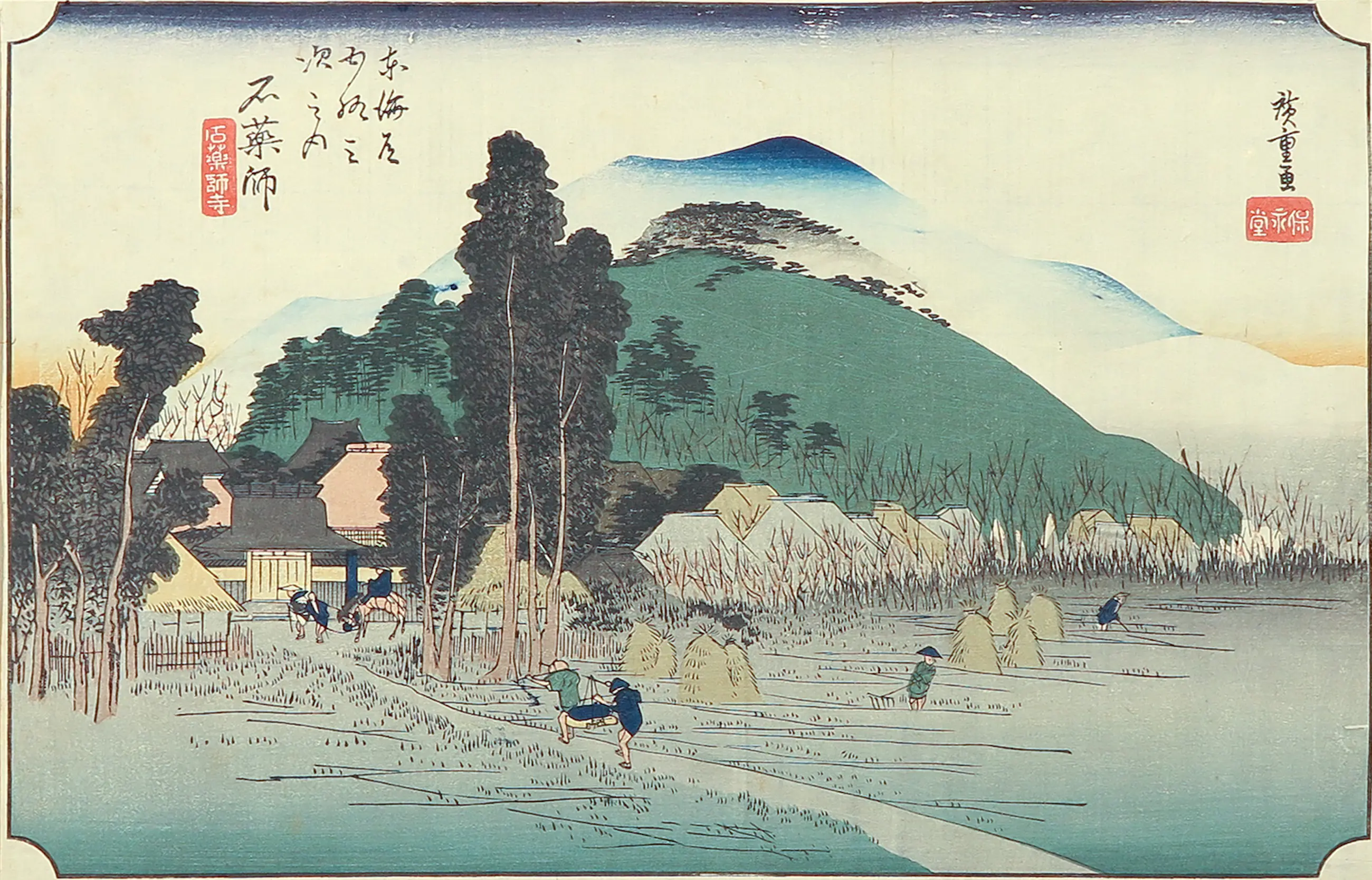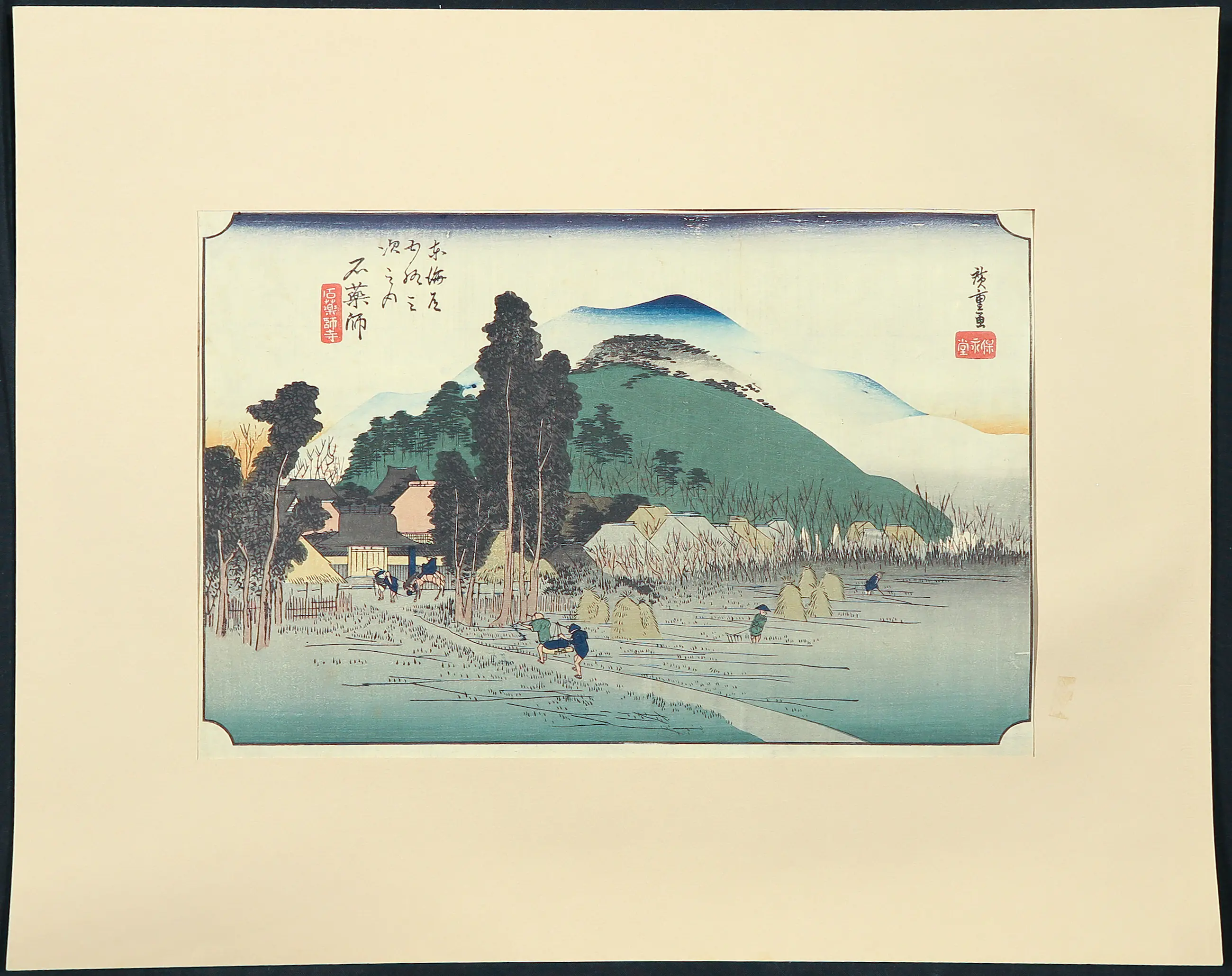 Ukiyo-e houtdruk uit de serie The 53 Stations of the Tokaido door Ando Hiroshige. Dit betreft nummer 45 uit de reeks, getiteld Ishiyakushi-juku