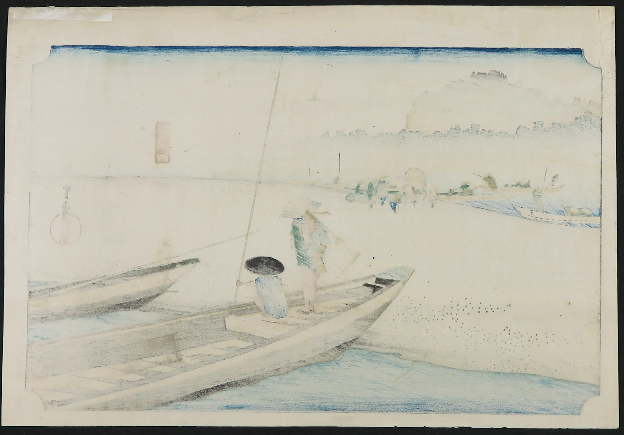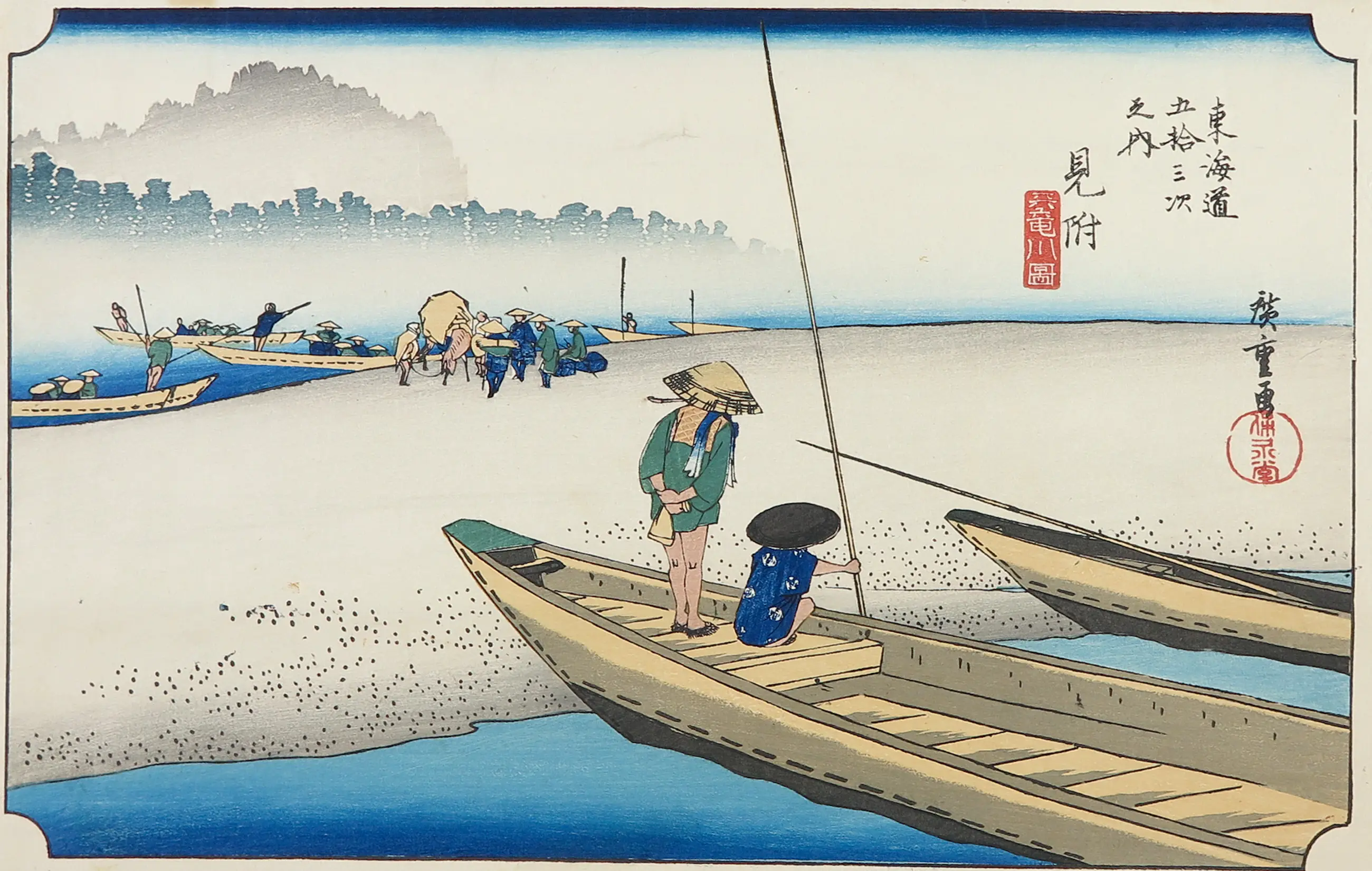 Ukiyo-e houtdruk uit de serie The 53 Stations of the Tokaido door Ando Hiroshige. Dit betreft nummer 29 uit de reeks, getiteld Mitsuke.