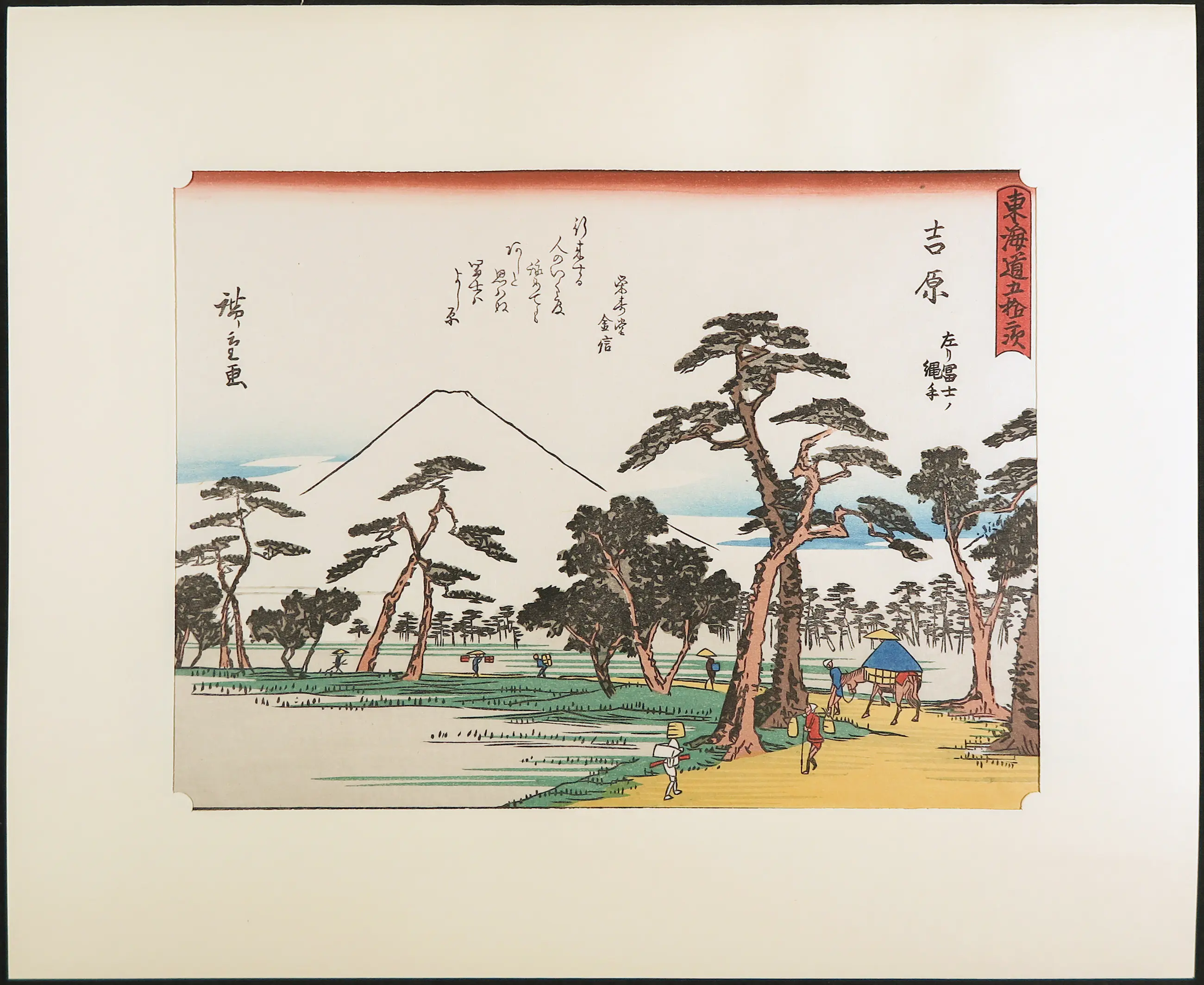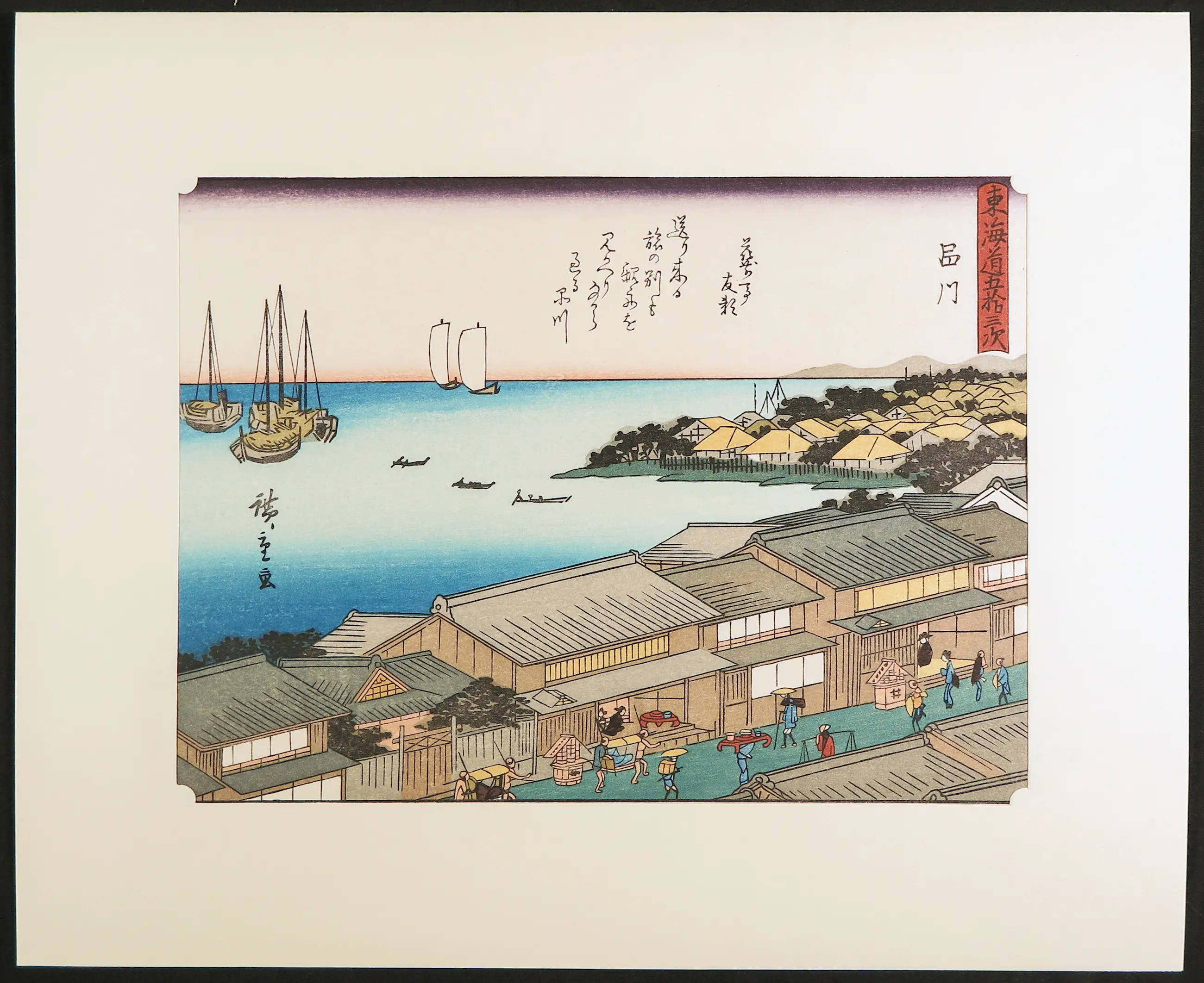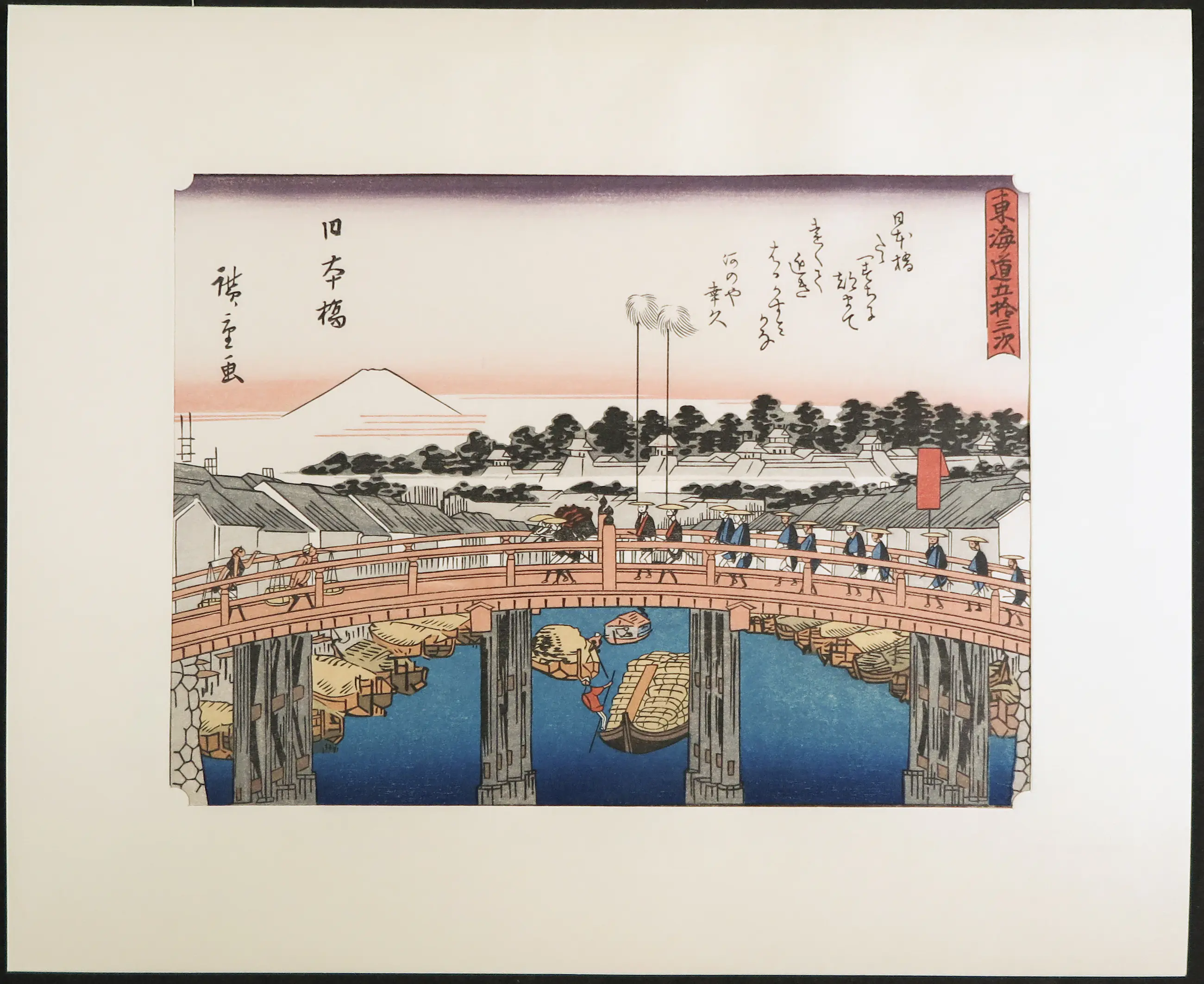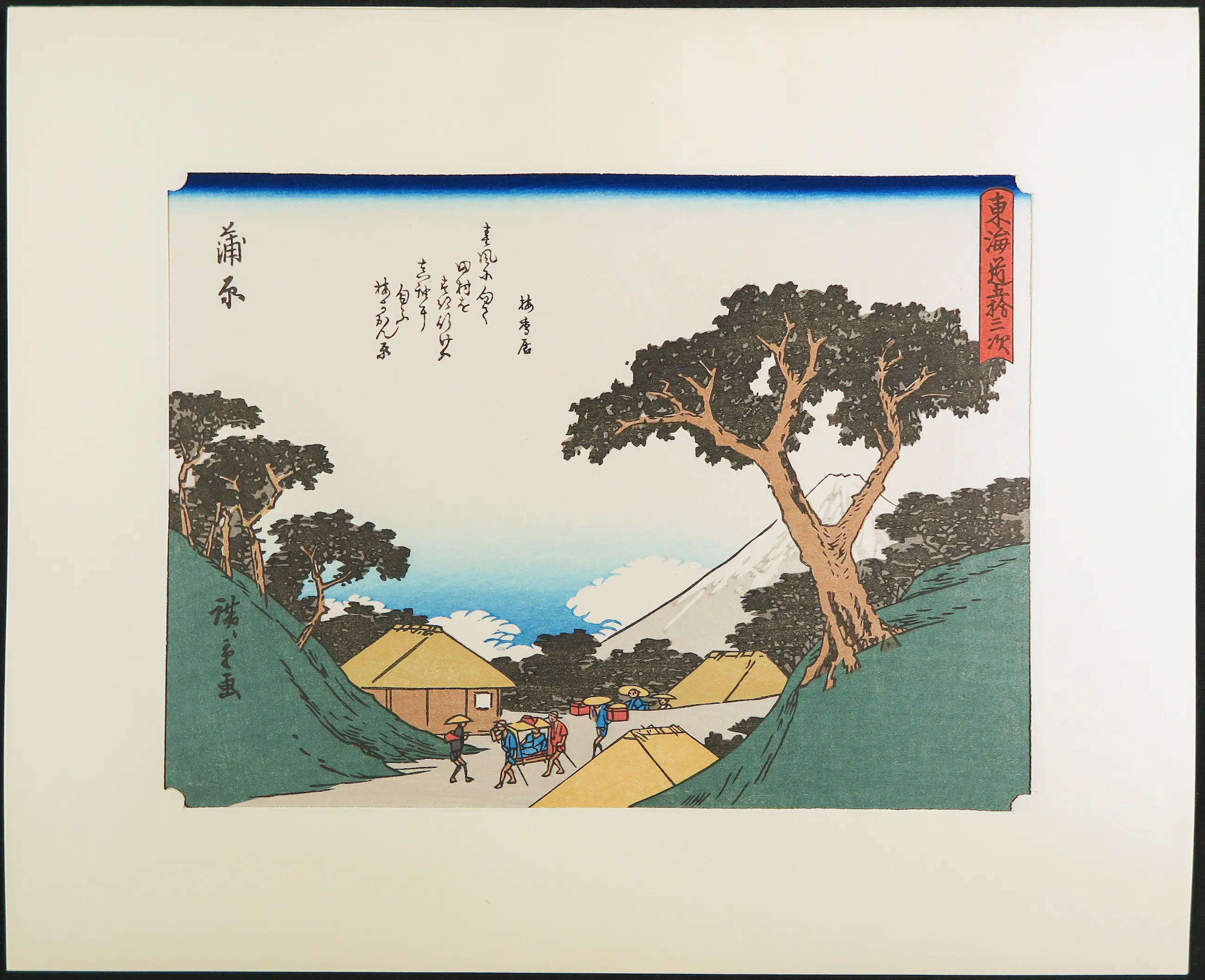 De serie, The Fifty-three Stations of the Tokaido Raod, is oorspronkelijk uitgegeven tussen 1840 en 1842 door de uitgever/drukker Sanoki. Terwijl er 52 'stations' zijn, bestaat de serie uit 56 houtdrukken. Deze serie heet de 'Kyoka' Tokaido, omdat in iedere druk een 'kyoka' is toegevoegd, een kort en komisch gedicht.