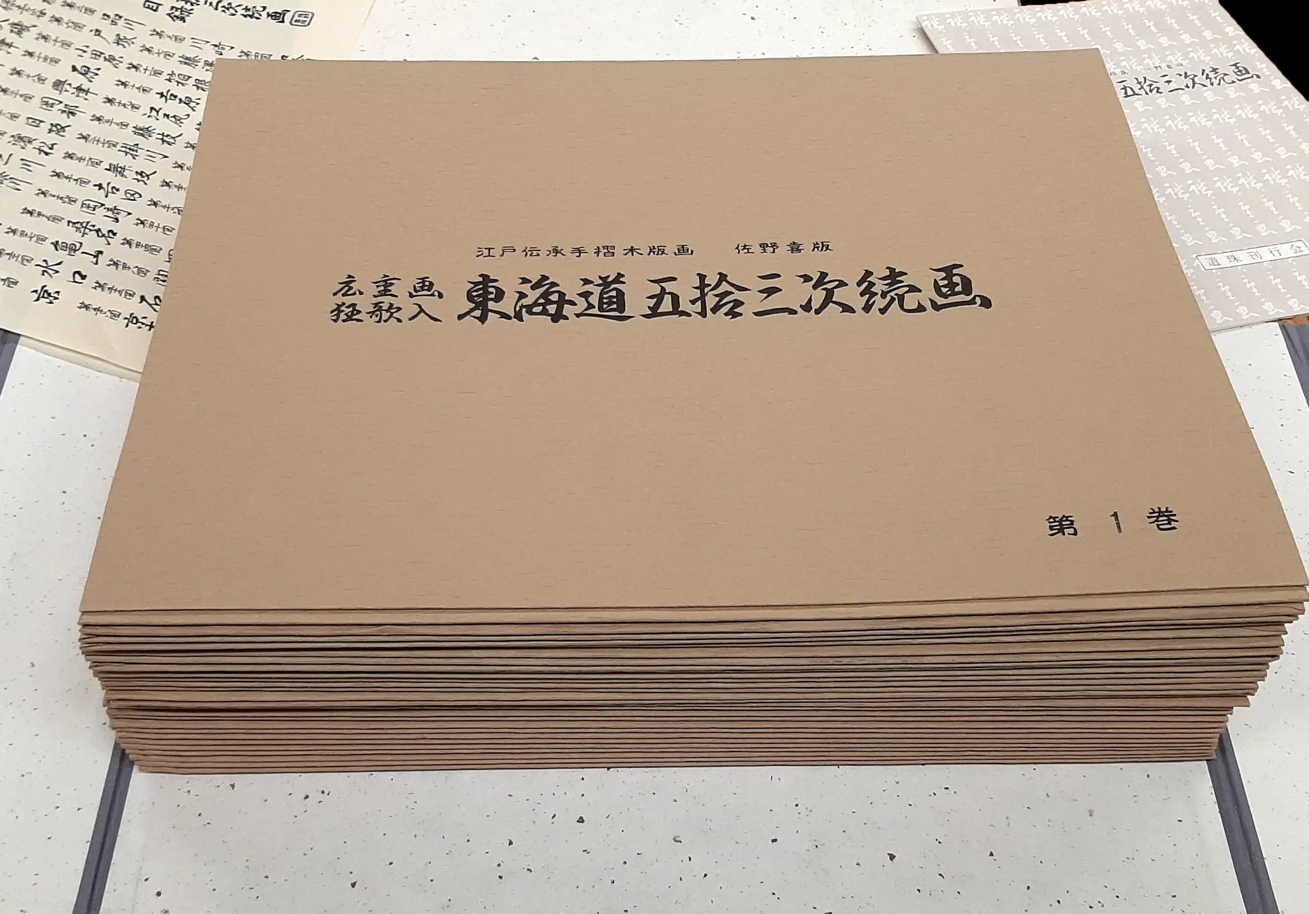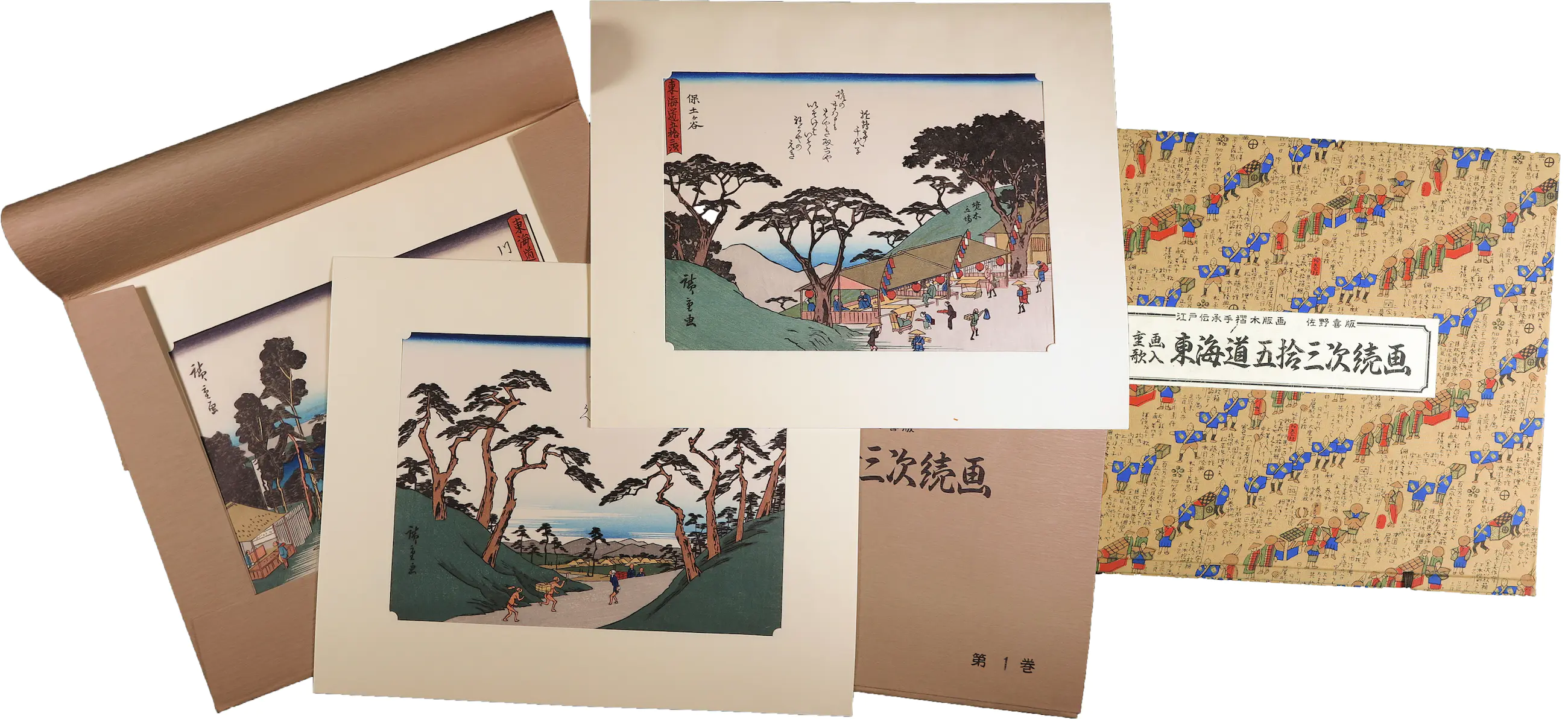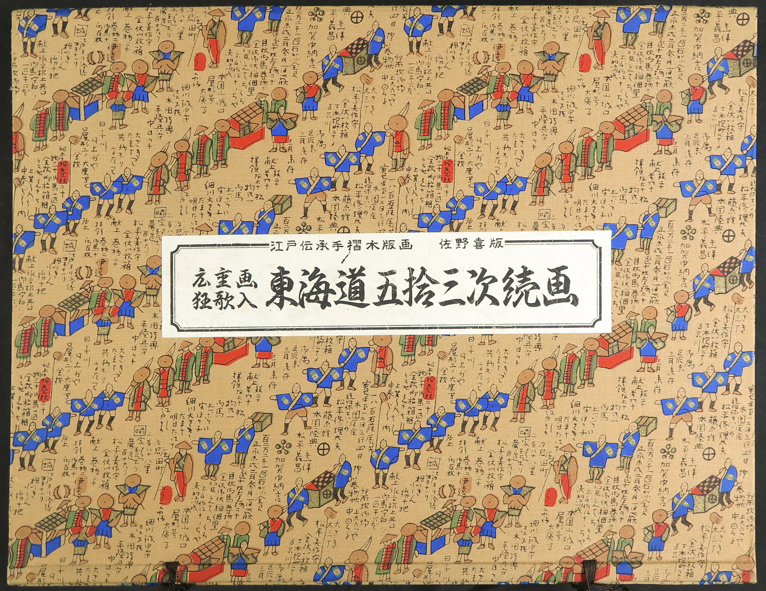 De Kyoka Tokaido serie van Ando Hiroshige, bestaande uit 56 houtdrukken in papieren mappen in een bedrukte linnen cassette.