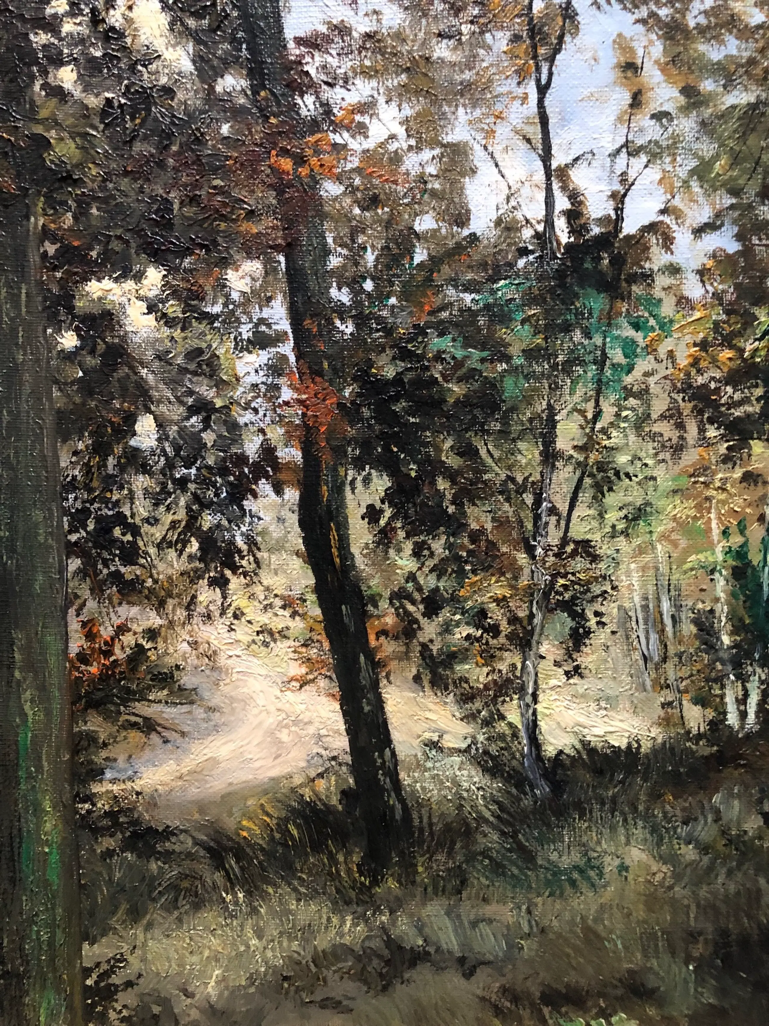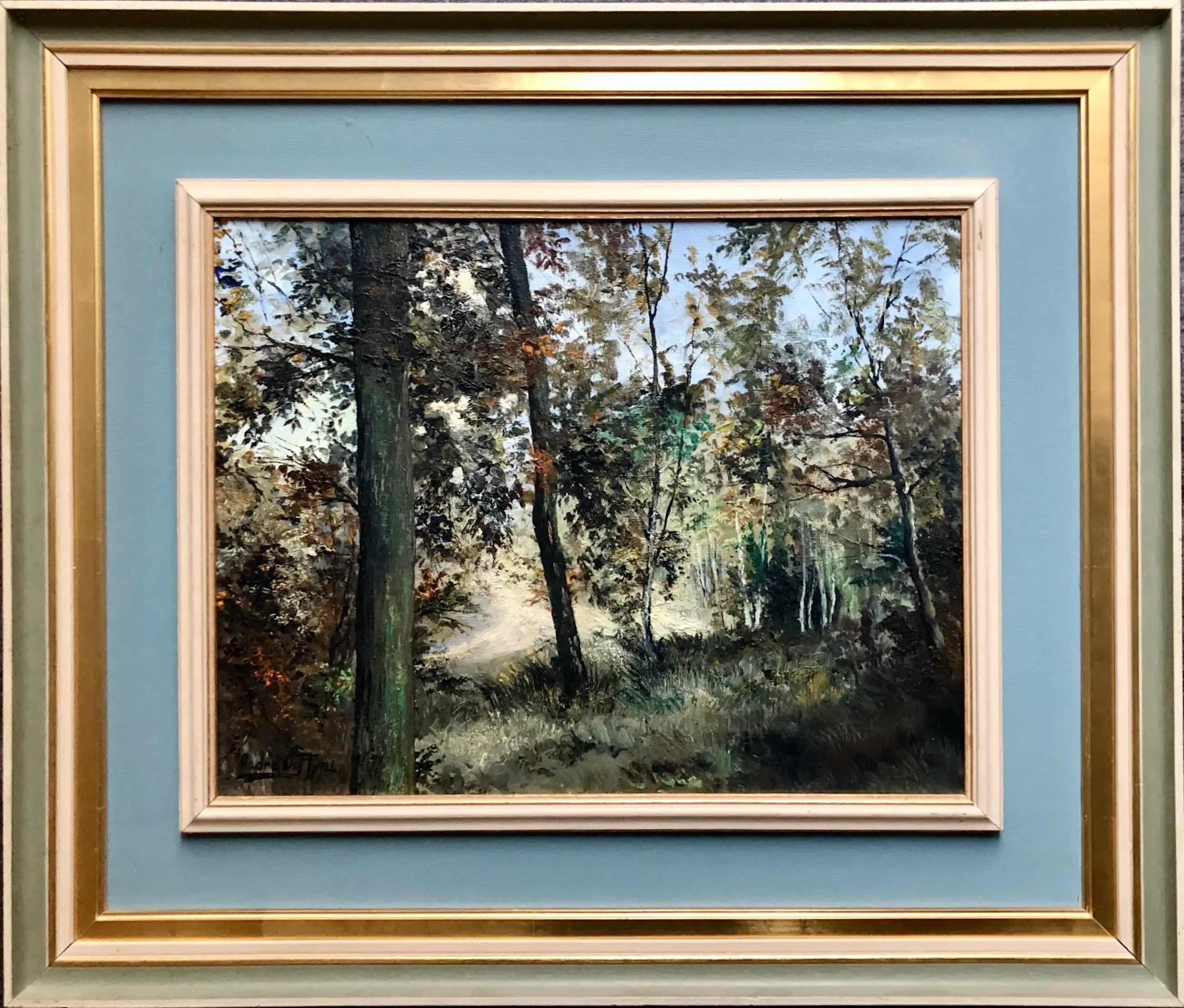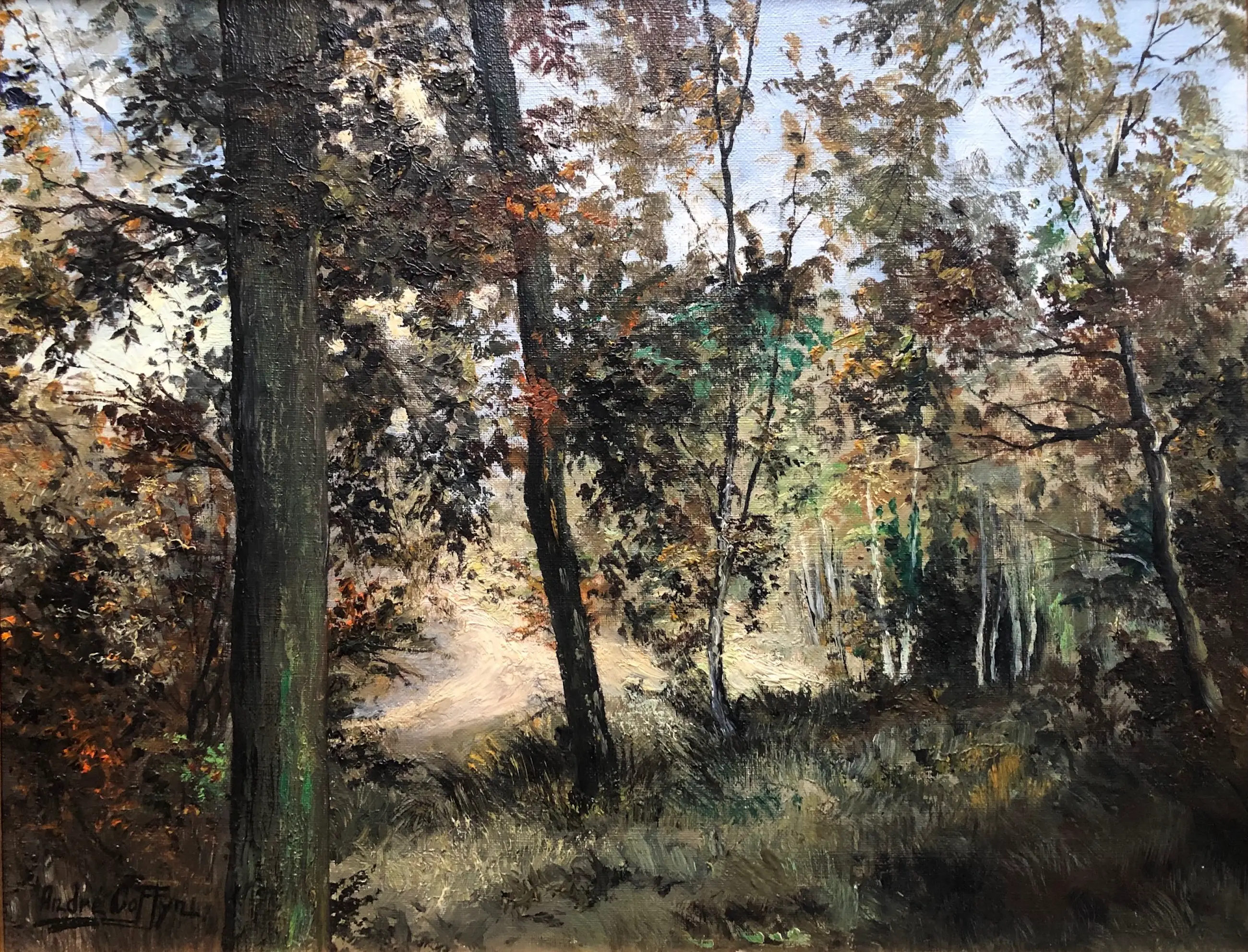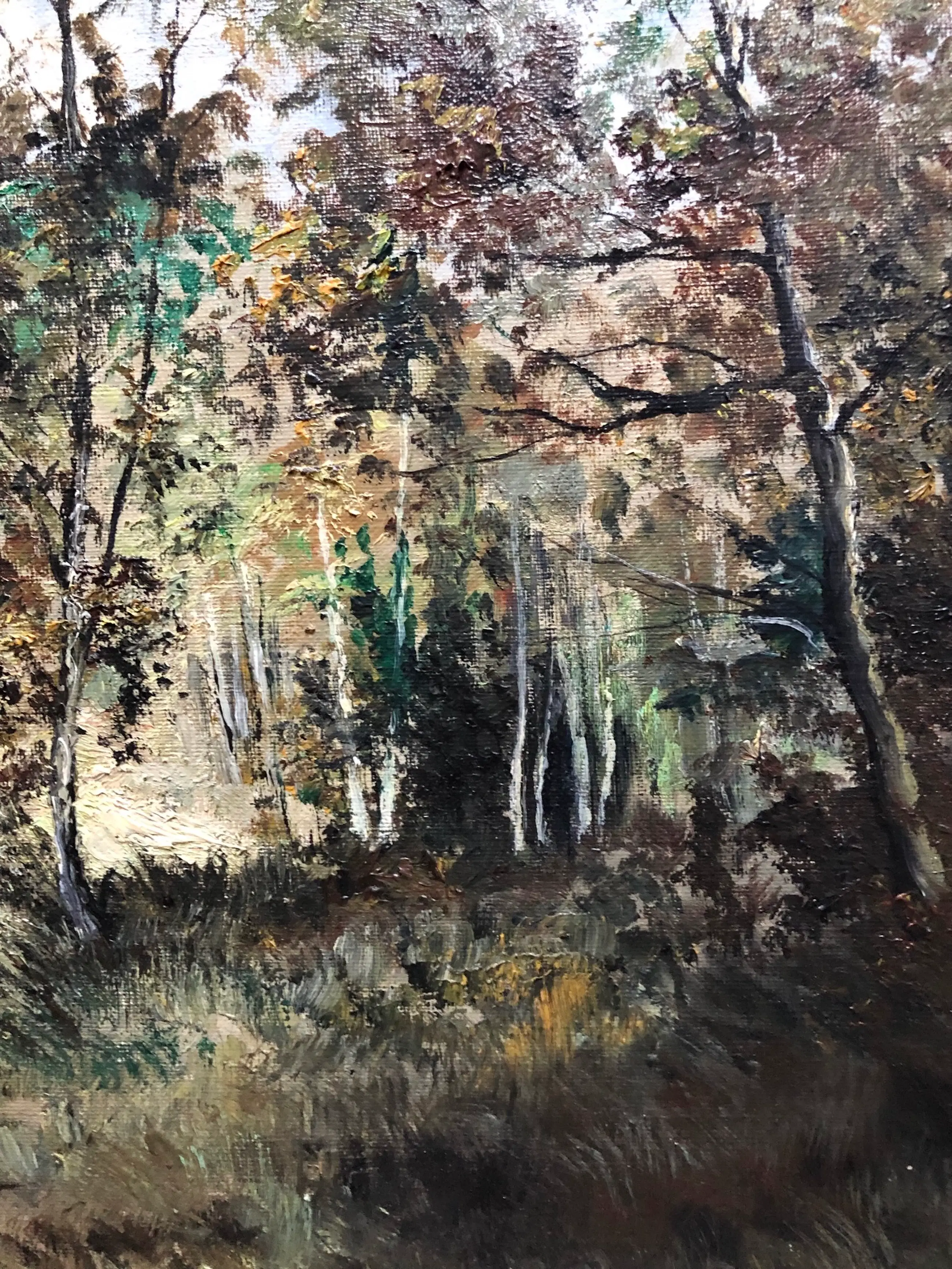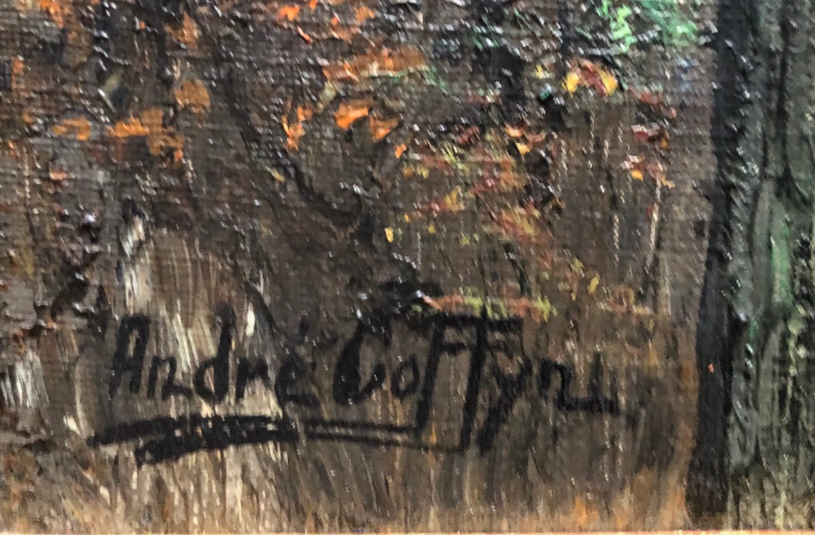 Andre Coffyn had een eigen galerie in Koksijde (Belgie) waar hij zijn werk exposeerde en verkocht. Dat was soms wat wisselvallig van kwaliteit maar in dit boslandschap , toch niet direct zijn spe- cialiteit, excelleert hij in kleurgebruik en de suggestieve lichtval.