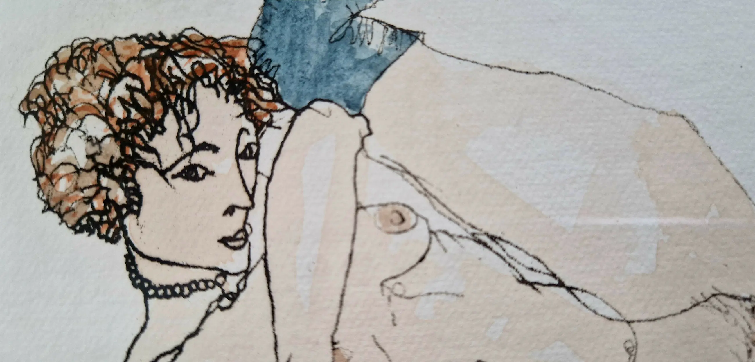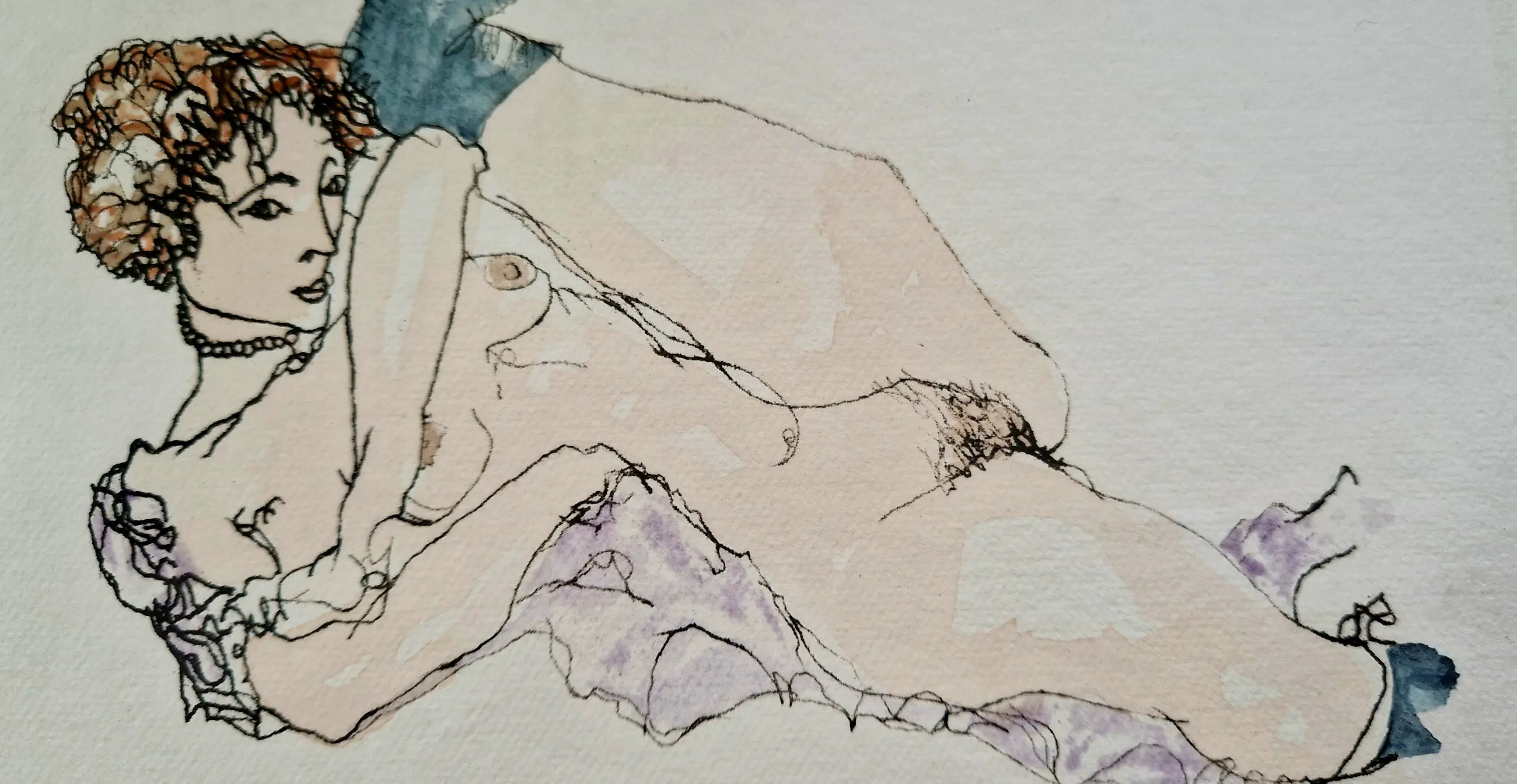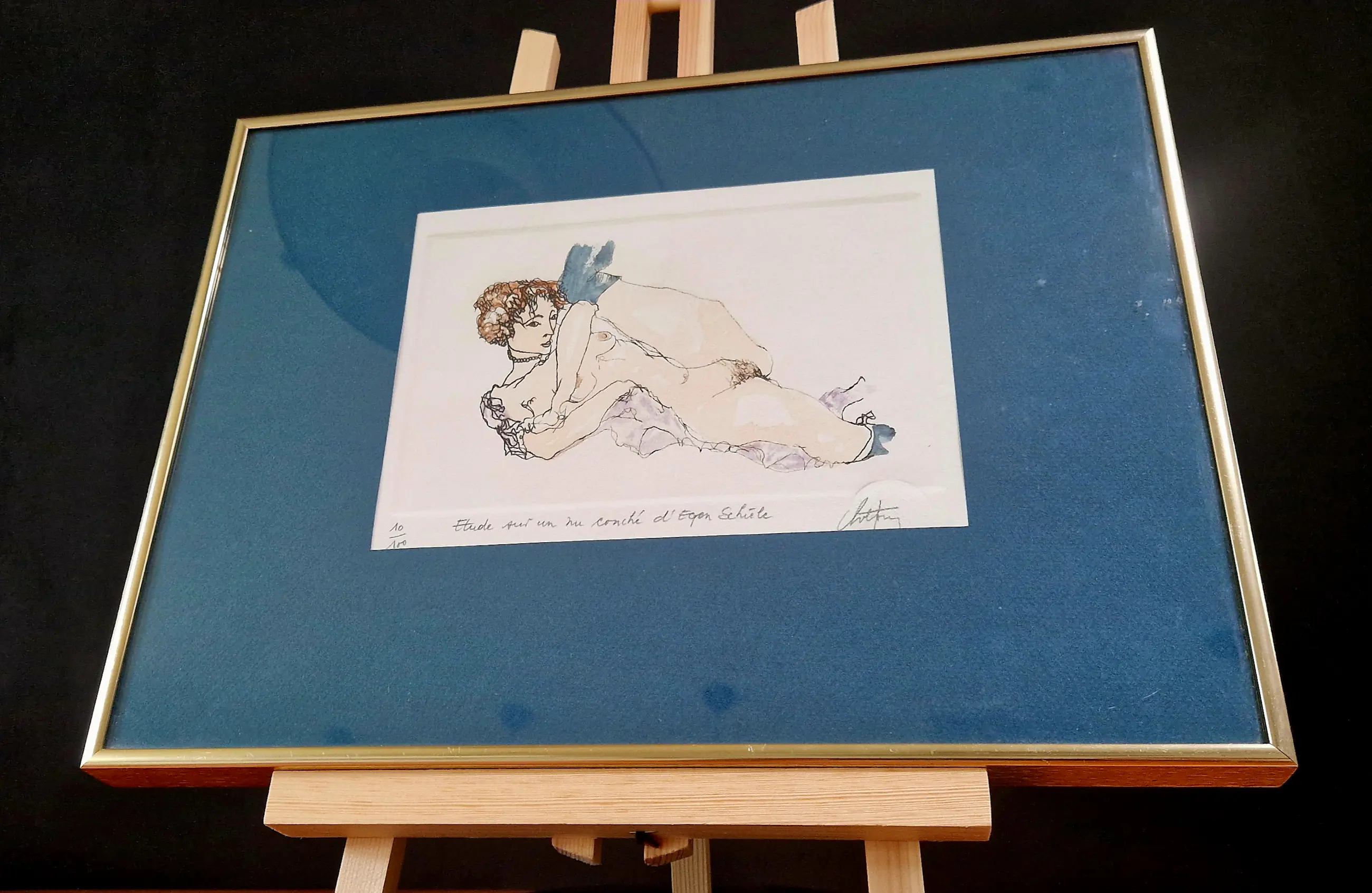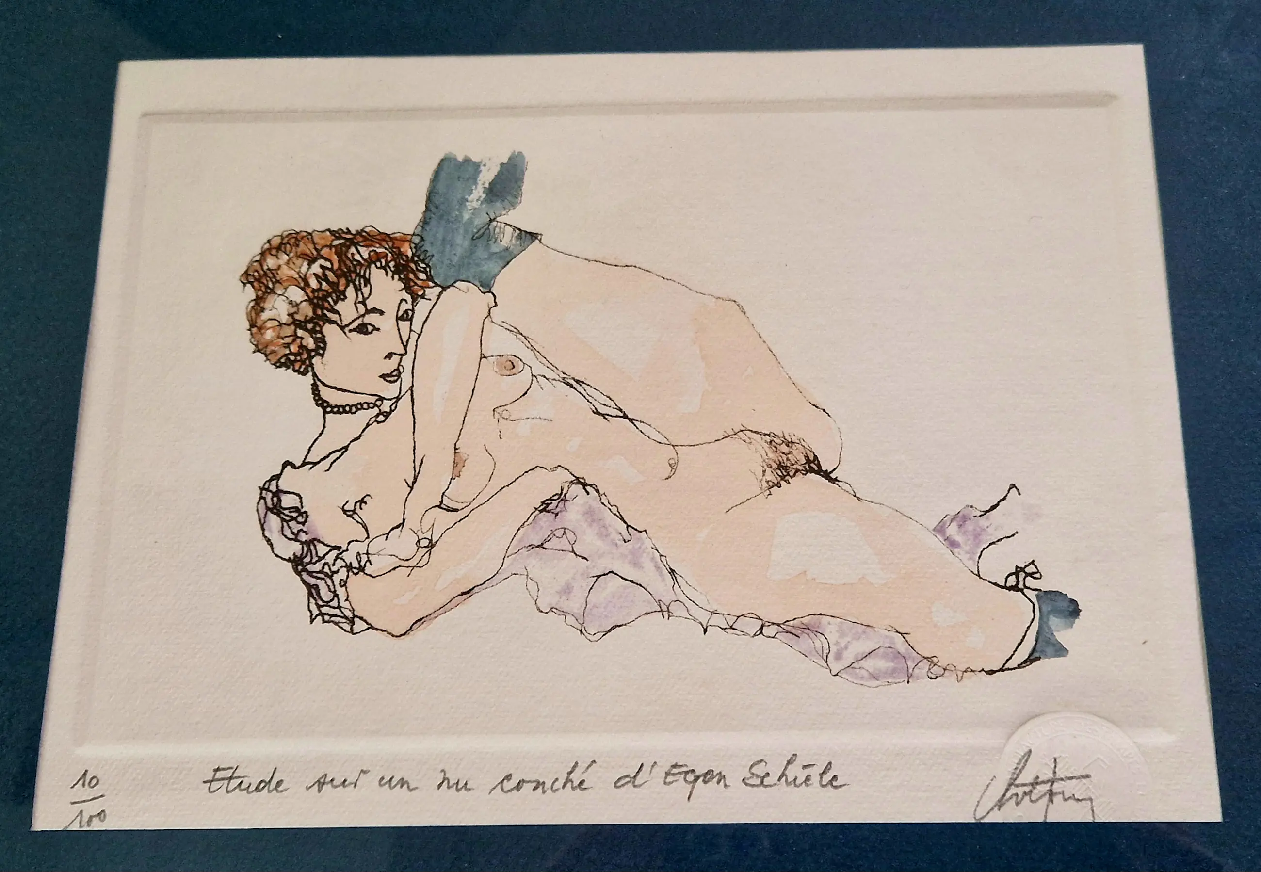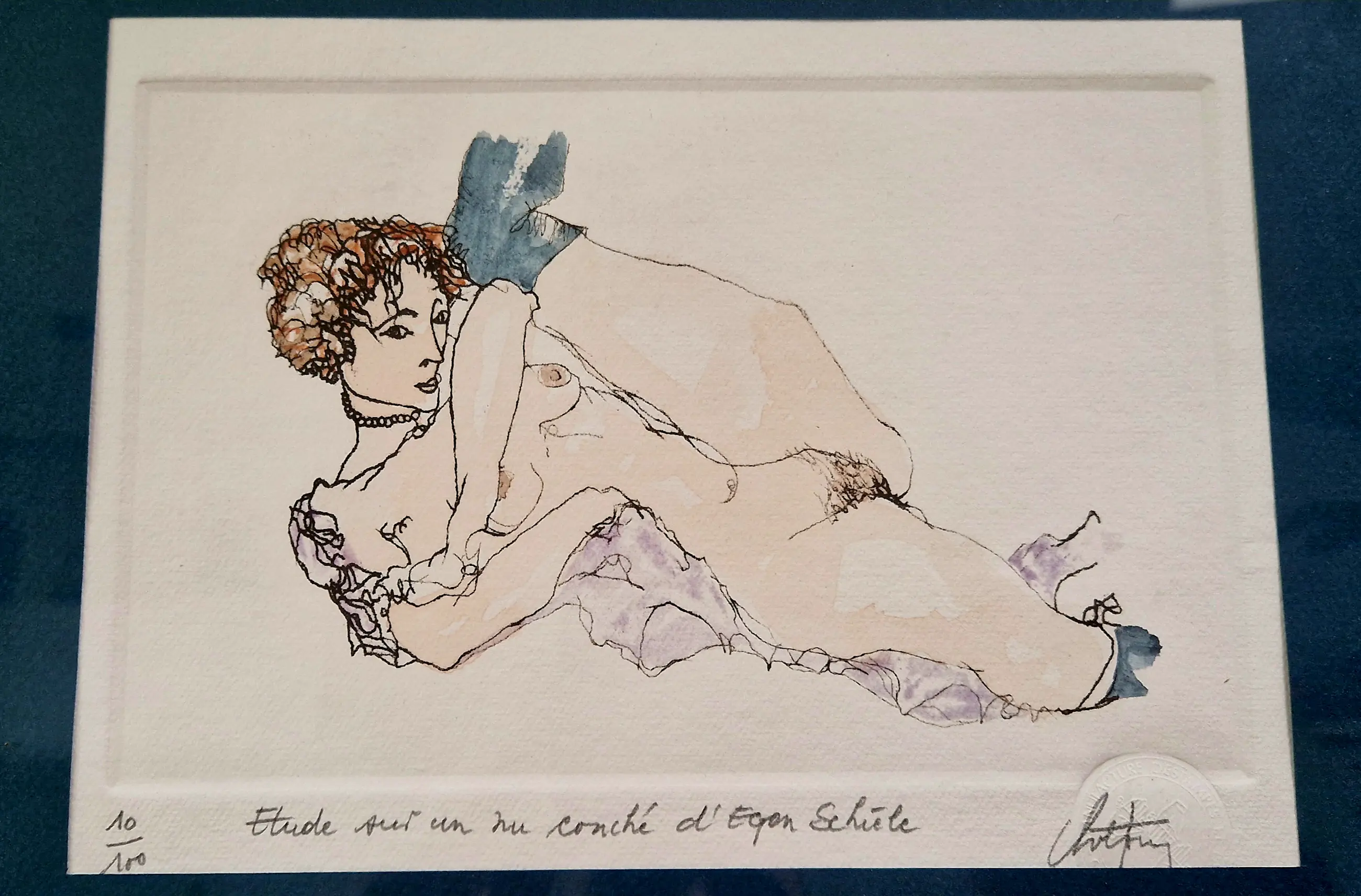 Fraaie ingekleurde ets van de Belgische kunstenaar André Colpin, een studie naar een van de naaktportretten van de Oostenrijkse kunstenaar Egon Schiele.