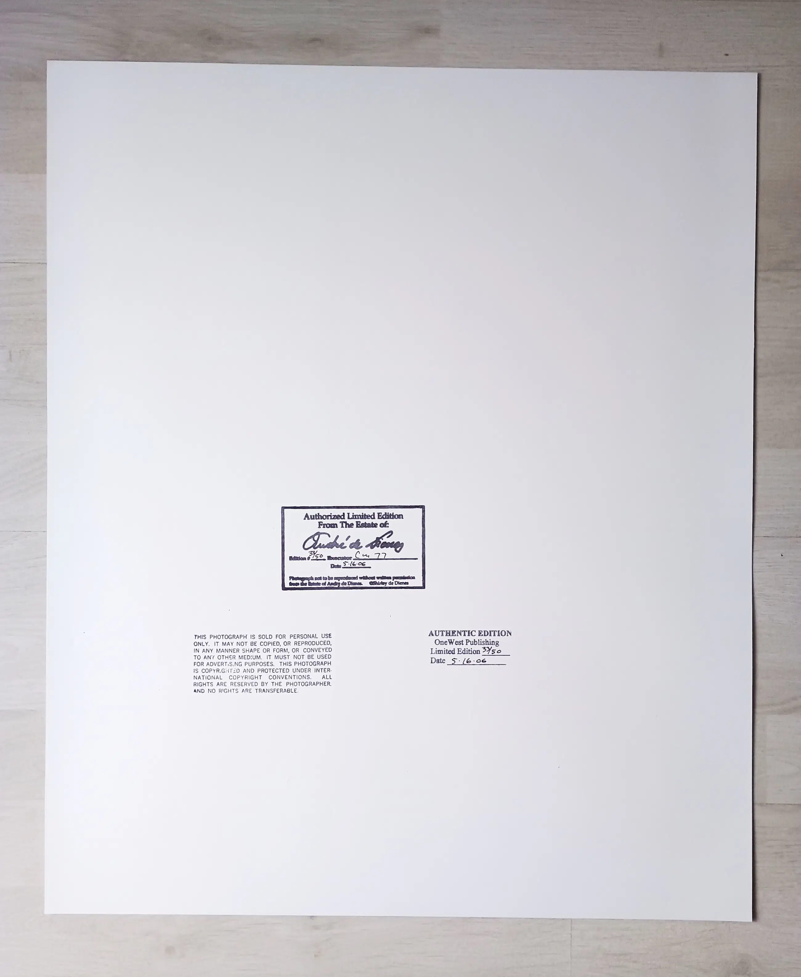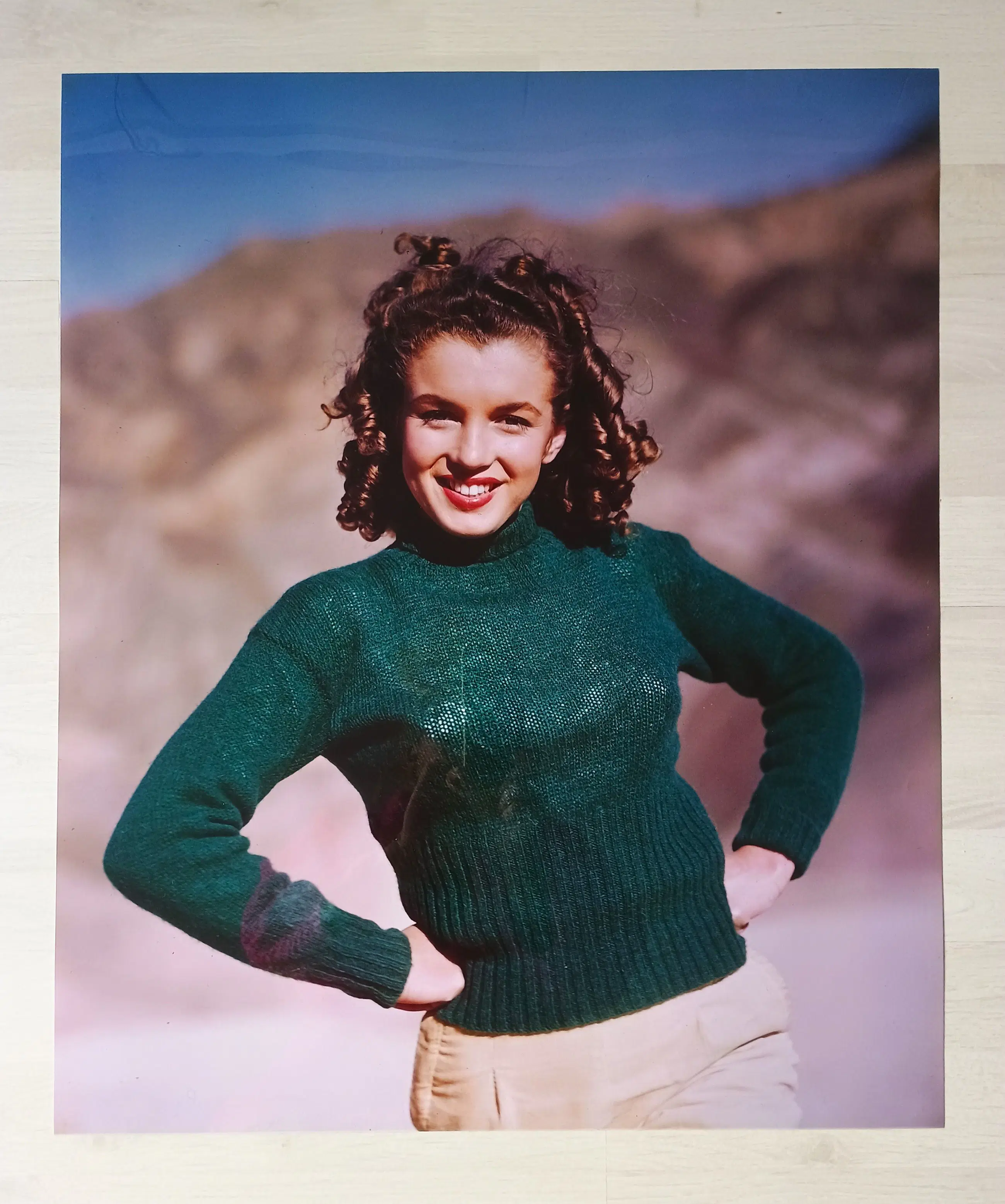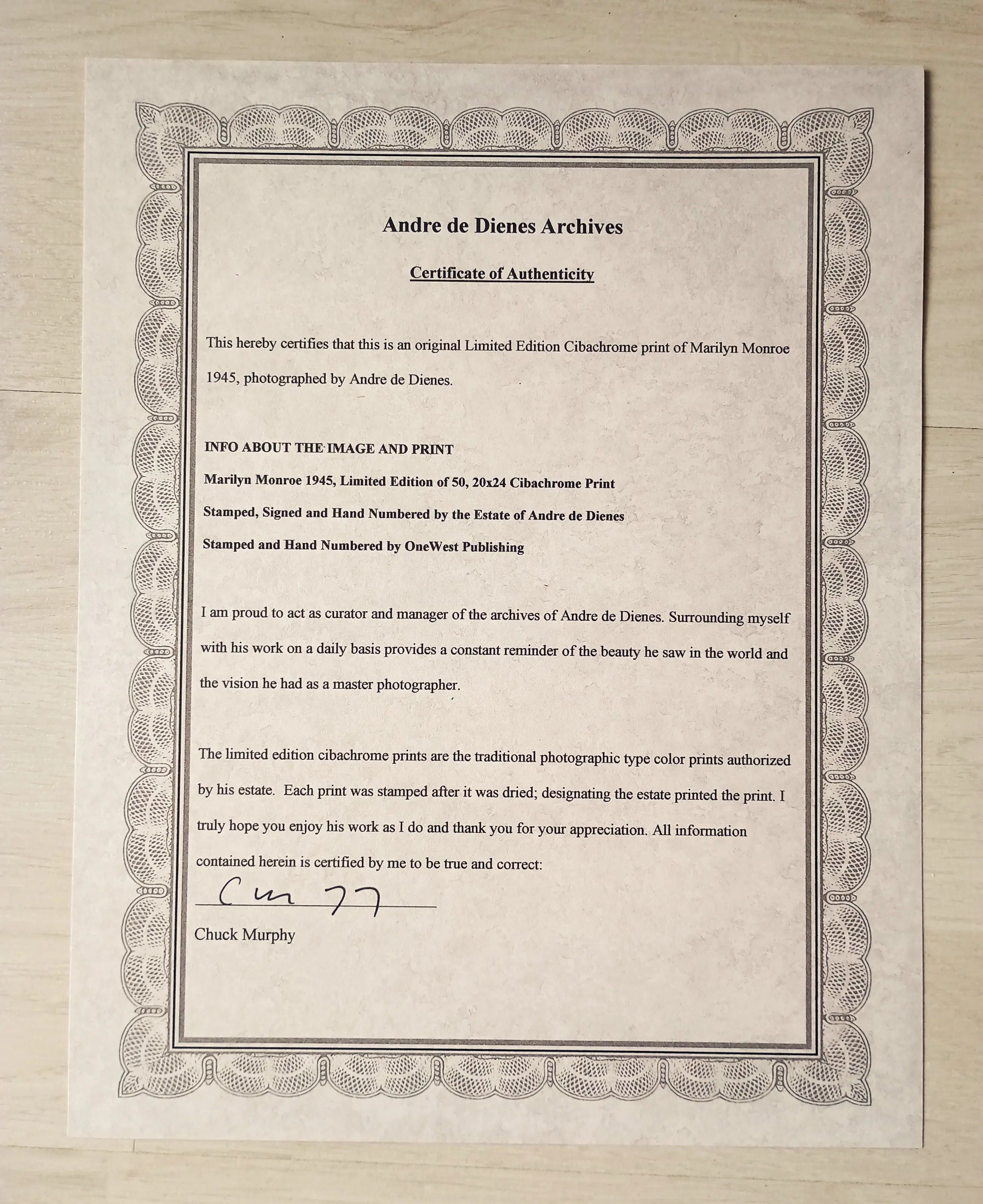 Originele foto van André de Dienes (1913-1985). Titel: Marilyn Monroe, 1949. Techniek: Zilvergelatine op papier. Beperkte oplage van 50 exemplaren, uitgebracht in 2006. Gesigneerd in drukletters op de achterkant. Een echtheidscertificaat van Shirley de Dienes is bijgevoegd. In zeer goede staat. In 1945 was André de Dienes de eerste fotograaf die de jonge Norma Jeane als professioneel model fotografeerde. Ze verloofden zich in 1946 en hij bleef haar fotograferen tot 1953.