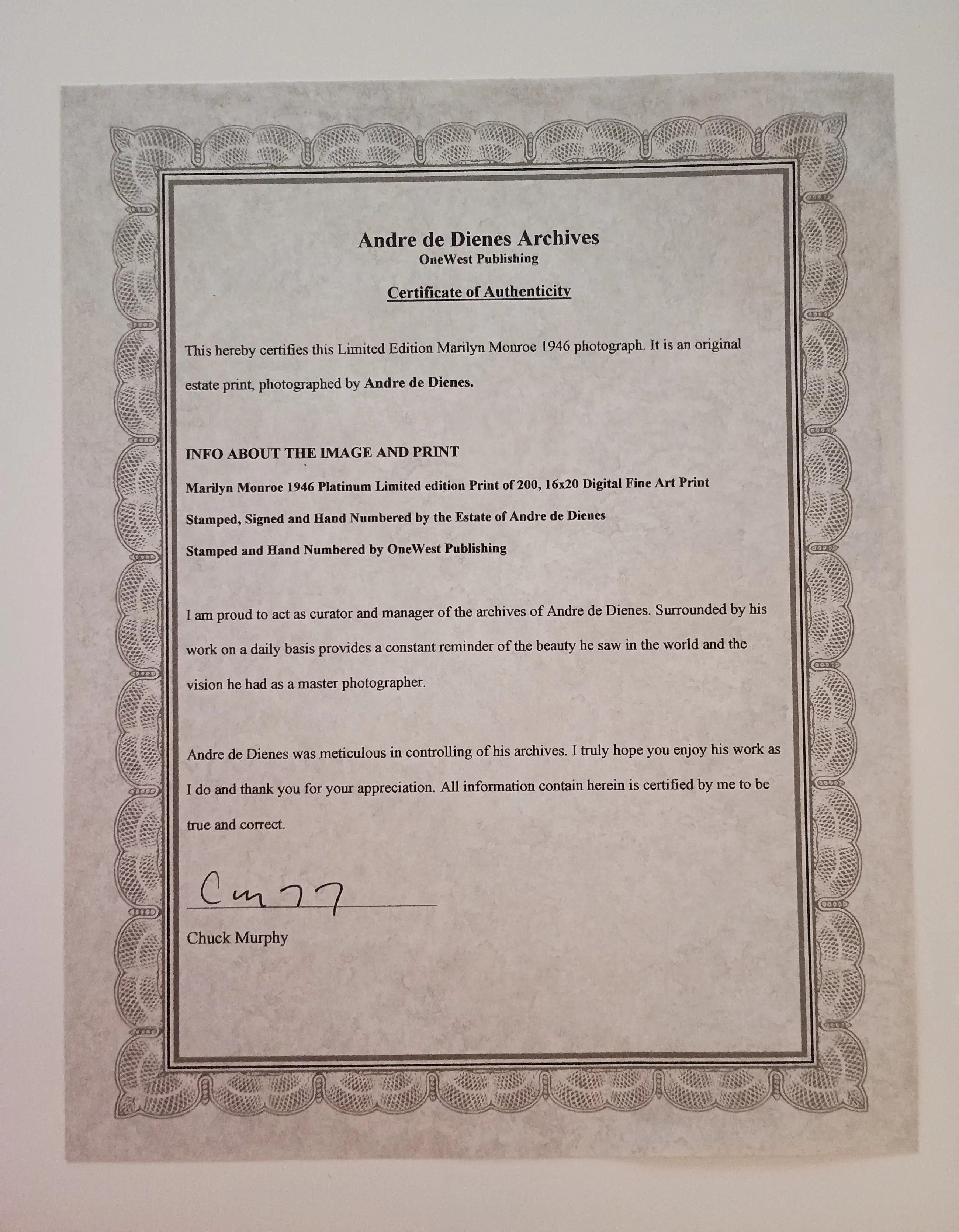 De Andre de Dienes Marilyn Platinum Edition, gestempeld en genummerd door het Andre de Dienes Archief en OneWest Publishing, gesigneerd door Chuck Murphy.