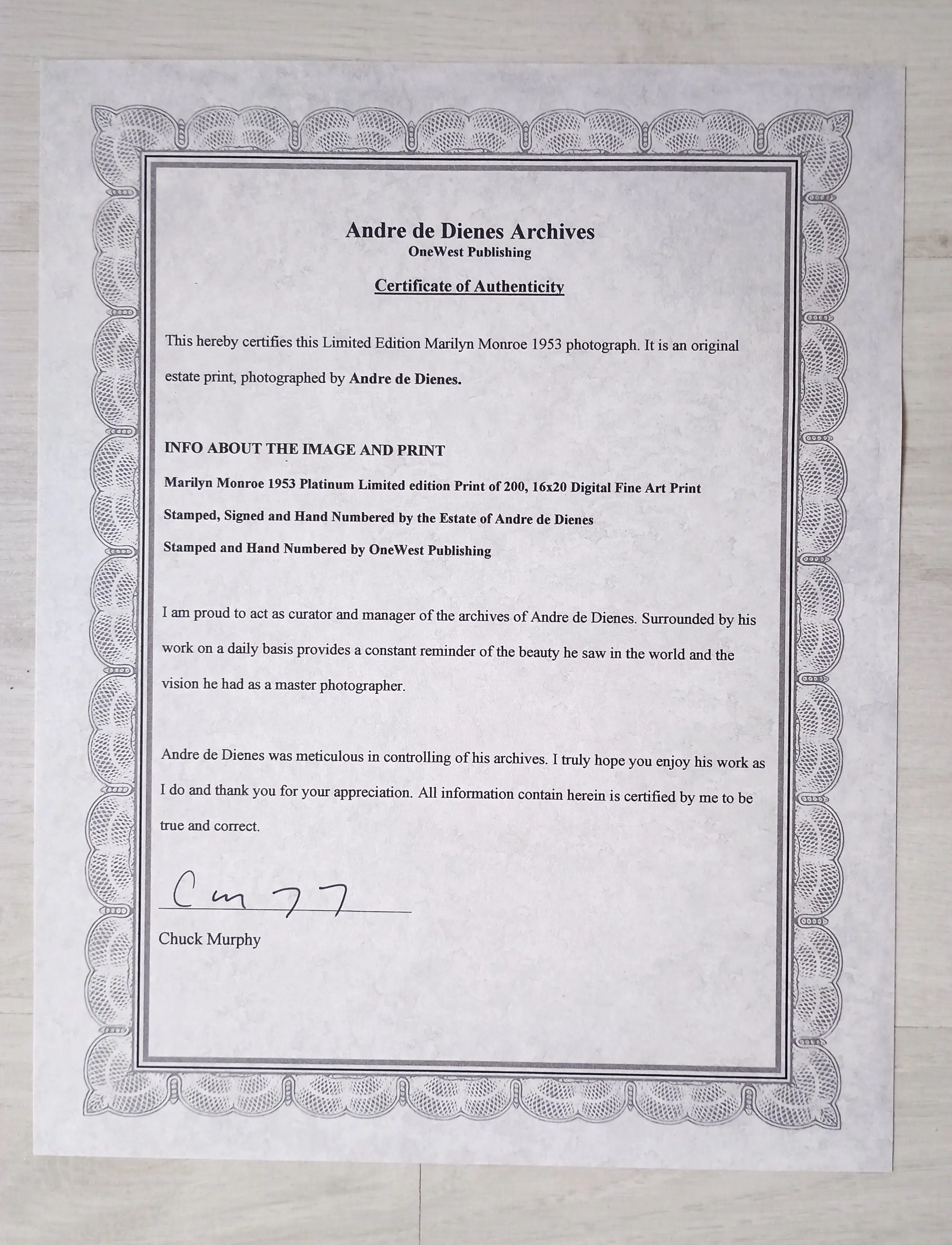 De Andre de Dienes Marilyn Platinum Edition, gestempeld en genummerd door het Andre de Dienes Archief en OneWest Publishing, gesigneerd door Chuck Murphy.
