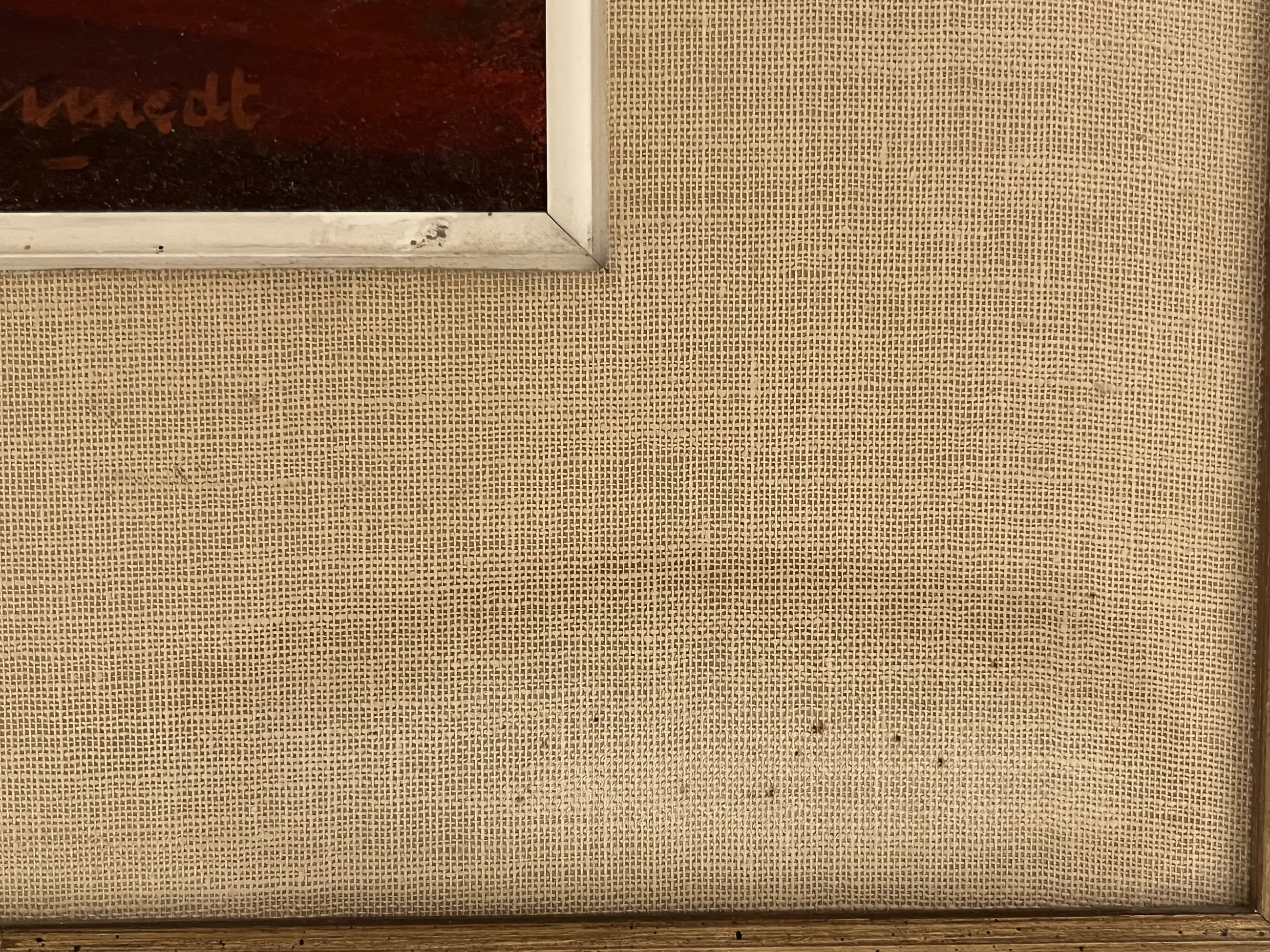 Sfeervol tafereel geschilderd op paneel. Gelijst op een ouderwetse wijze met een soort van stoffen passe partout. De passe partout heeft zichtbare imperfecties, lijstje heeft lichte gebruikssporen. Afmeting afbeelding 29 x 39 cm. Inclusief omlijsting 48 x 58 cm.