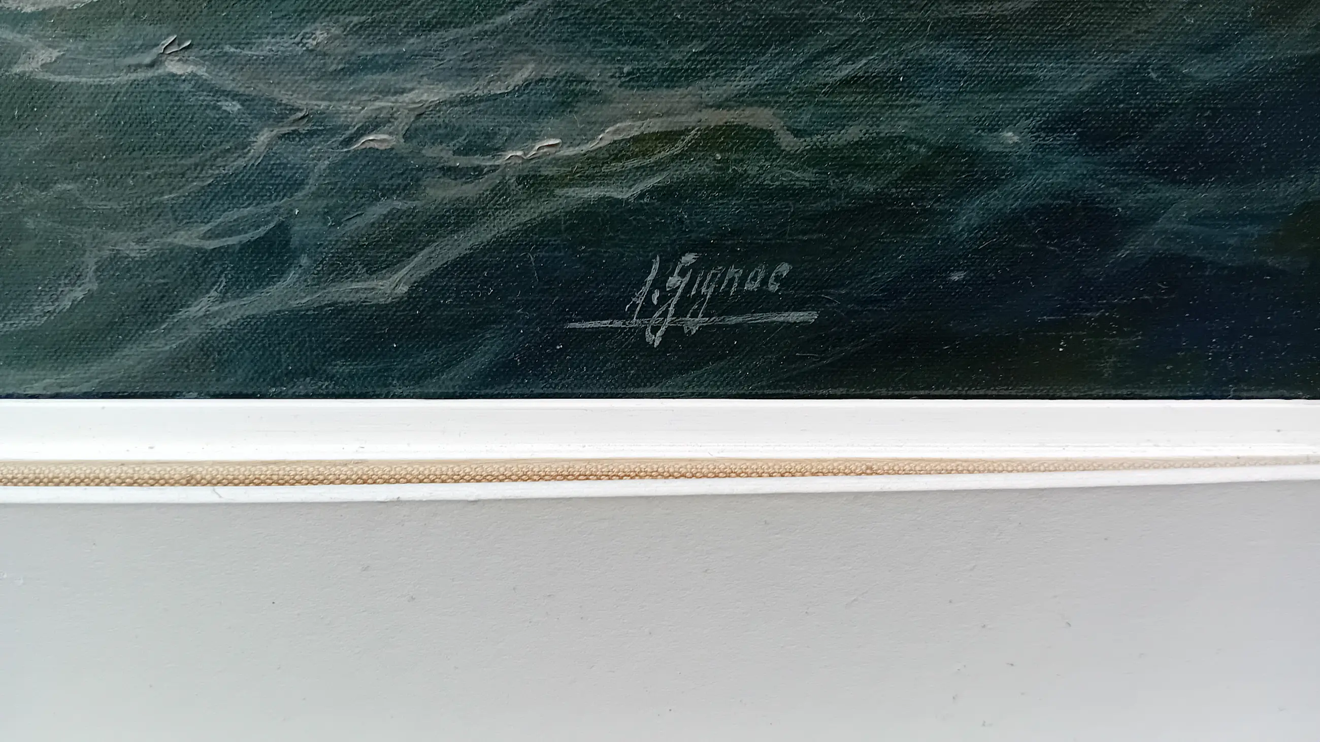 Een sfeervol en vakkundig geschilderd olieverfschilderij van de bekende maritieme schilder André Gignac. Het betreft een prachtig nachtstafereel (nocturne) van een zeilende vissersschuit (type botter) op een onstuimige zee bij maanlicht. Herkomst (Proveniëntie):