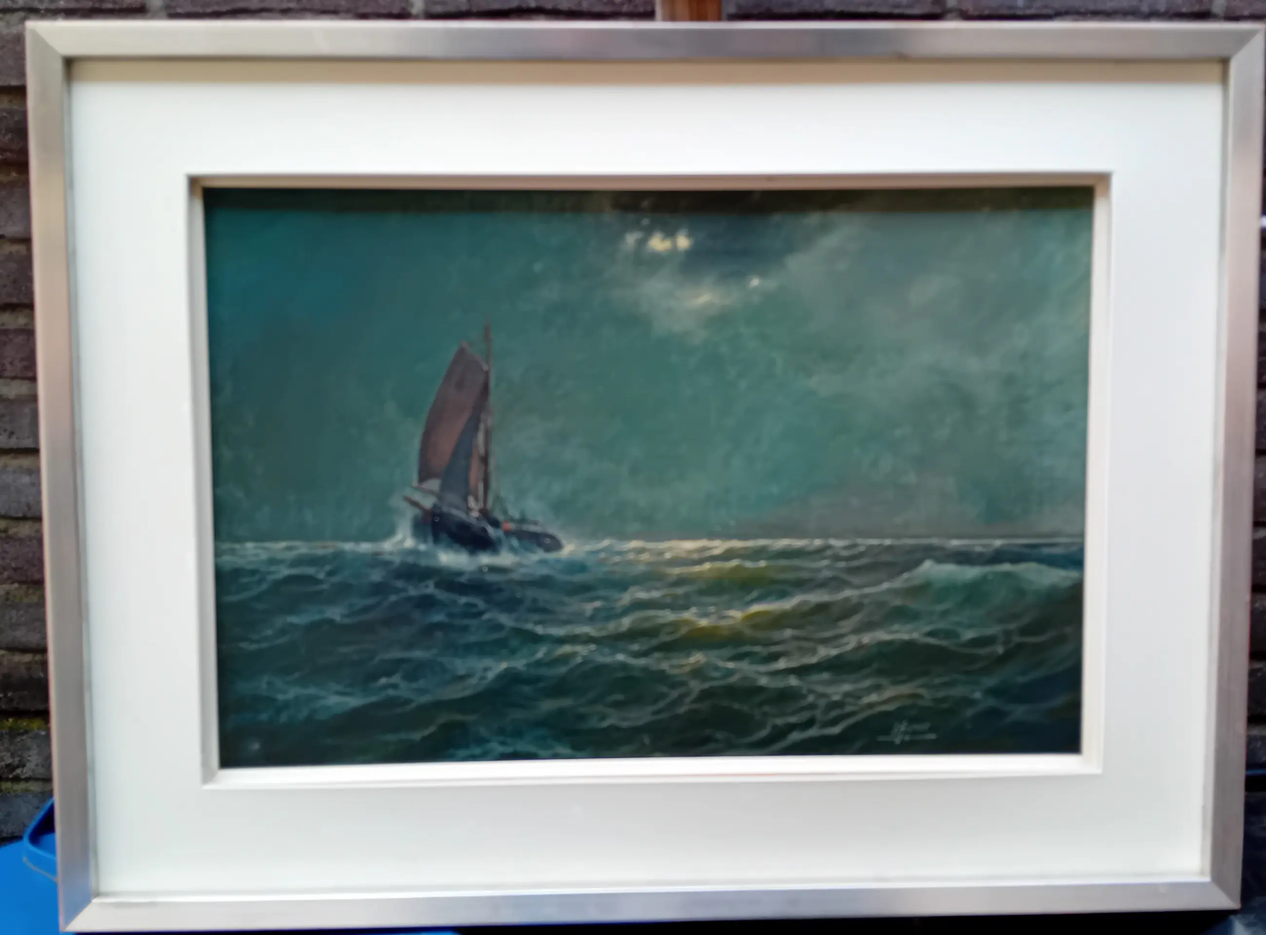 Het doek verkeert in goede staat en is mooi op spanning. De zilverkleurige houten lijst vertoont lichte gebruikssporen maar is direct op te hangen.