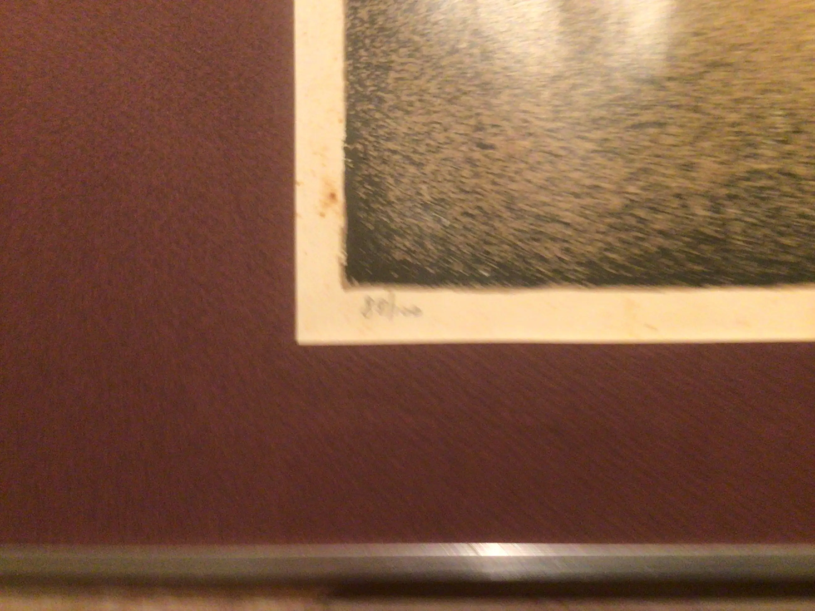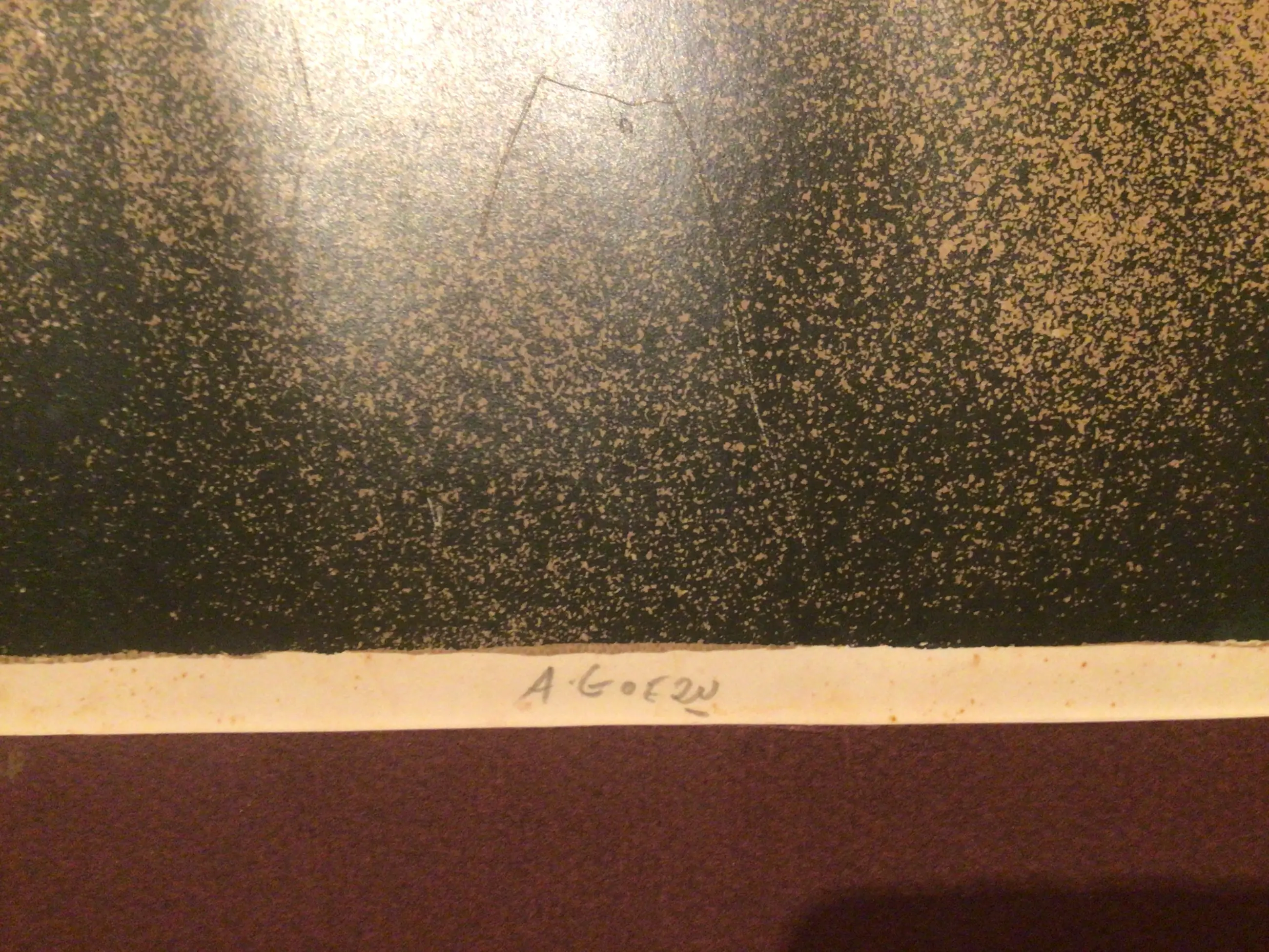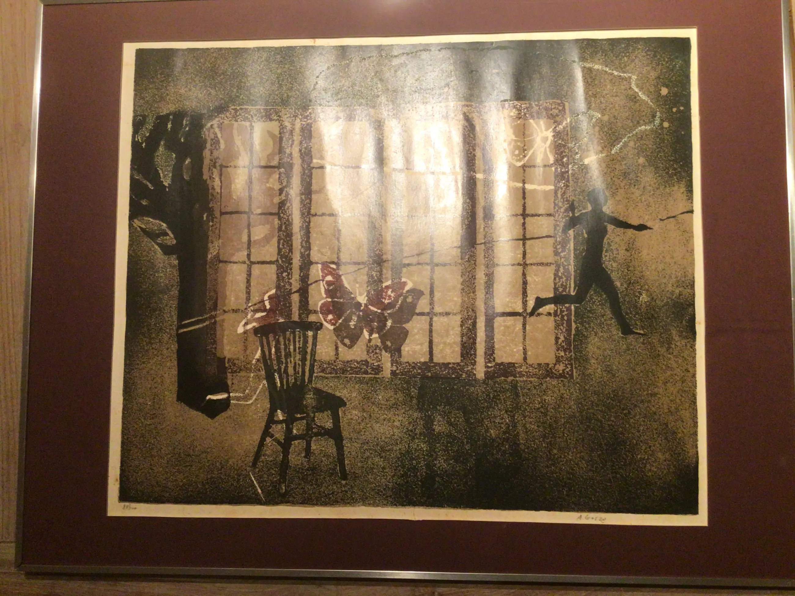 Dromerige, surrealistische kleurenlitho. Kunstwerk is ingelijst in kader met passé-partout, zonder glas.