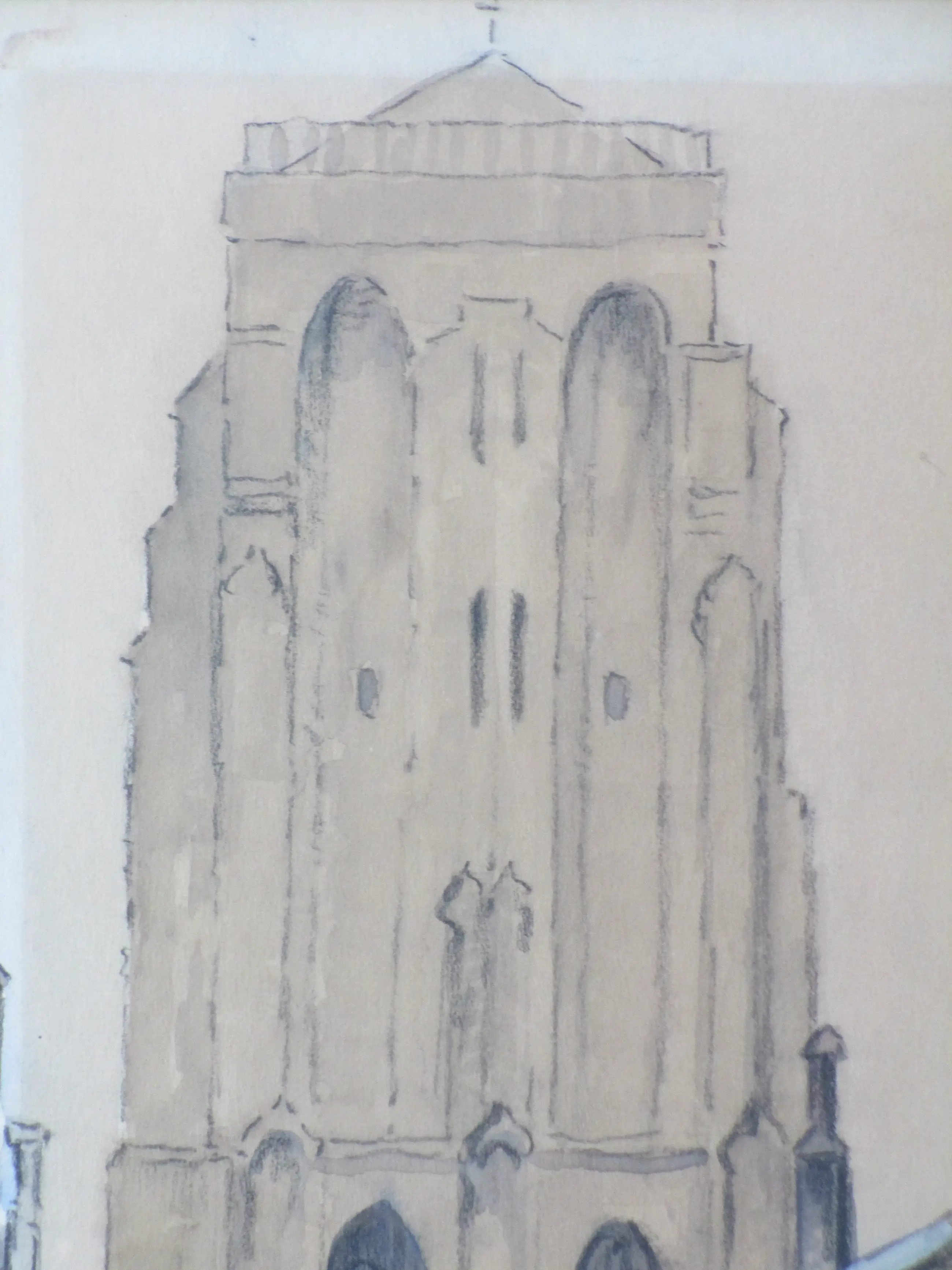 Aquarel door Andre Verhorst Voorstelling van een straatje in Zierikzee met de St Lievens Monstertoren op de achtergrond Gelijst, beeldmaat 35x21, lijstmaat 47x32 Gesigneerd r.o. Authenticiteit volledig gegarandeerd