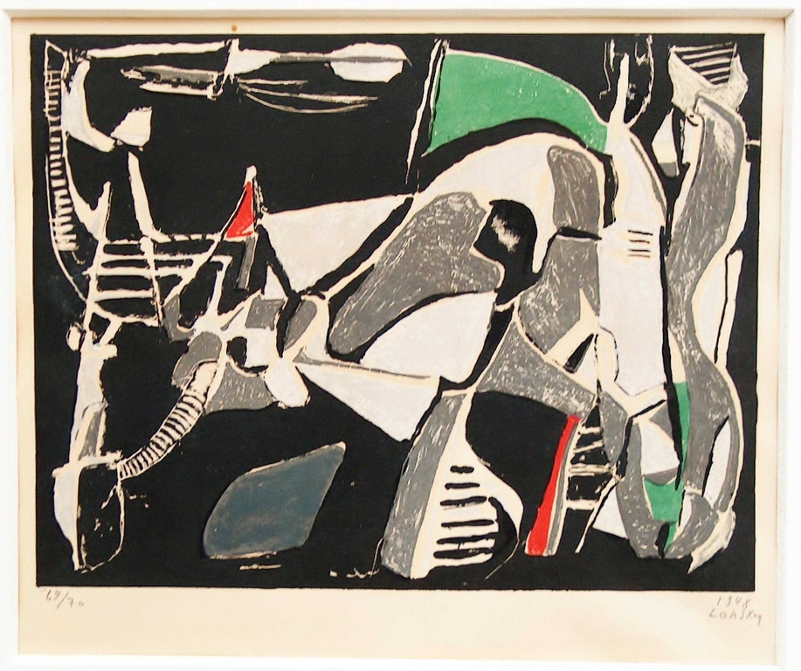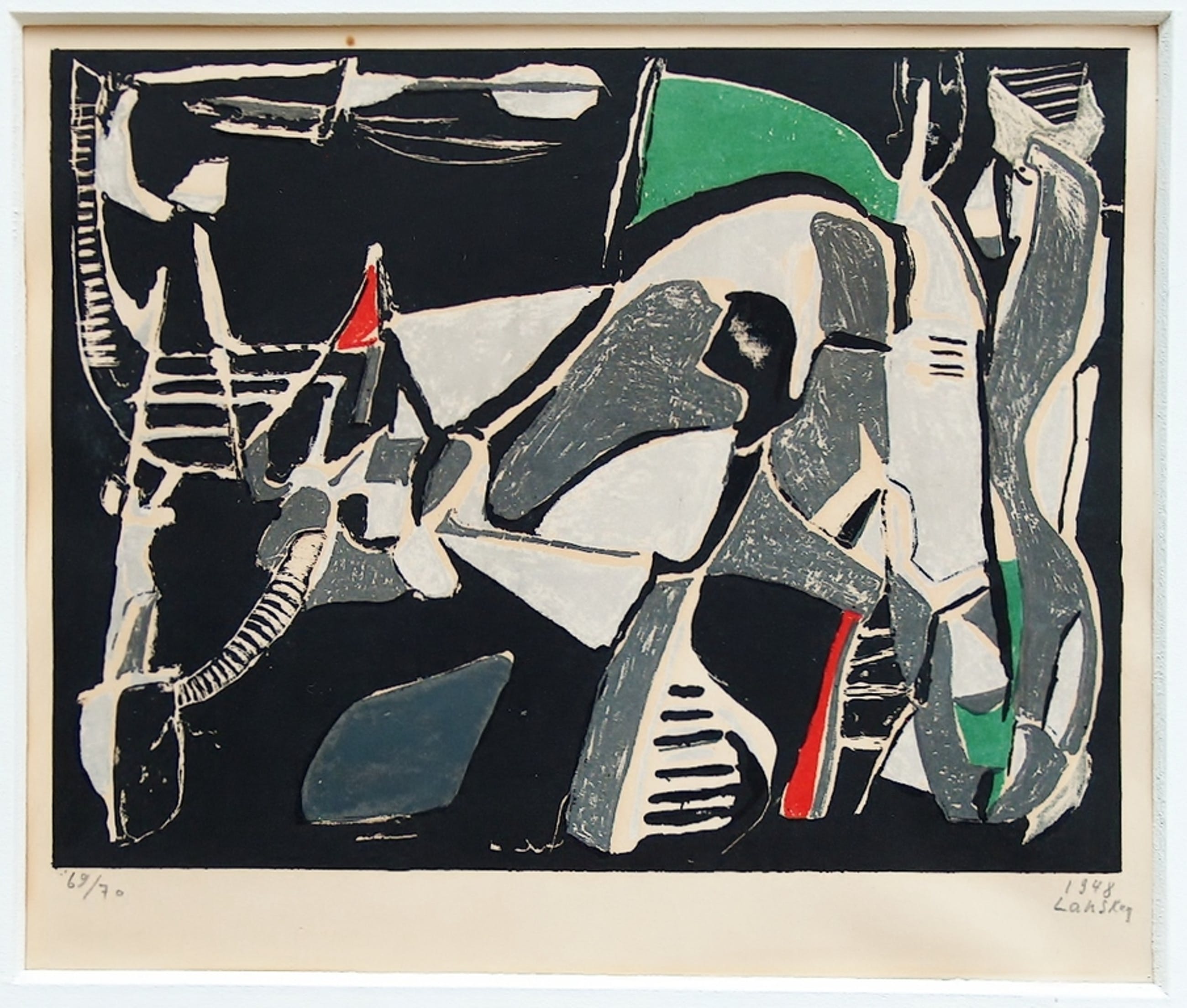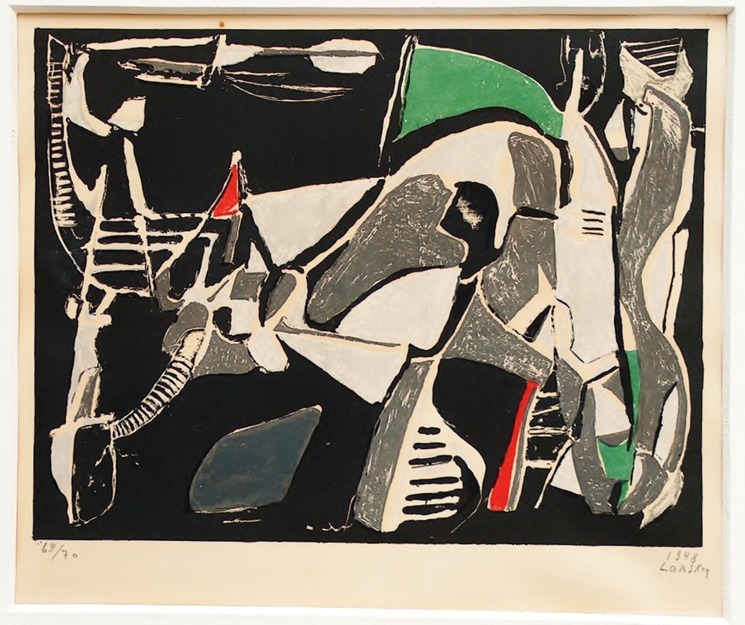 kleurenlitho, zonder titel (abstracte compositie), gesigneerd LANSKOY, genummerd 69 / 70 , gedateerd 1948