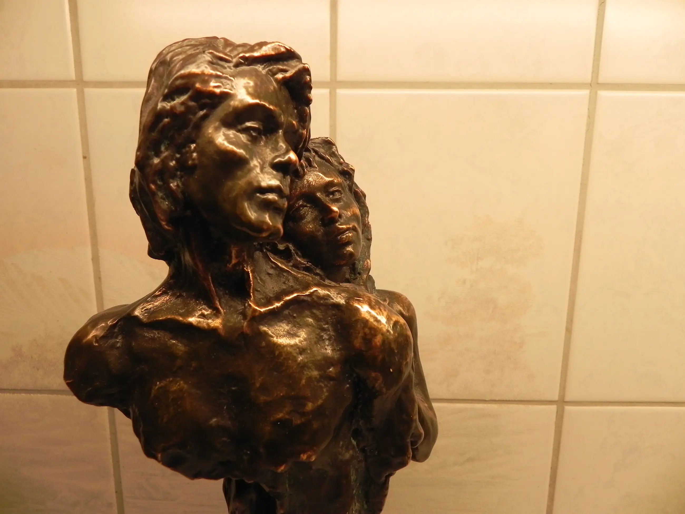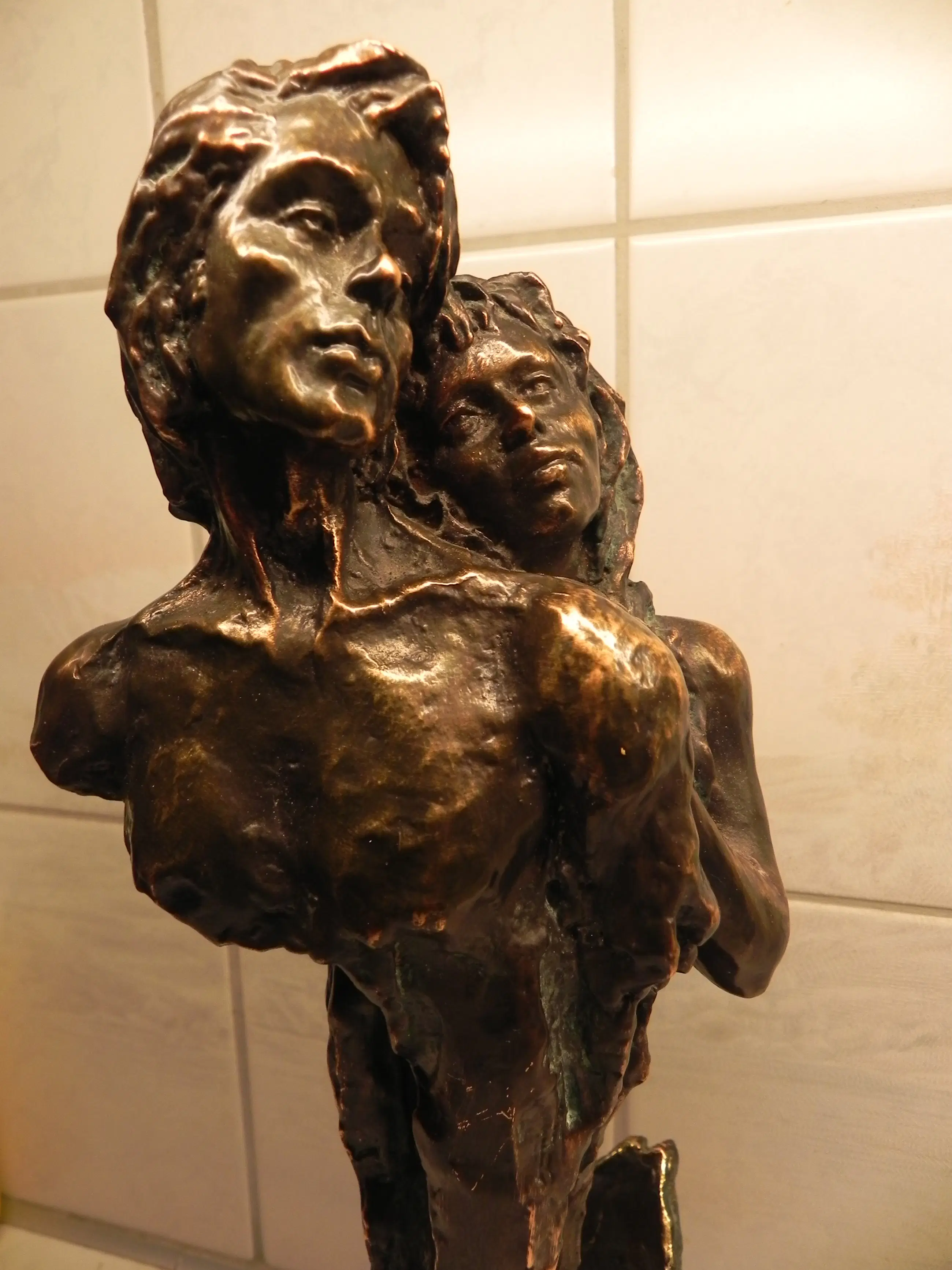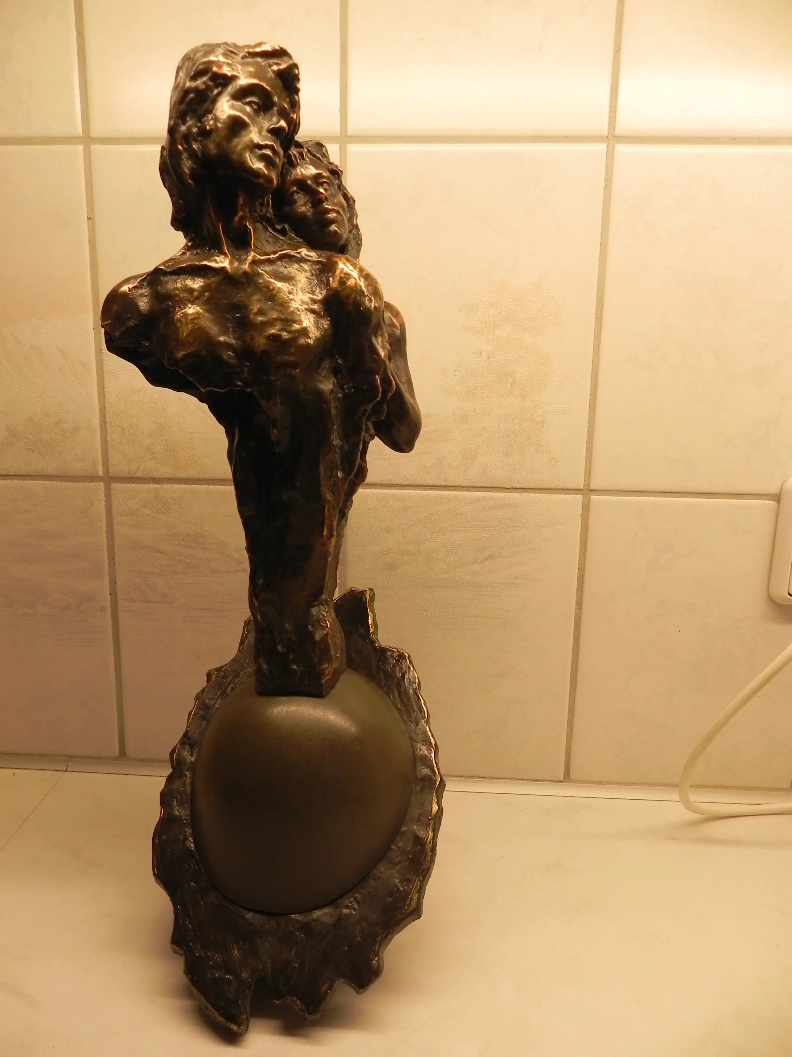 Mooi bronzen beeld van man en vrouw in romantische stijl. Staat op een bronzen vorm van een afgeknot ei. Ziet er heel mooi uit geen beschadigingen.