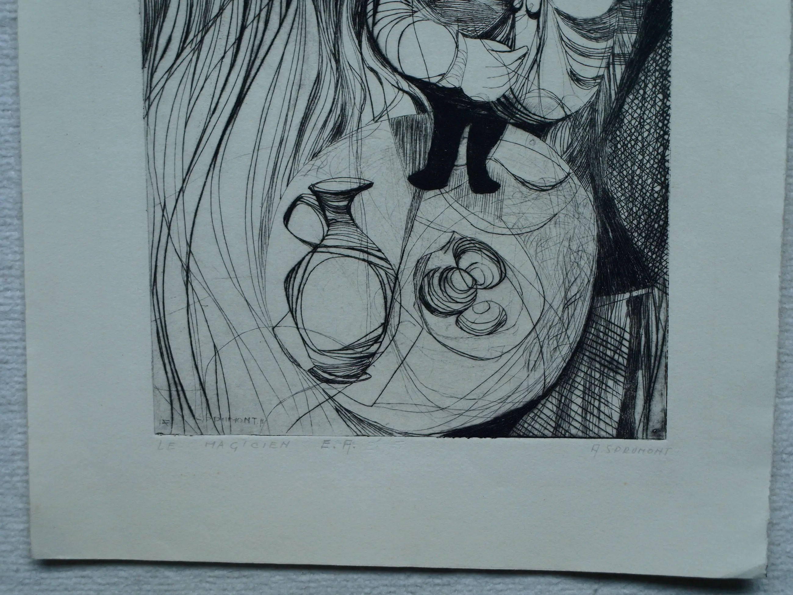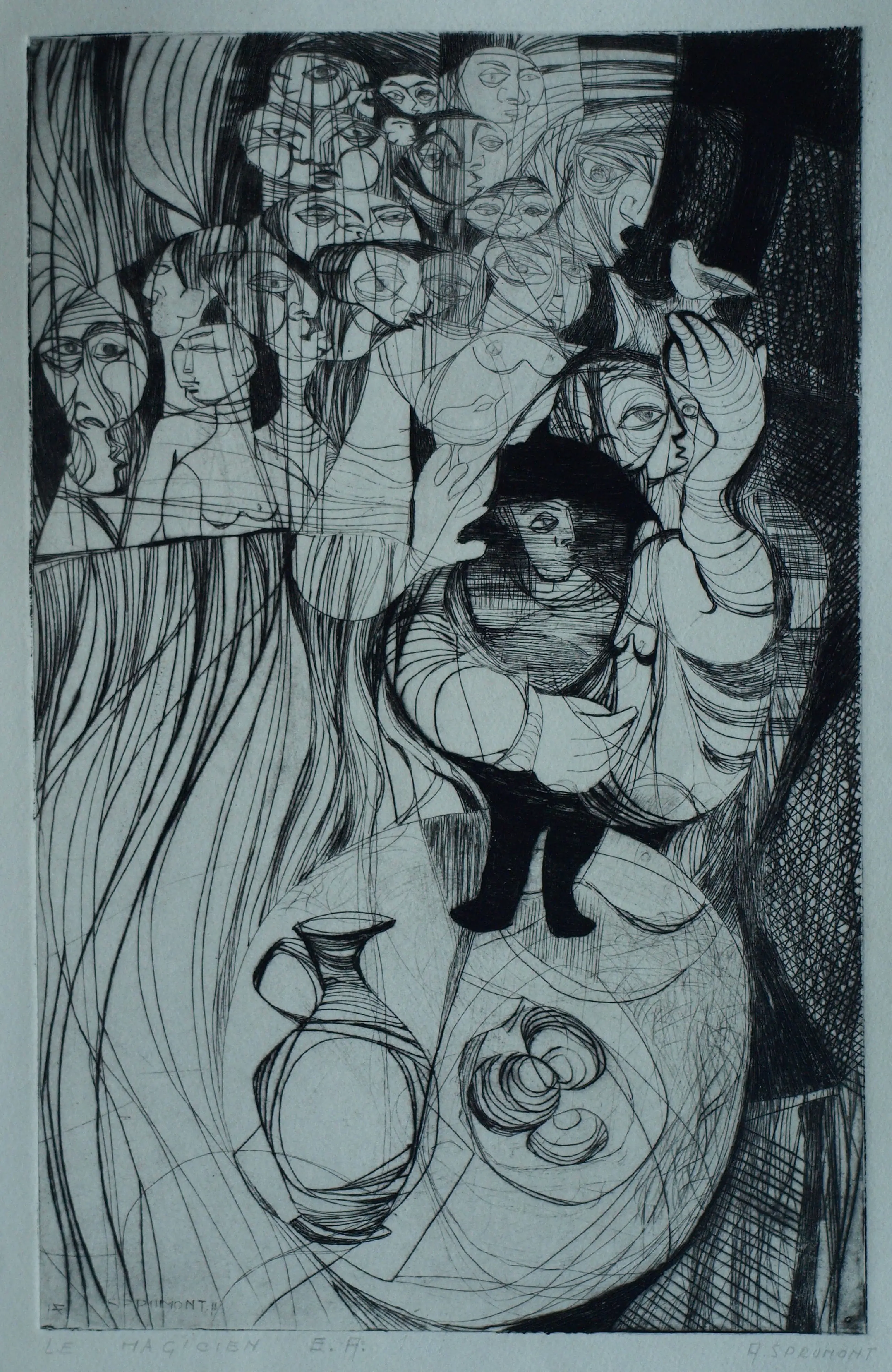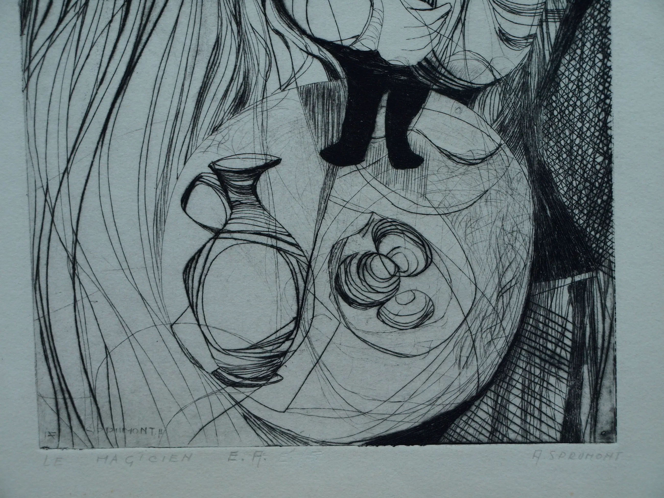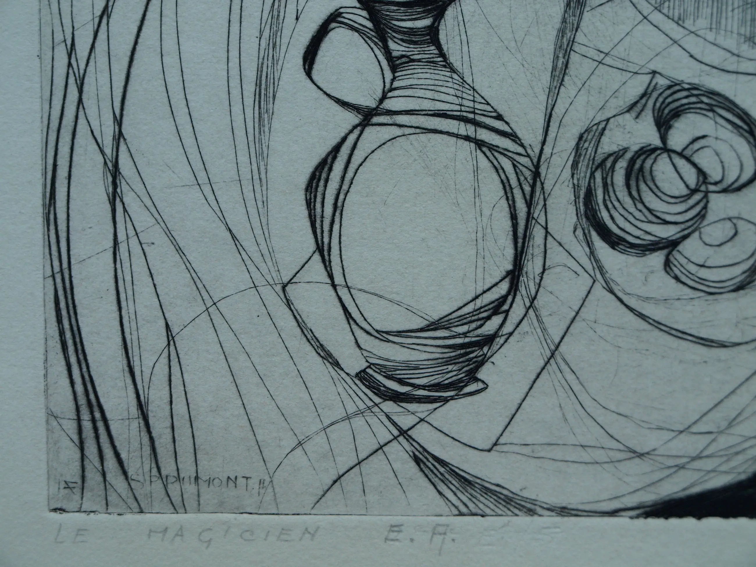 Een ets uit 1971 van de Belgische kunstenaar André Sprumont (1938), getiteld “Le Magicien”.