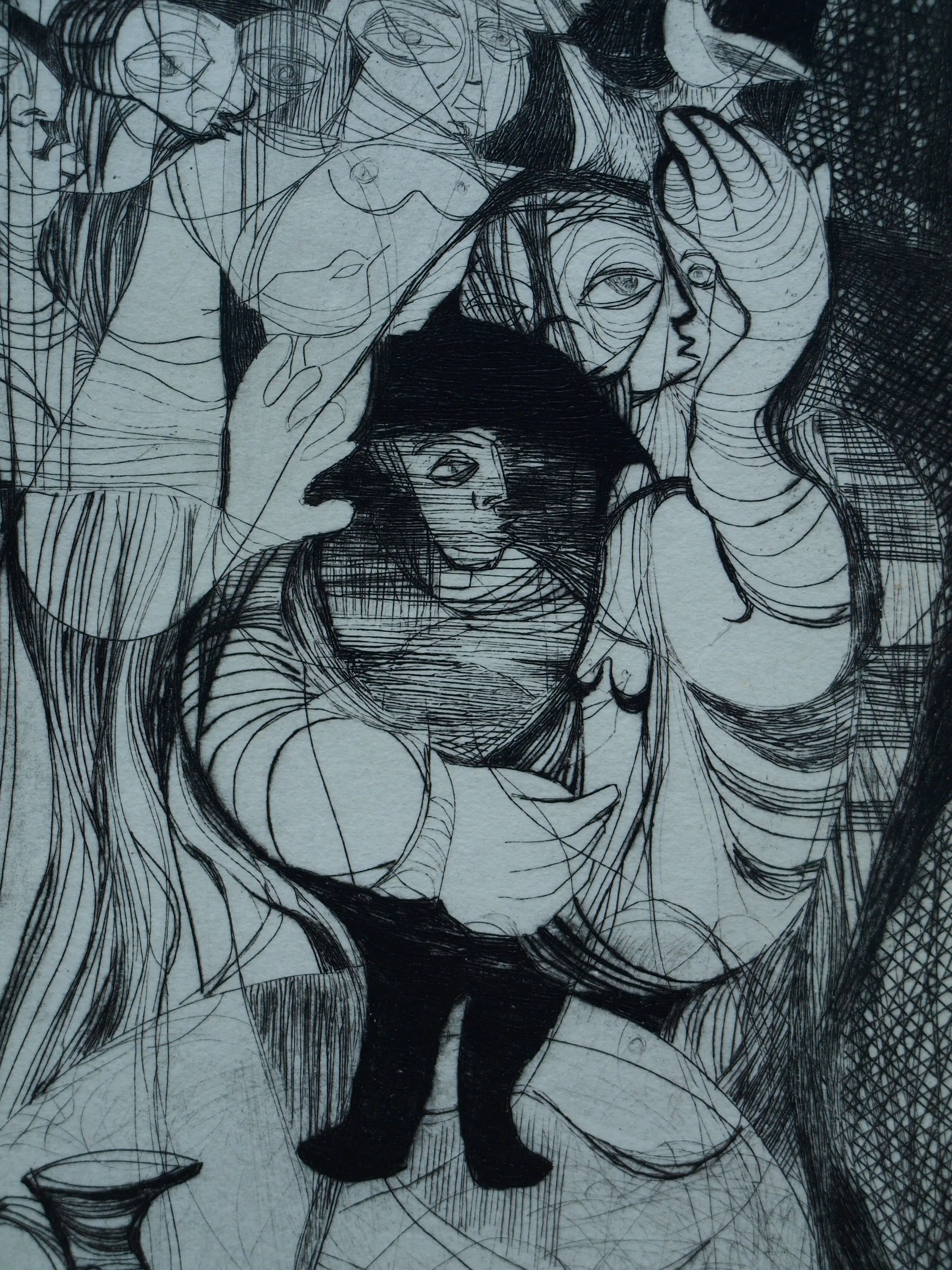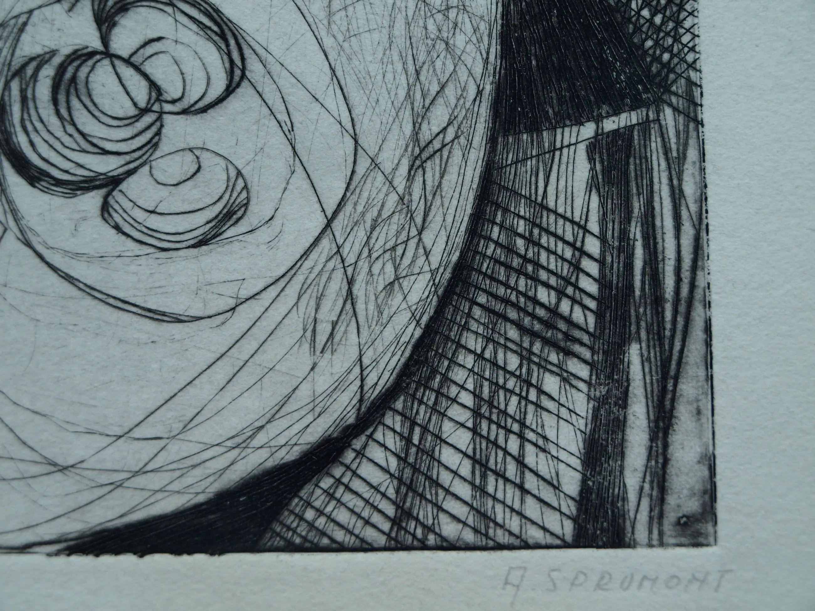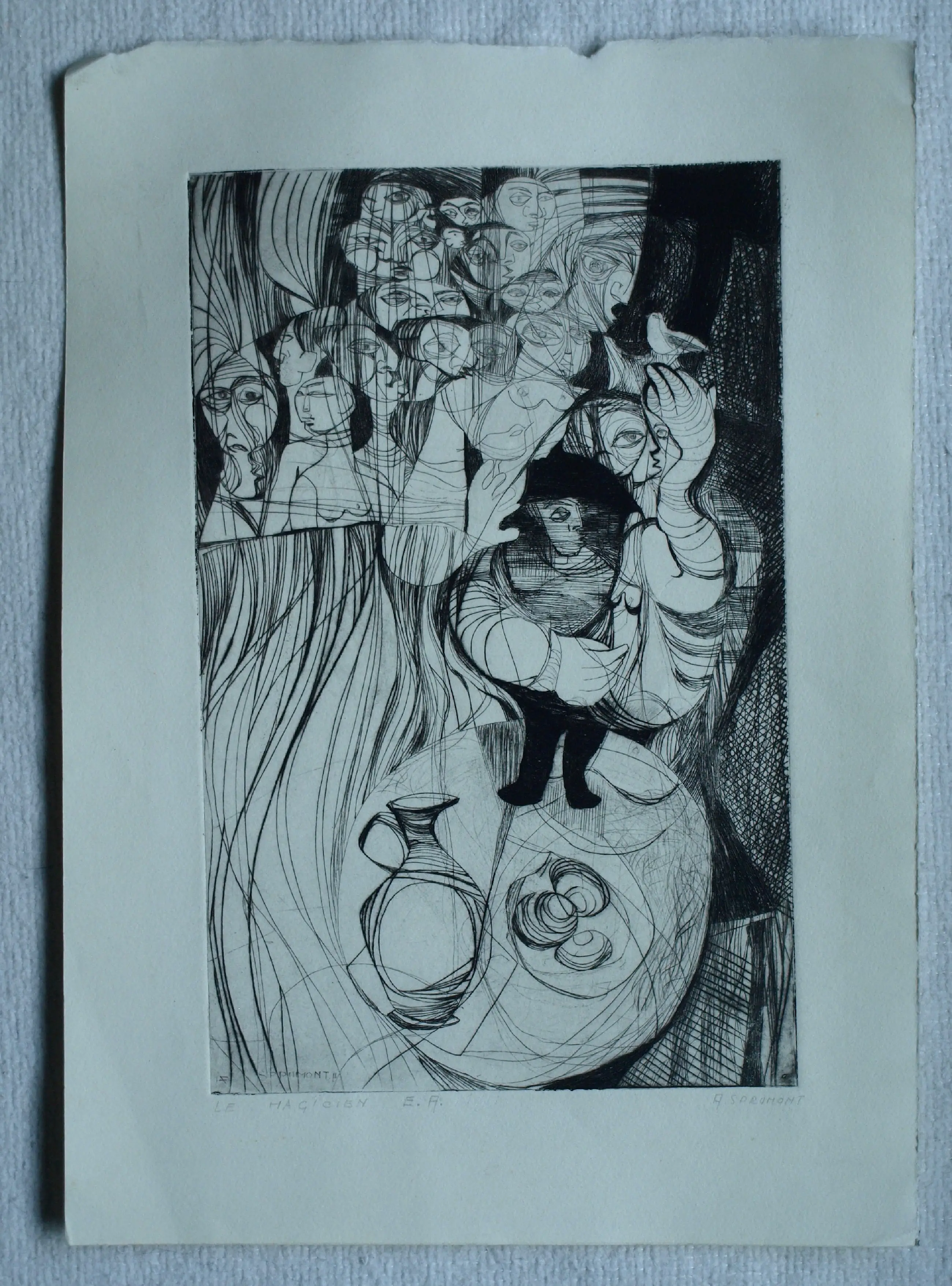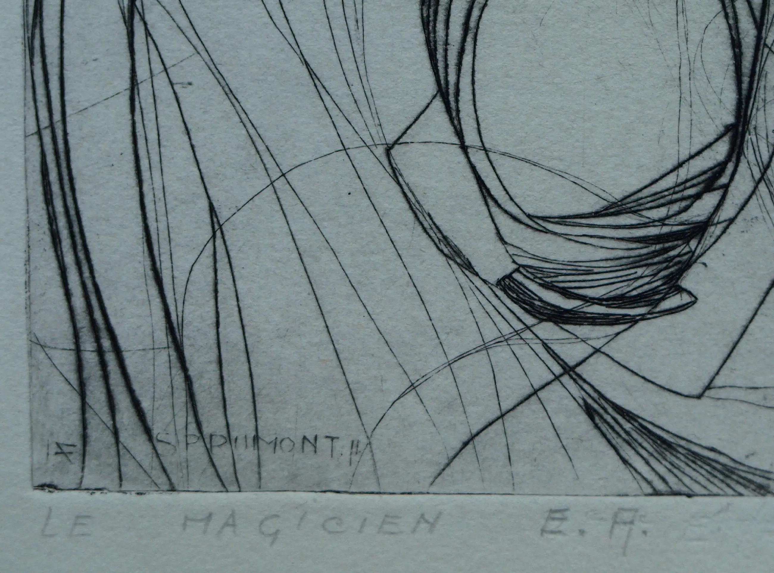 Een ets uit 1971 van de Belgische kunstenaar André Sprumont (1938), getiteld “Le Magicien”.