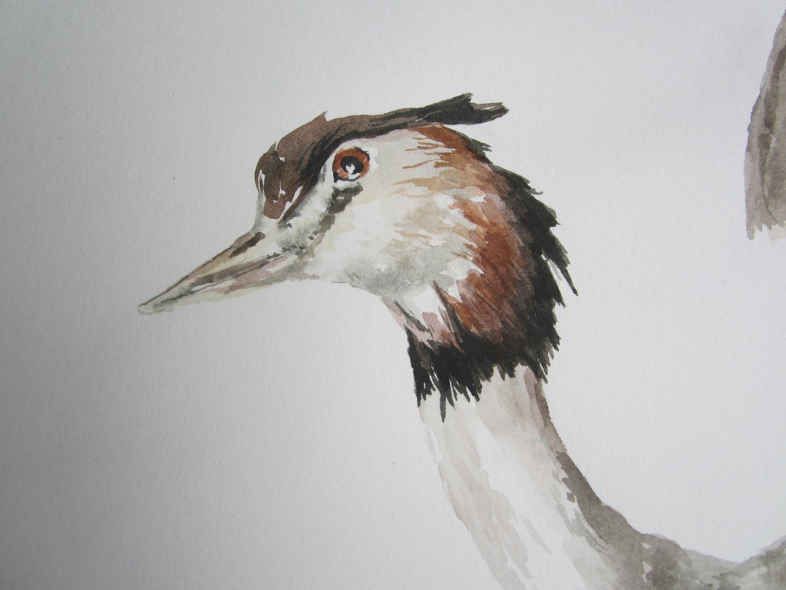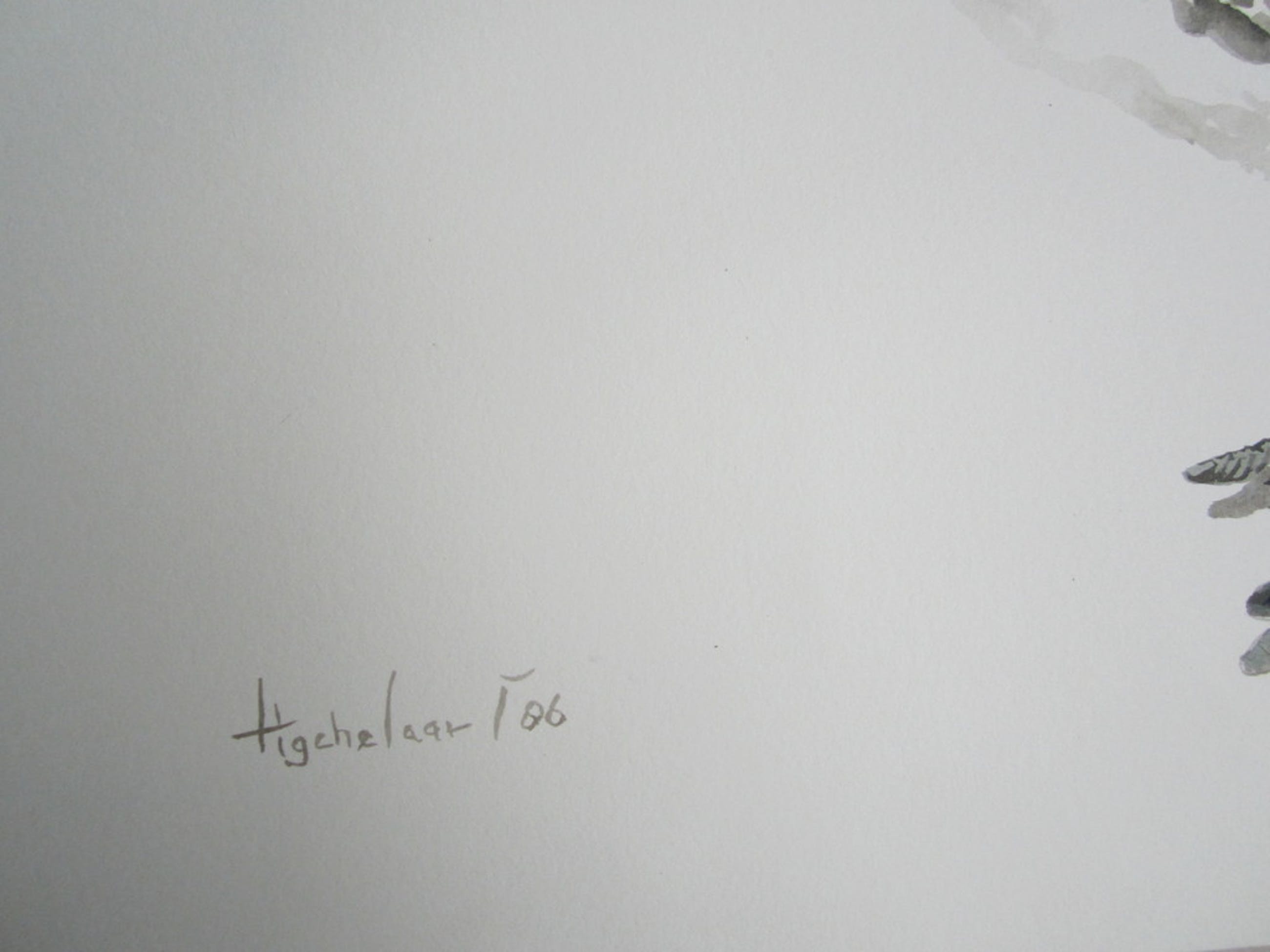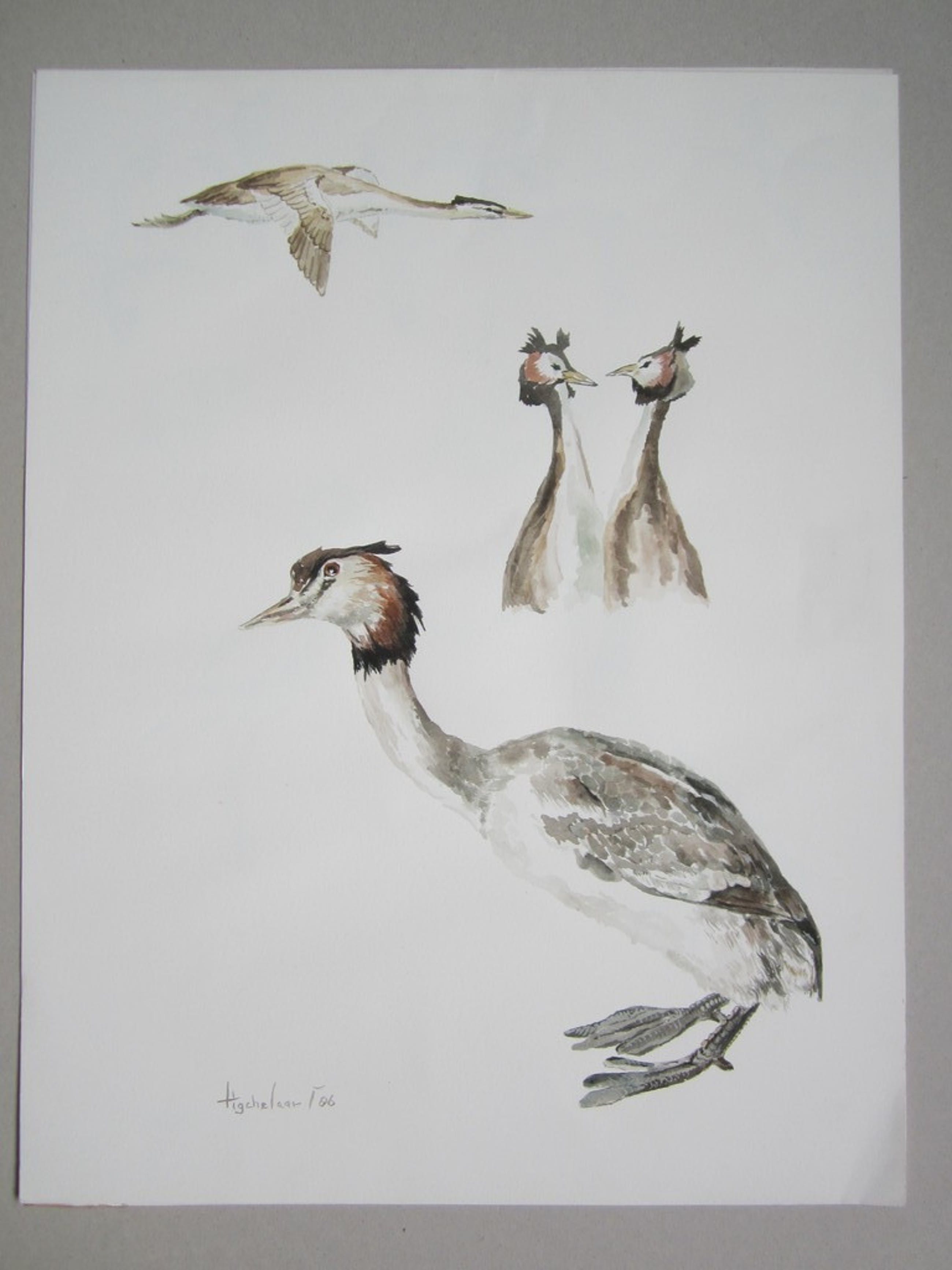 Prachtige aquarel van een fuut, waarbij ook het baltsgedrag van de vogel èn de houding in de vlucht is weergegeven. Deze aquarel is gemaakt door André Tigchelaar in 1986. De aquarel is linksonder gesigneerd en gedateerd. Het formaat is 50 x 65 cm; de aquarel is niet ingelijst.