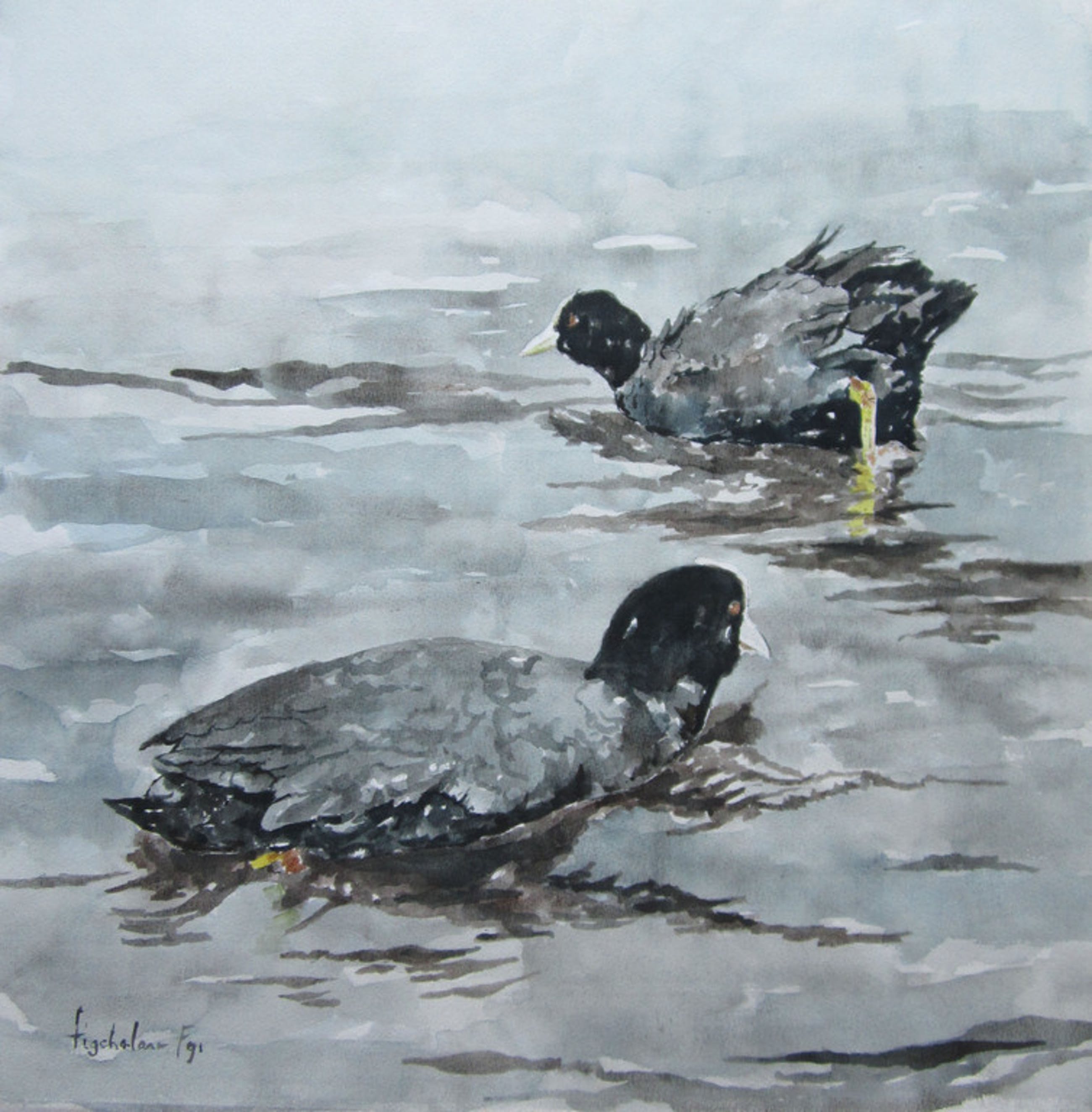 Mooie aquarel van 2 meerkoeten. De aquarel is gesigneerd en gedateerd linksonder, 1991. Het formaat is 50 x 50 cm. De aquarel is niet ingelijst.