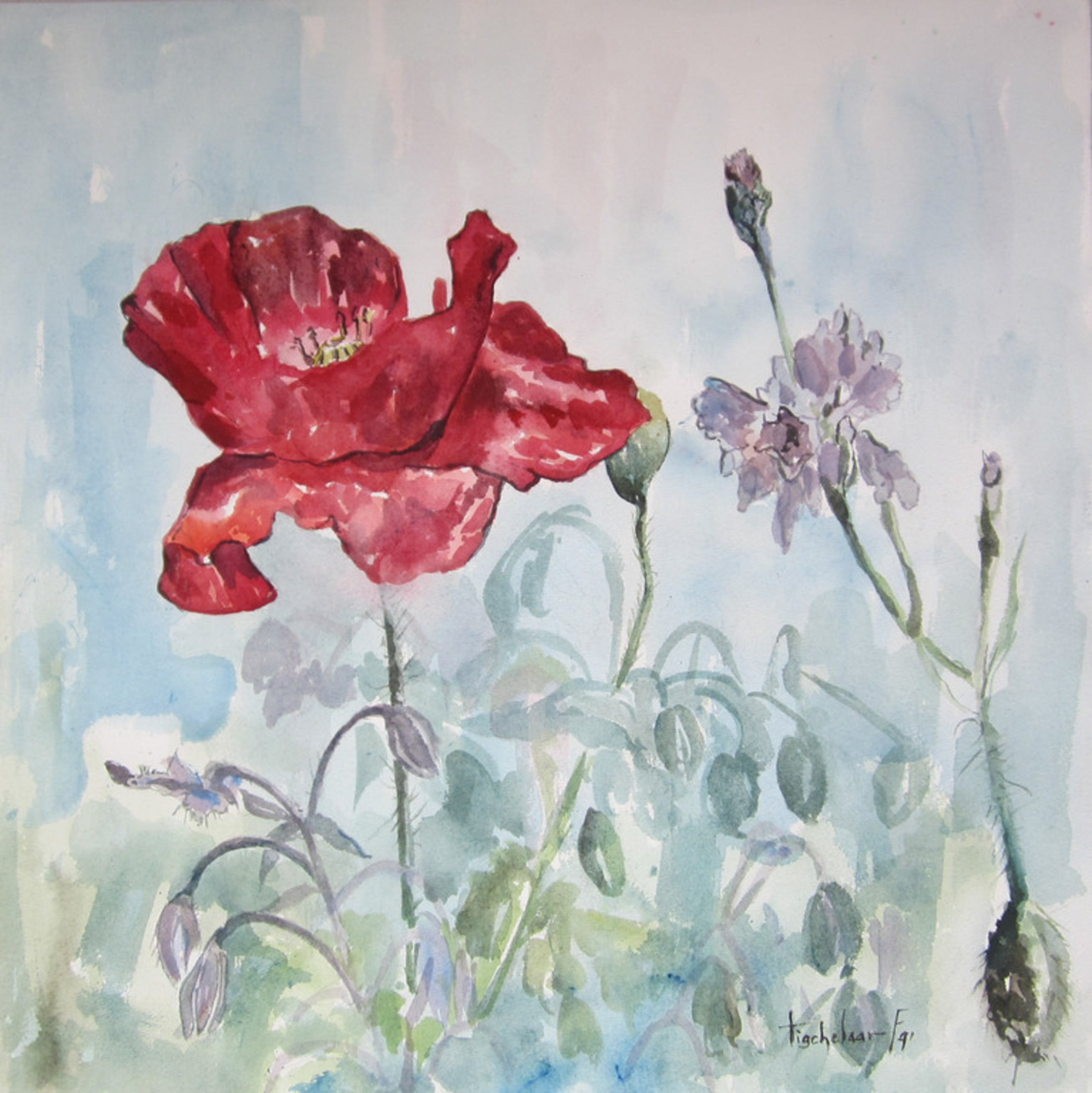 Fraaie aquarel van een papaver in volle glorie. Deze aquarel is door André Tigchelaar gemaakt in 1991 en is rechtsonder gesigneerd en gedateerd. Het formaat van de aquarel is 50x50 cm; het werk is niet ingelijst.