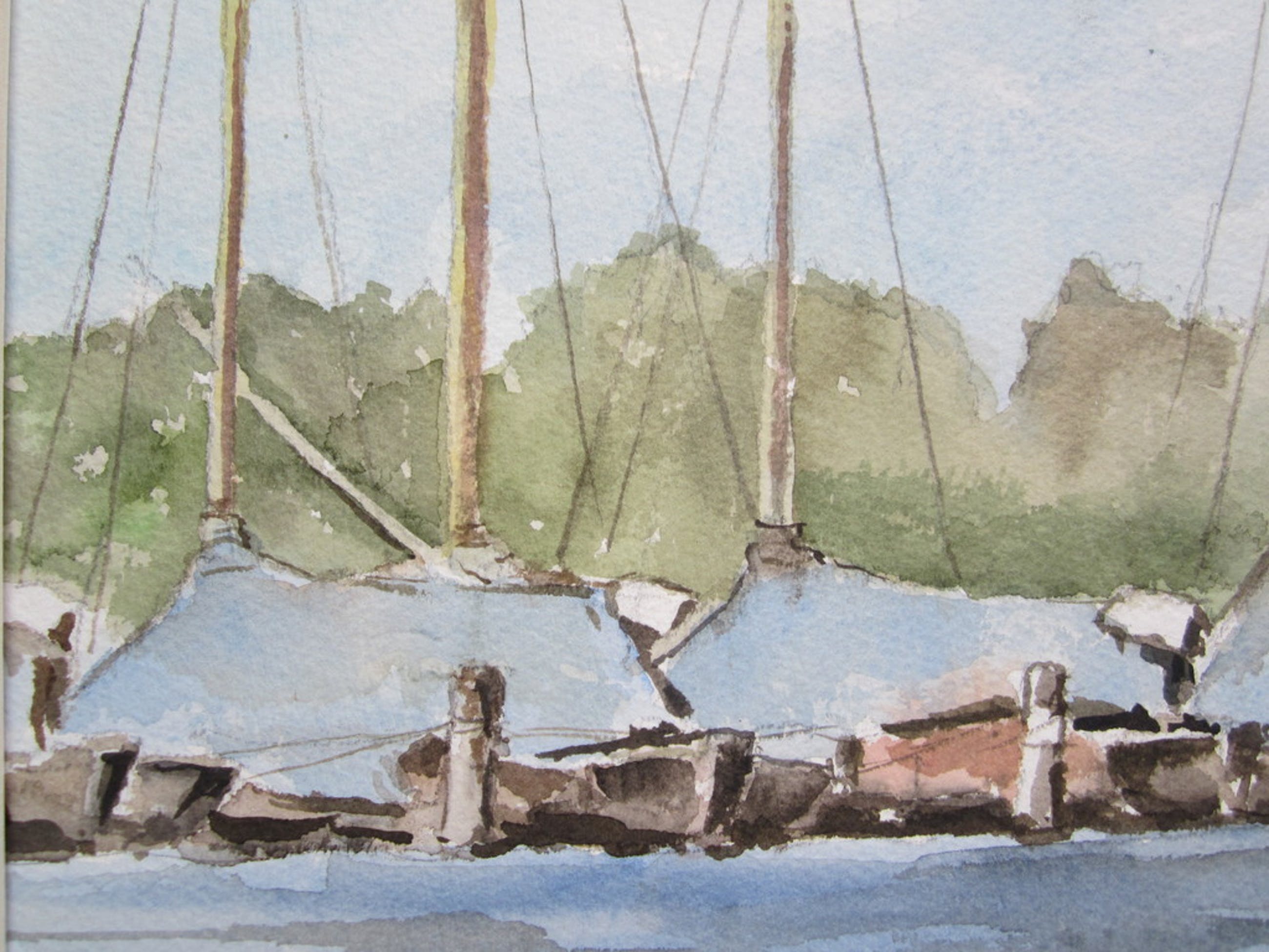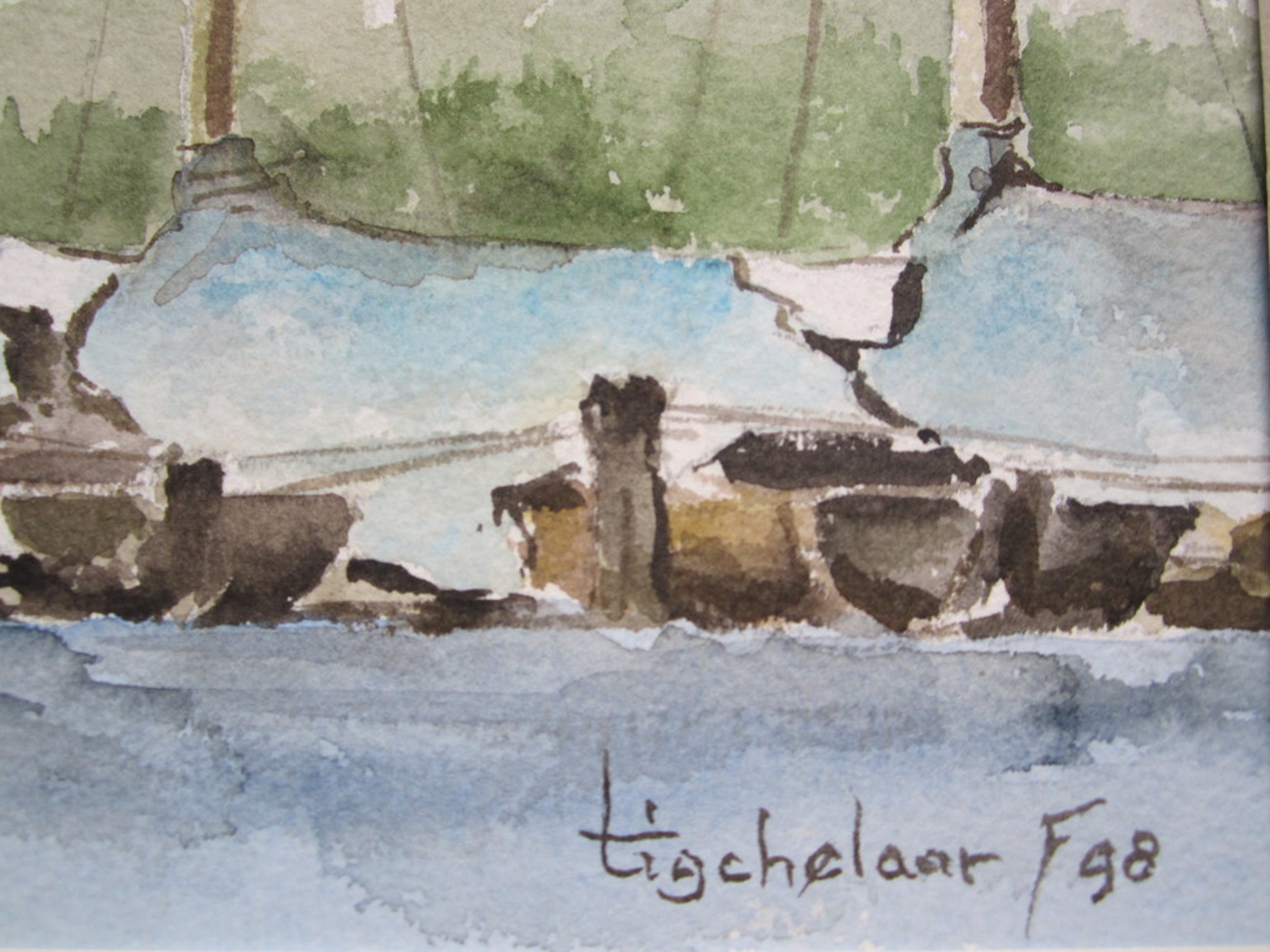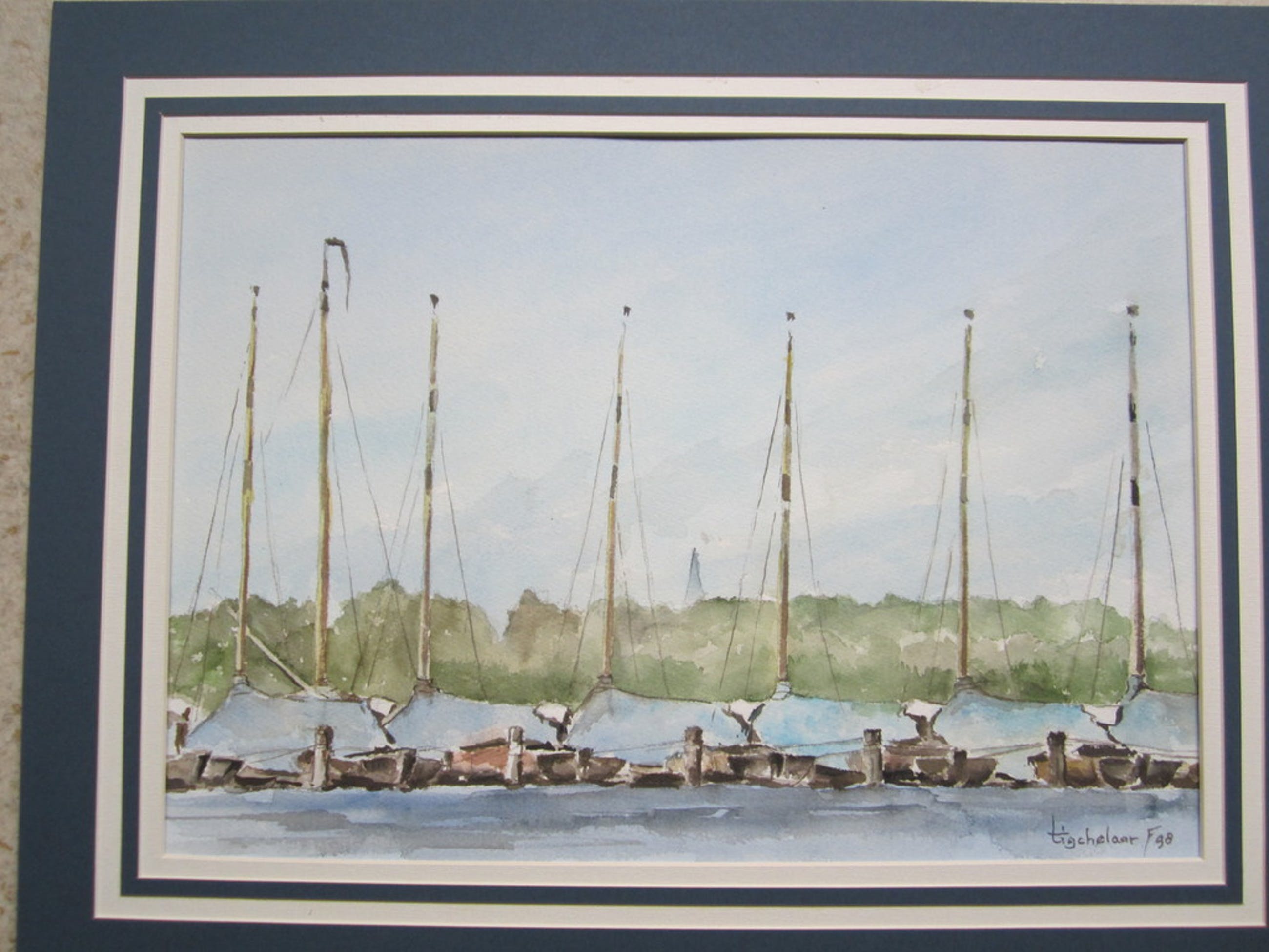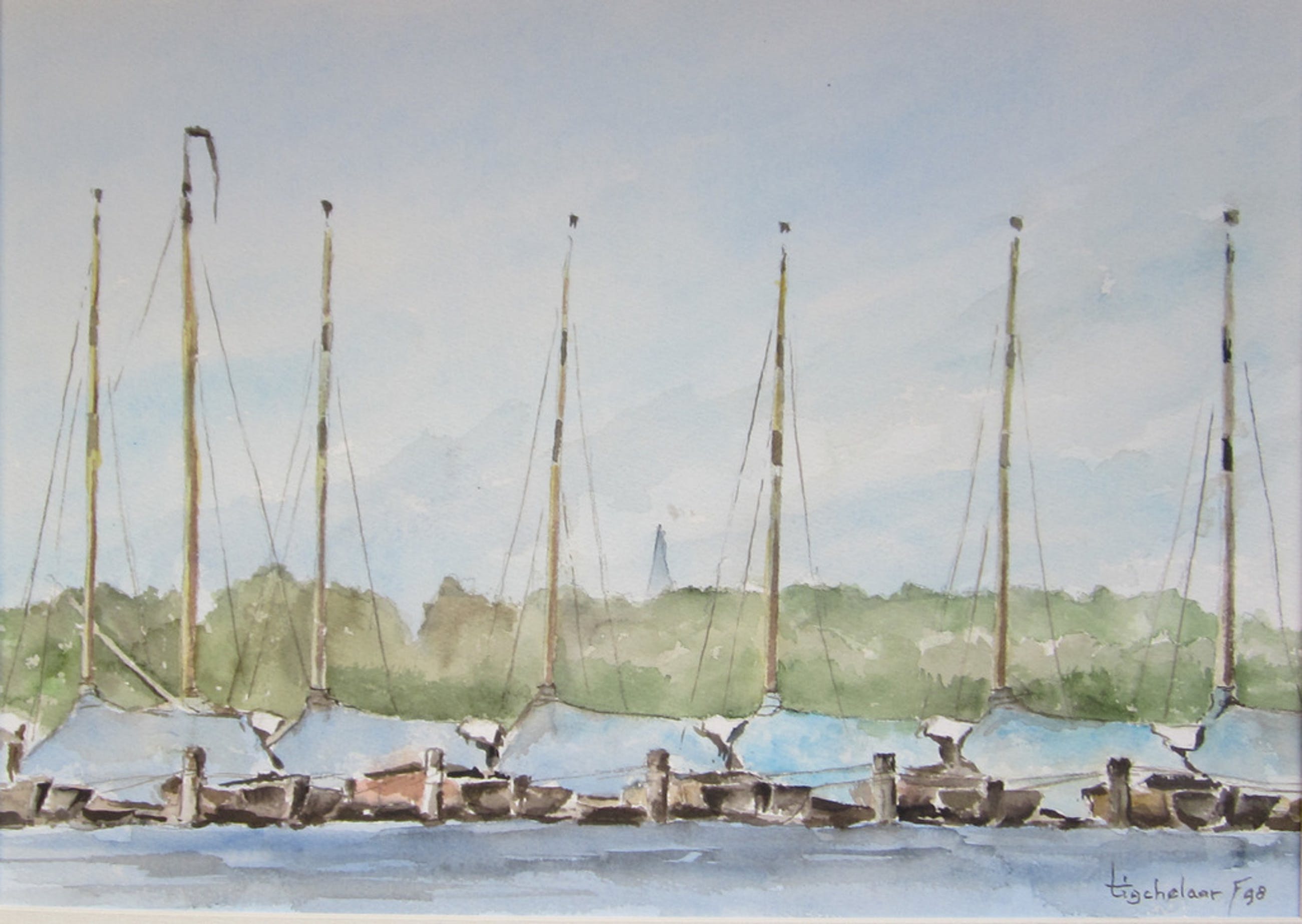 Op deze aquarel liggen de zeilboten te wachten op hun schipper. Deze aquarel van André Tigchelaar is rechtsonder gesigneerd en gedateerd, 1998. Het beeldformaat is 50x35,5 cm; in passe-partout is de aquarel 65x50 cm. De aquarel is niet ingelijst.
