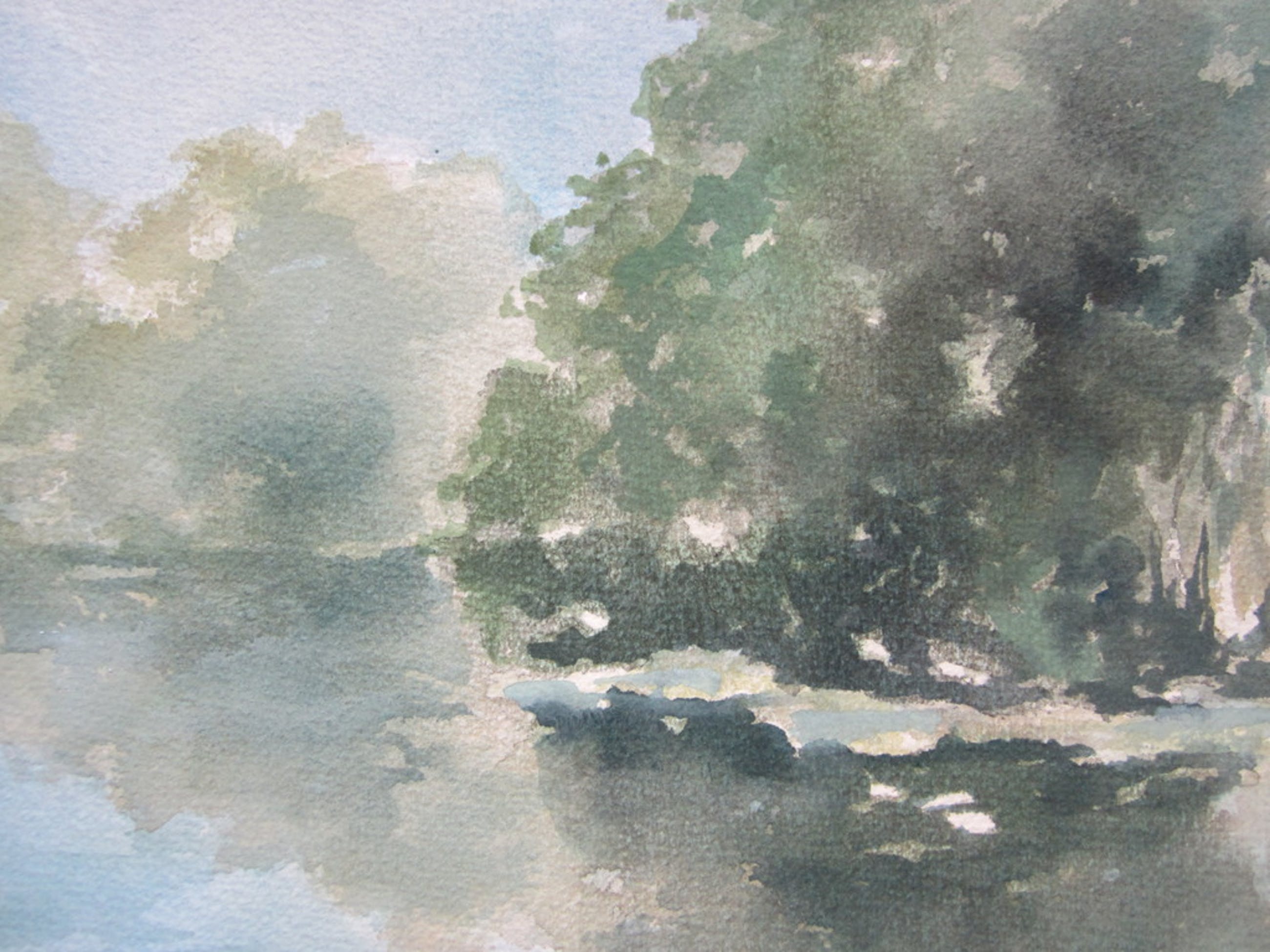Deze aquarel toont een zomers Hollands landschap, waar de warmte als het ware boven het water hangt. Deze aquarel van André Tigchelaar is linksonder gesigneerd en gedateerd, 1986. Het beeldformaat is 50,5x36 cm; in passe-partout is de aquarel 65x50 cm. De aquarel is niet ingelijst.