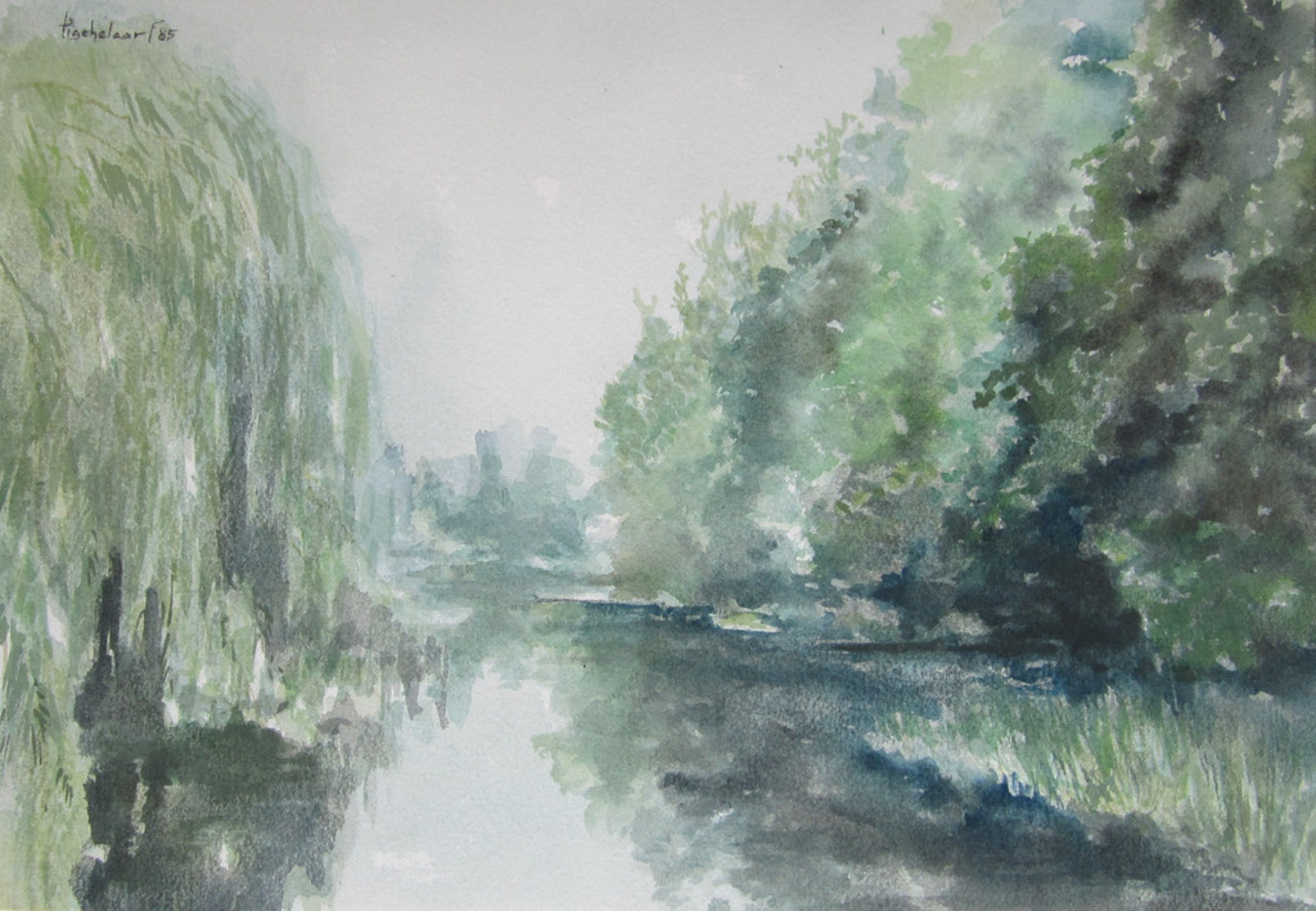 Mooie aquarel van een typisch Hollands landschap met water en veel groen. Deze aquarel is gemaakt door André Tigchelaar in 1985 en is linksboven gesigneerd en gedateerd. Het beeldformaat is 48,5 x 33,5 cm; in passe-partout is het formaat 65 x 50 cm. Het passe-partout is wat verkleurd. De aquarel is niet ingelijst.